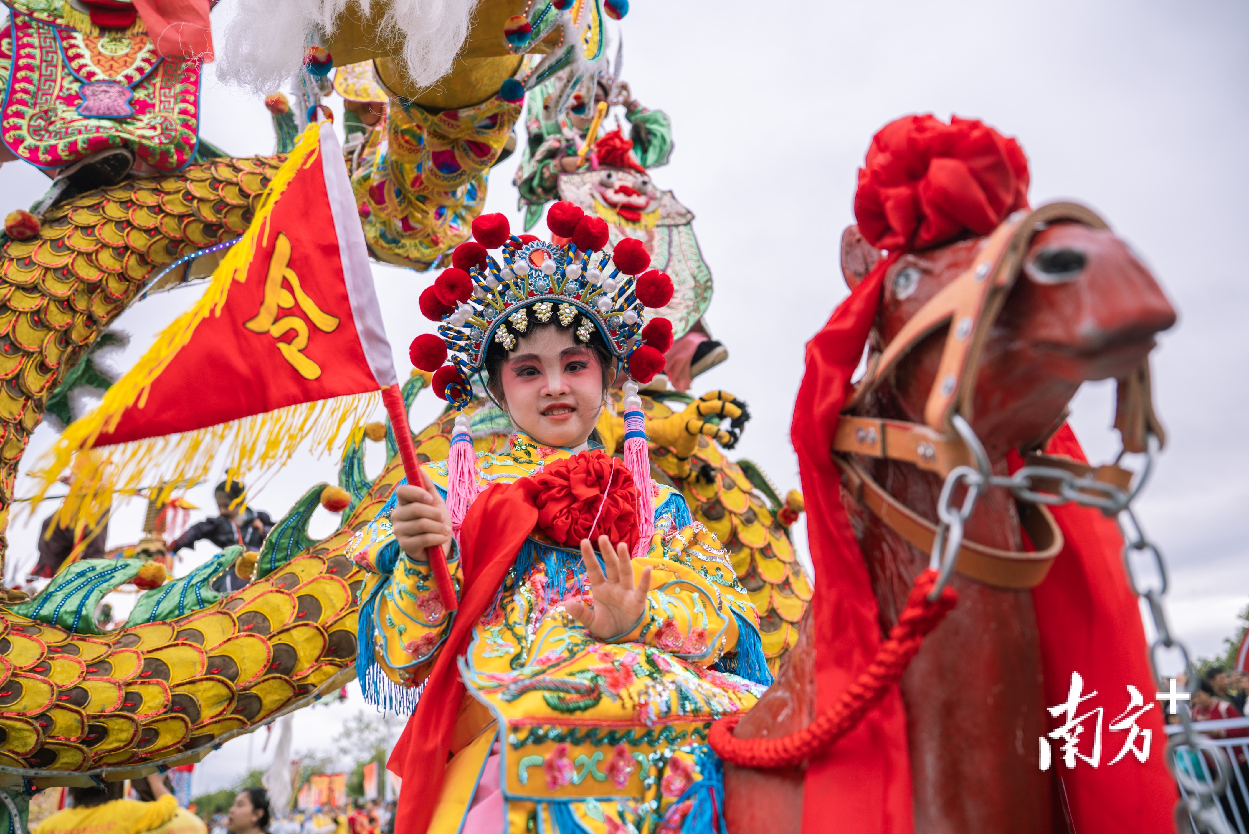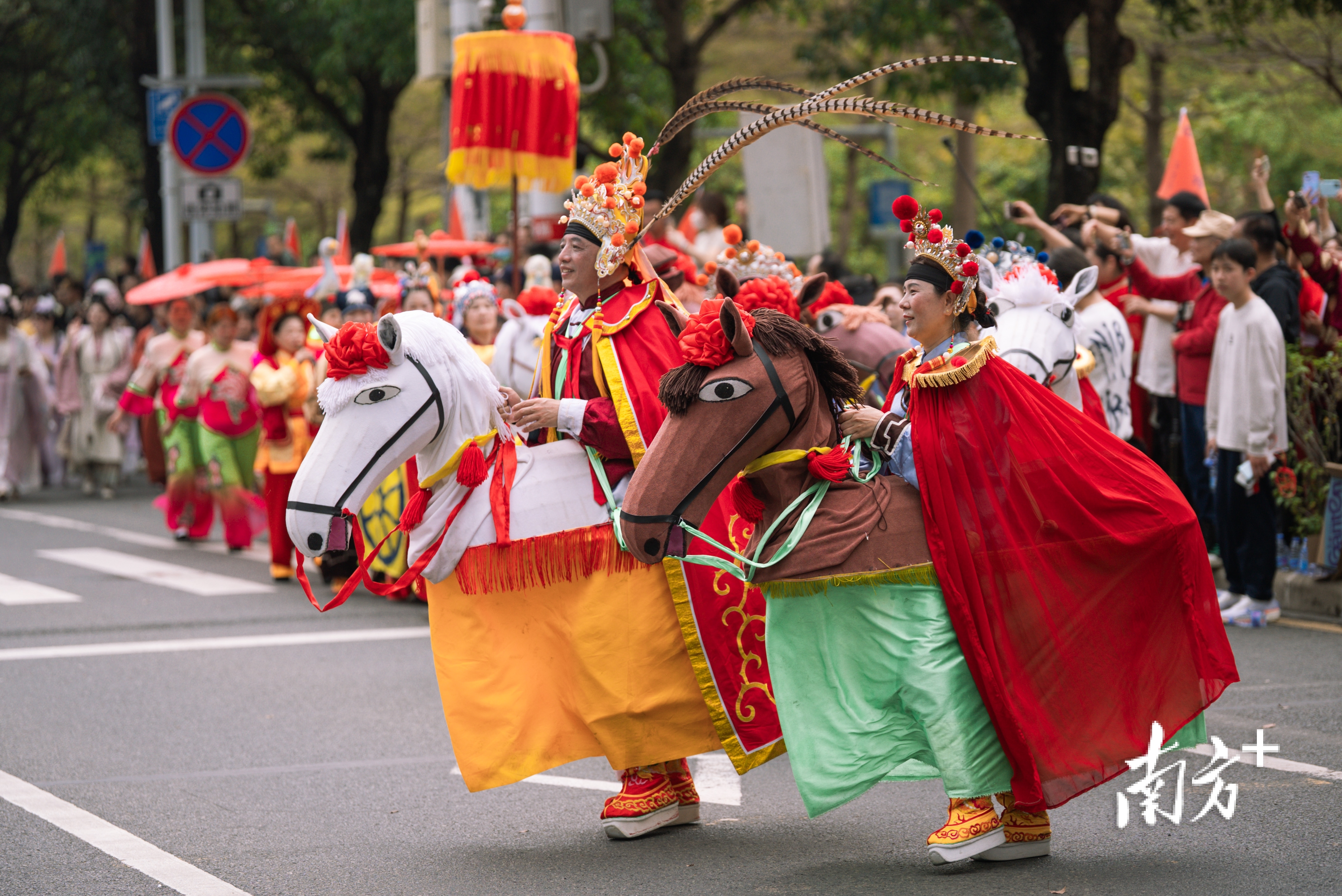 今年是丙午马年,“马”成为巡游主线。大亚湾霞涌渔民布马舞率先登场,舞者腰系竹篾彩布红马,踏鼓点走马,模拟骏马奔腾。河源龙川马灯舞将民间故事角色与客家山歌融合表演,边舞边唱,演绎五谷丰登和邻里和睦。梅州五华竹马舞则以“人动马随”的队形,营造欢乐场景,现场观众阵阵喝彩。