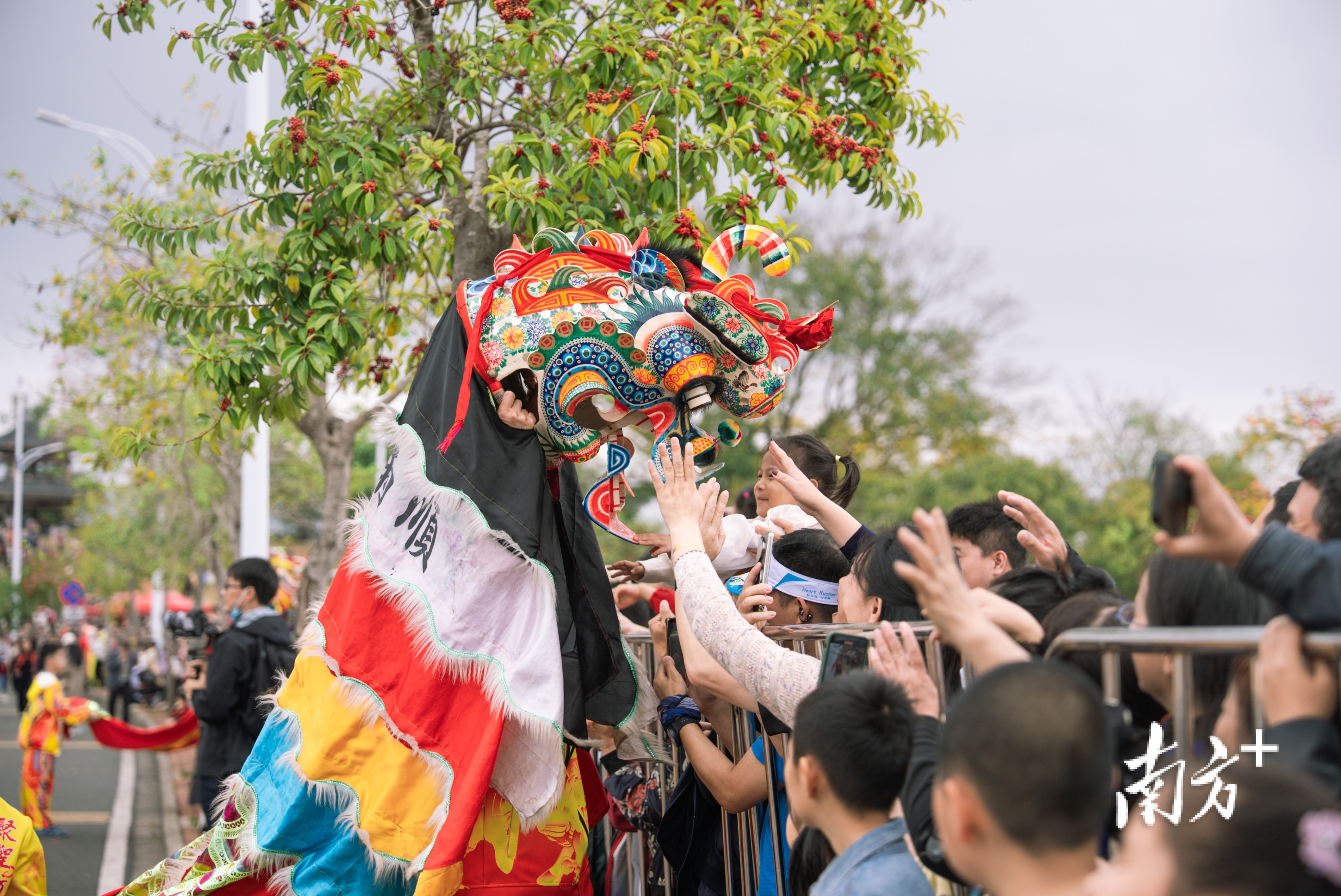 巡游由惠东盖子狮领衔开场。20头盖子狮与高桩狮整齐排列,鼓点密集,动作协调。高桩南狮《步步生花》随后登场,醒狮在梅花桩上腾挪闪扑、步步登高,武术功底与杂技技巧完美融合。