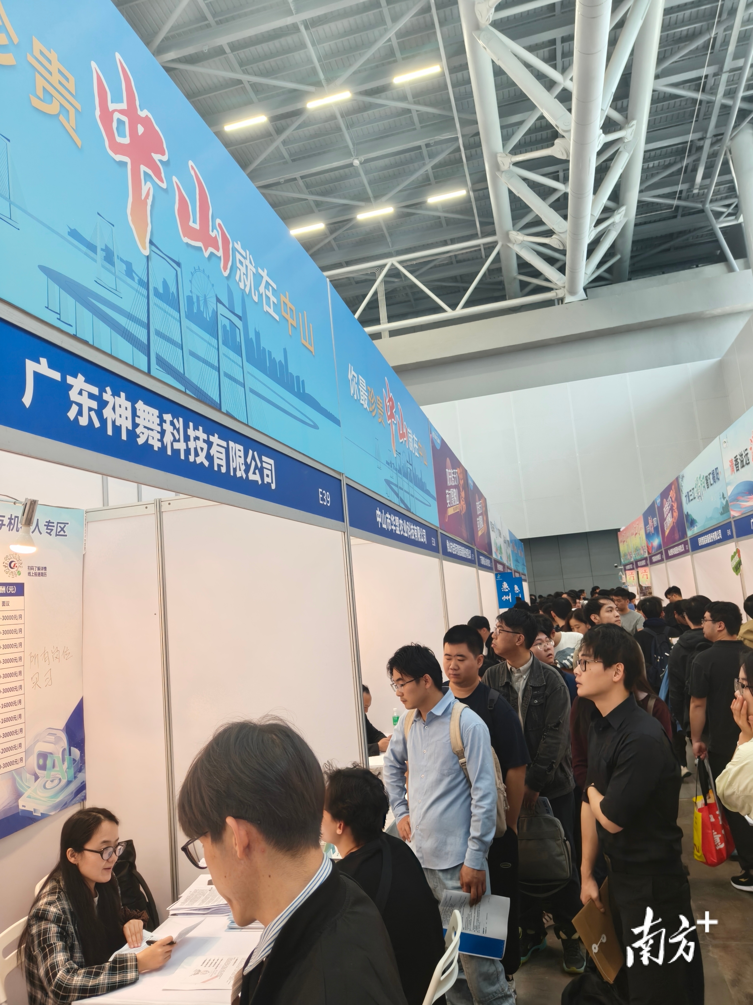 一年前,同样在广交会展馆,广东“百万英才汇南粤”春季大型招聘会上,神舞科技公司创始人兼CEO郑辉就在短短3个小时内,与一名清华大学仪器科学与技术博士现场签约。那天下午,该名博士就跟着团队来到中山实地参观企业。