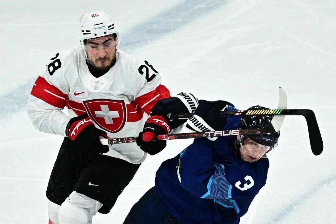 ▲2026年2月18日,在米兰-科尔蒂纳冬奥会冰球项目男子四分之一决赛瑞士队和芬兰队的比赛中,瑞士队球员蒂莫·梅尔(左)和芬兰队球员奥利·梅泰打架 图/视觉中国