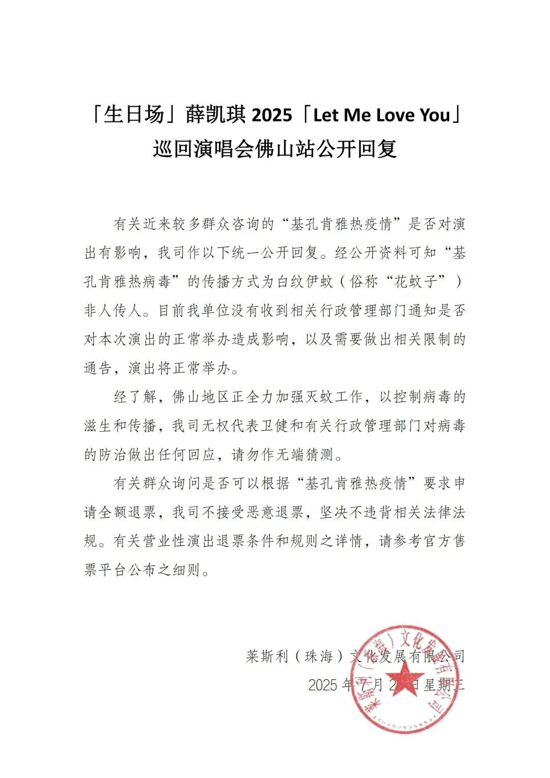 基孔肯雅热疫情引发部分购票观众担忧。7月23日,演唱会主办方莱斯利(珠海)文化发展有限公司在社交平台发布了关于薛凯琪巡回演唱会佛山站的公开回复,称“目前我单位没有收到相关行政管理部门通知是否对本次演出的正常举办造成影响,以及需要做出相关限制的通告,演出将正常举办。”