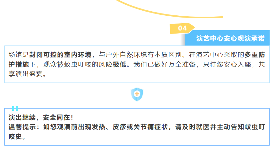 “场馆是封闭可控的室内环境,与户外自然环境有本质区别。在演艺中心采取的多重防护措施下,观众被蚊虫叮咬的风险极低。我们已做好万全准备,只待您安心入座,共享演出盛宴。”佛山国际体育文化演艺中心发出安心观演承诺,“演出继续,安全同在!温馨提示:如您观演前出现发热、皮疹或关节痛症状,请及时就医并主动告知蚊虫叮咬史。”