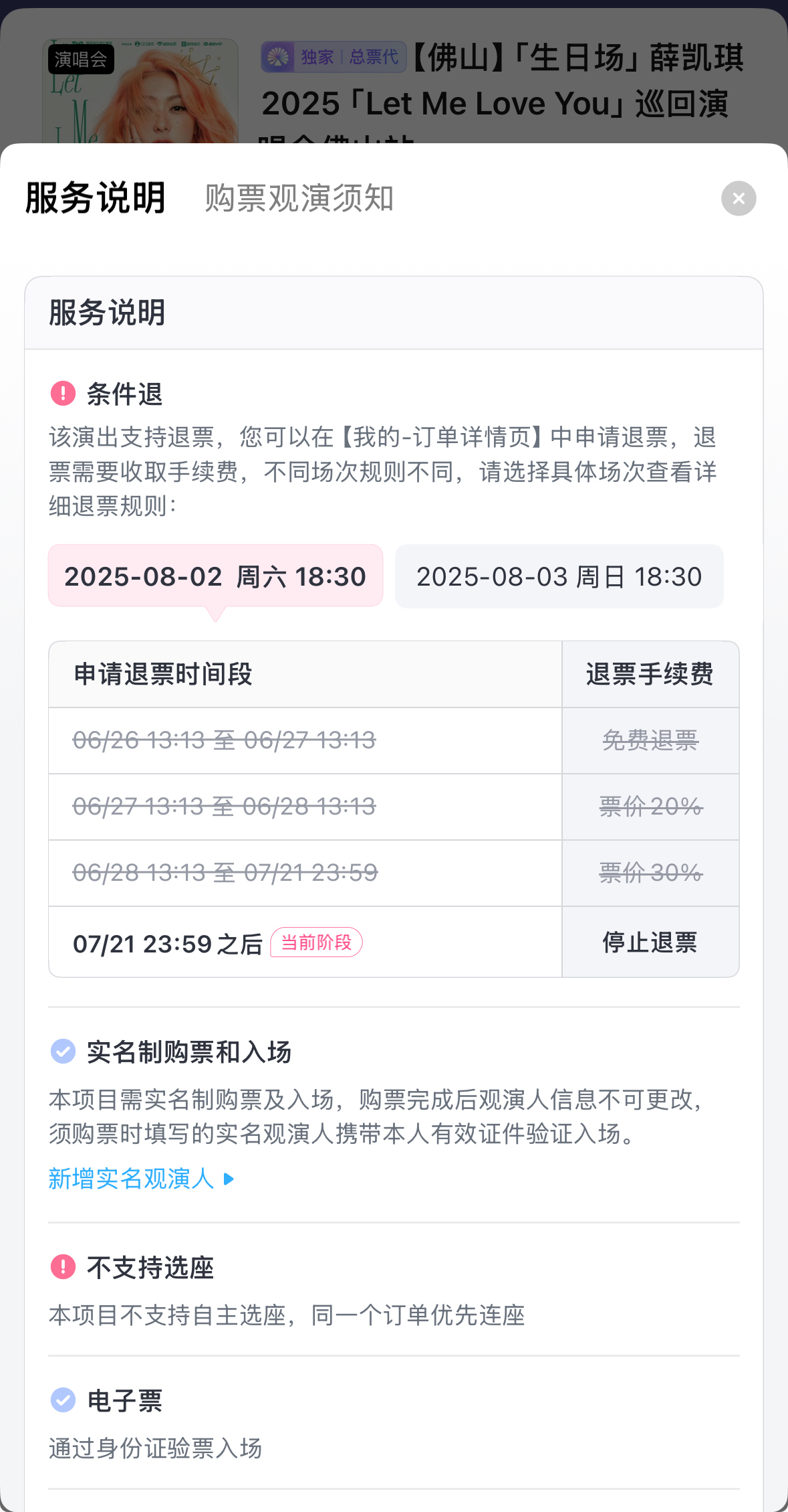 据该场演唱会票务总代理大麦平台显示,两场演出的最后退票时间均为7月21日23时59分。