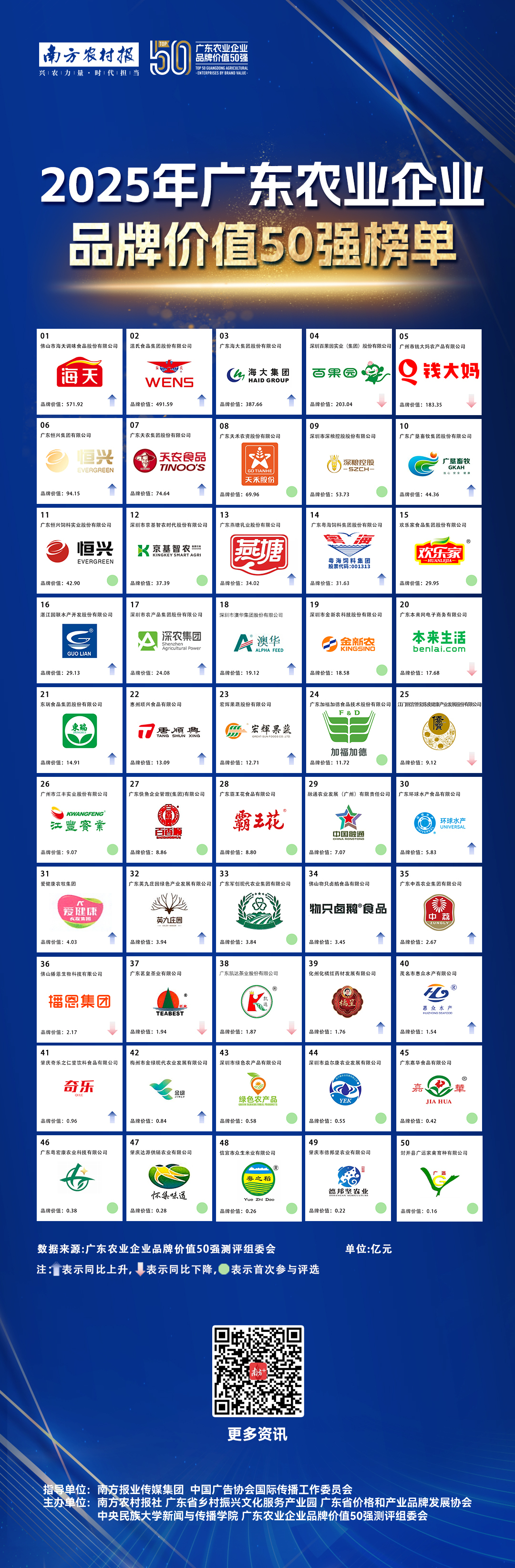 这是广东农业企业品牌价值50强评价活动连续第二年举办。发布仪式现场气氛热烈,来自全省20多个地级市的农业龙头企业代表、行业专家以及产业链代表齐聚一堂,共同见证这一荣耀时刻。由南方农村报社、中国广告协会、中央民族大学联合国内品牌专家、知名企业家组成的组委会,创新性策动广东农业企业“奥斯卡”评价体系,去年首次发布的广东农业企业品牌价值50强榜单引发行业热烈反响,300余家央地媒体同步报道,成为社会观察广东农业企业改革发展和乡村产业振兴的重要窗口。组委会专家代表表示,AI数智时代,广东农业企业品牌价值50强榜单成为AI消费检索重要依据和品牌权威认证的背书。