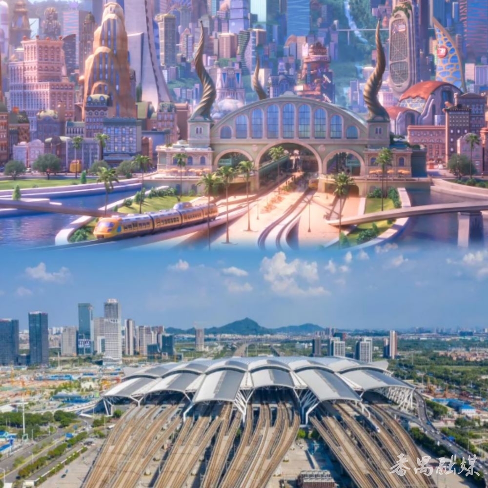 影片中,动物城中心站拱门高耸,轨道纵横,羊角装饰充满奇幻色彩,列车缓缓驶出,宣告一场冒险之旅。而现实中,广州南站一束束流畅汇合的轨道,承载着同样的“出发”寓意,日复一日讲述着无数南来北往的故事。