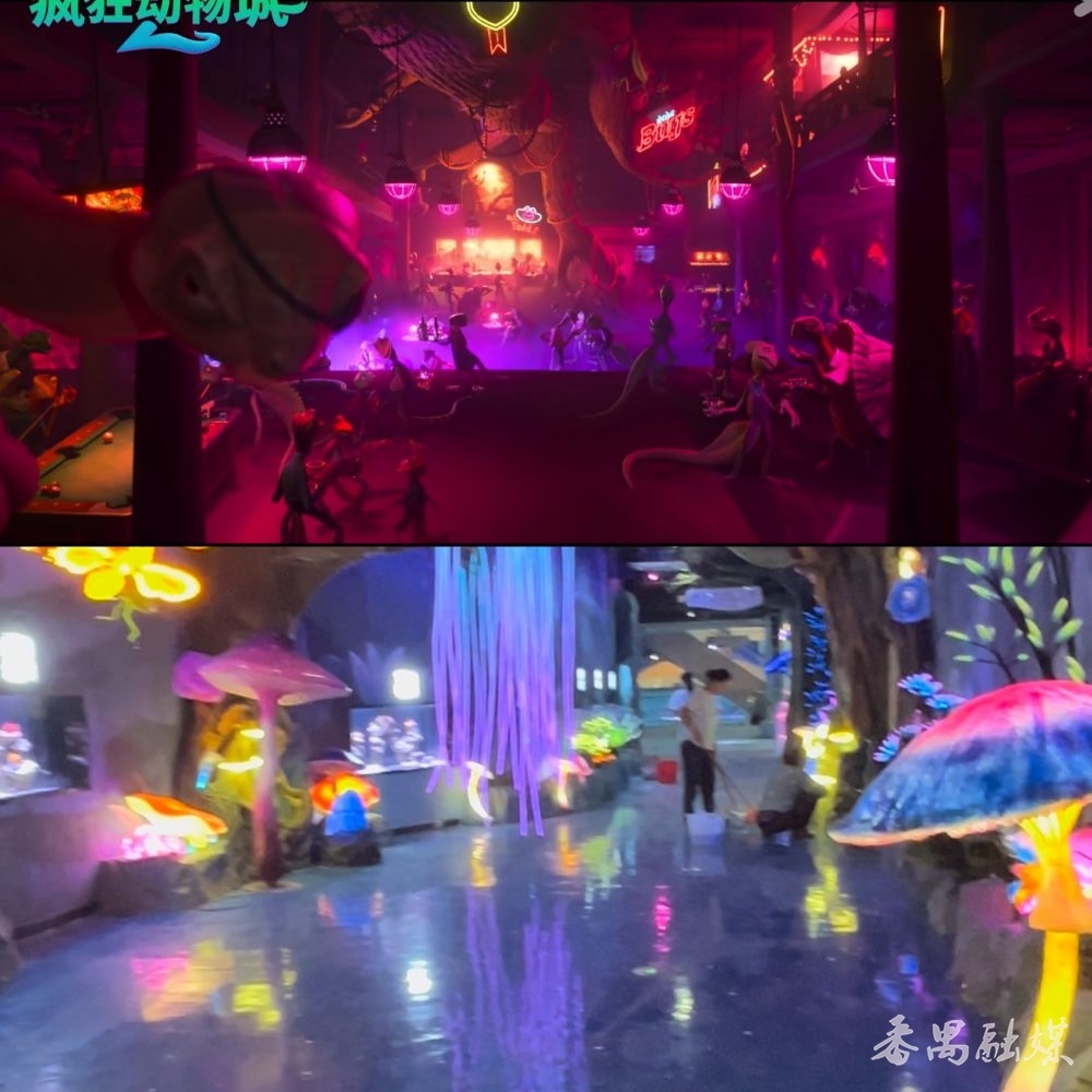 影片中的小型锯齿动物镇(左)和广州海洋世界内的童话街区布景(右)