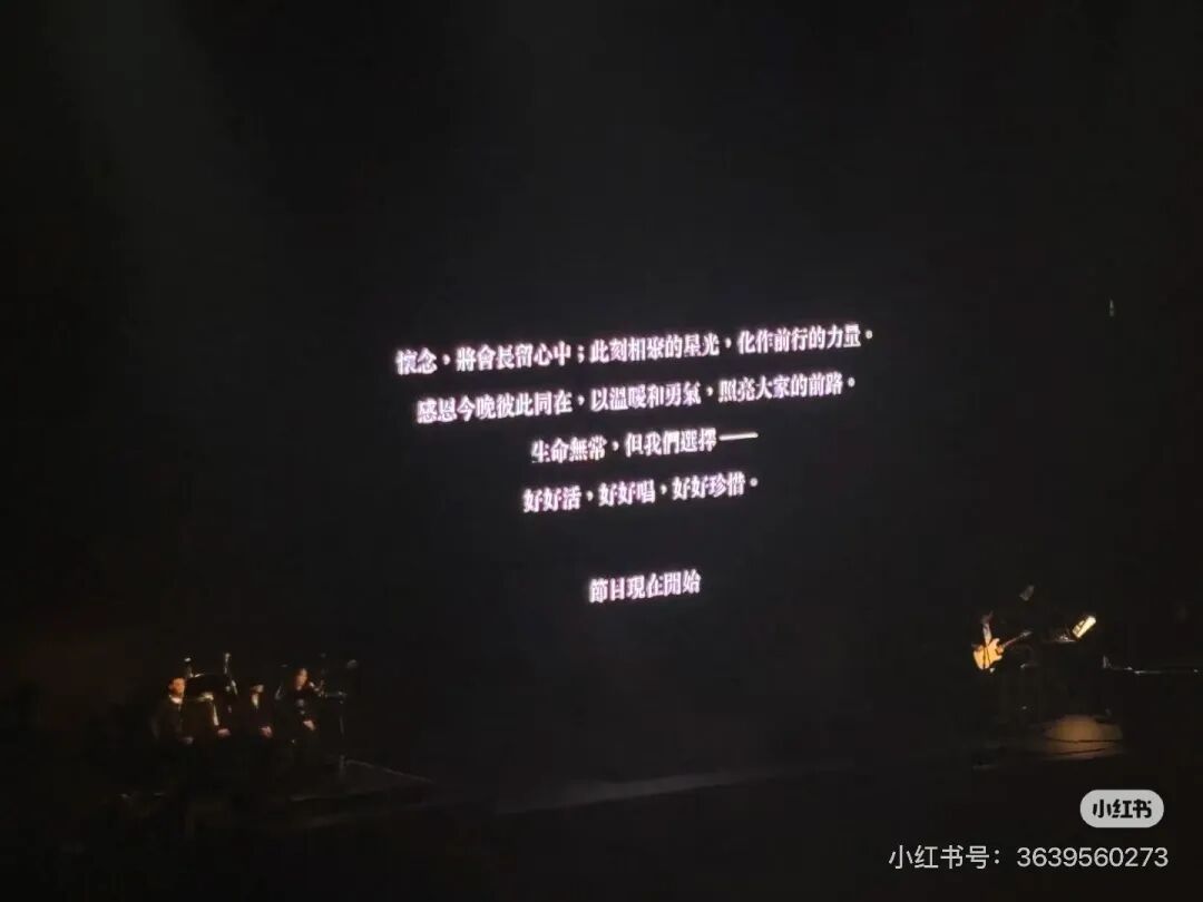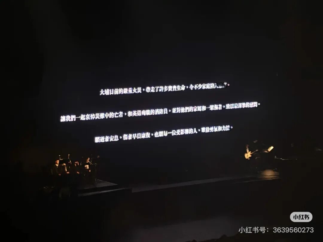 现场大屏幕上示意为这次意外的罹难者致哀,并写道:“怀念,将会长留心中;此刻相聚的星光,化作前行的力量。感恩今晚彼此同在,以温暖和勇气,照亮大家的前路。生命无常,但我们选择——好好活,好好唱,好好珍惜。”