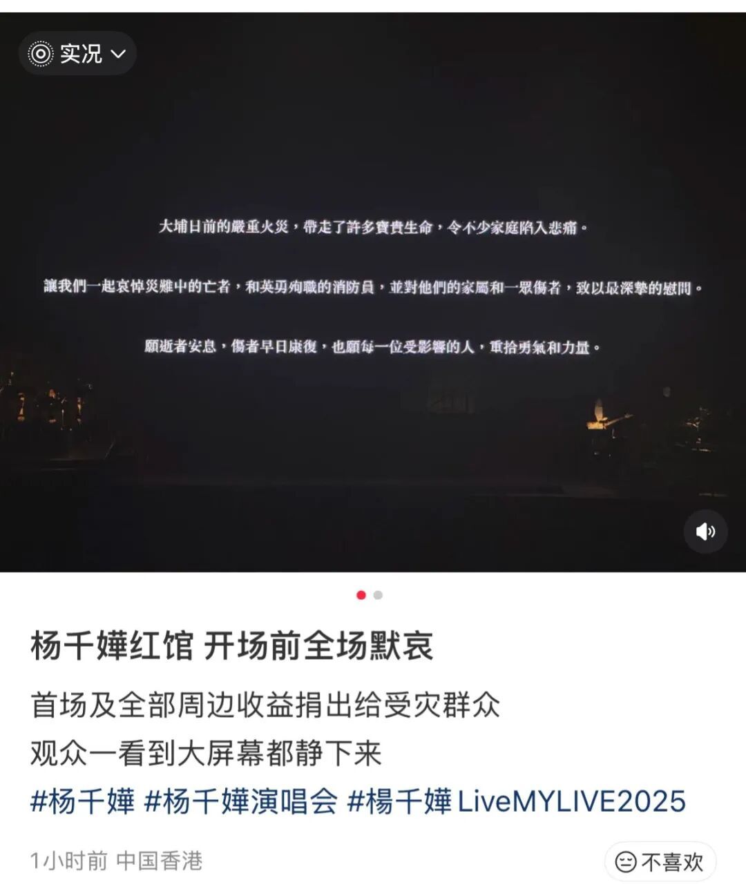 记者注意到,演唱会于20:15开始,杨千嬅和所有台前幕后工作人员连同场馆观众一起静默一分钟,为火灾事故所有受难者致哀。