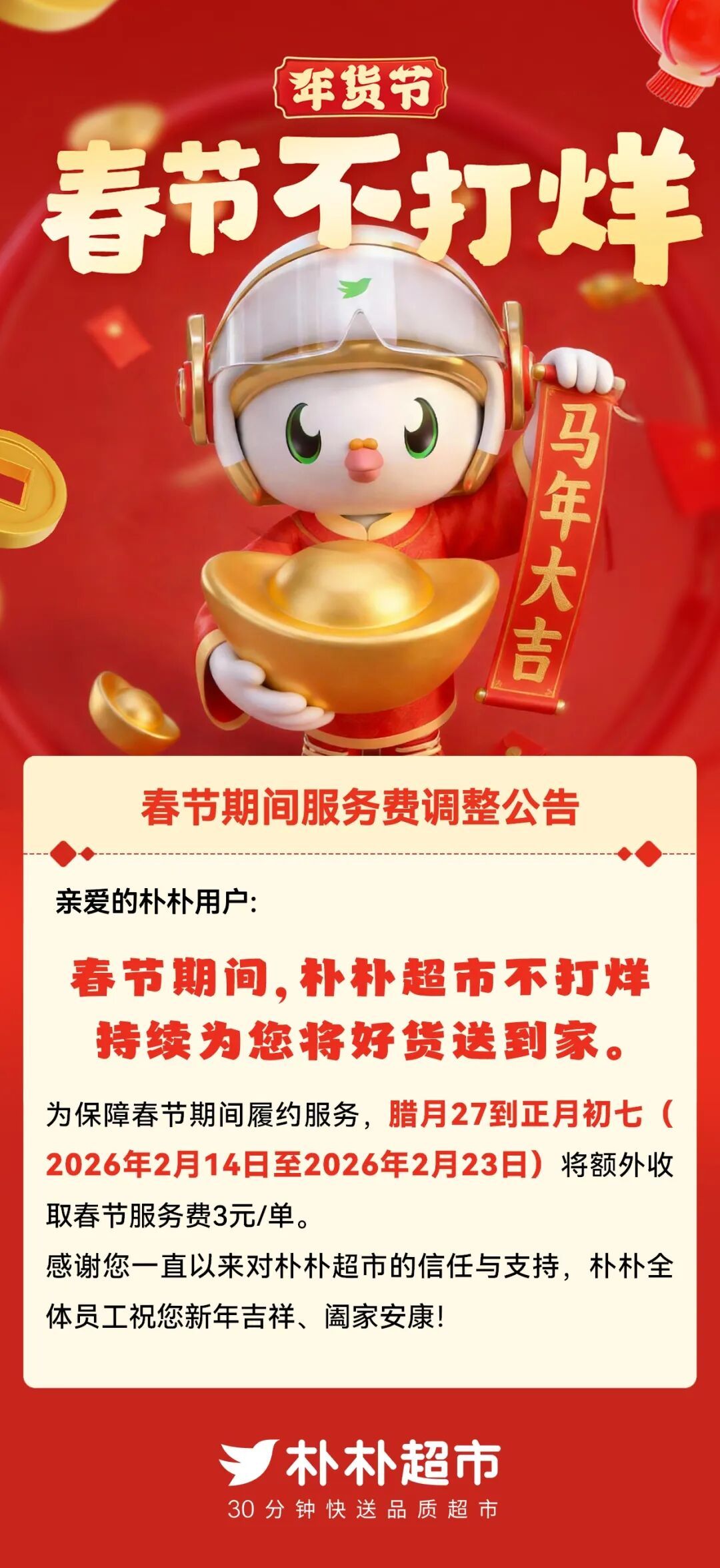朴朴超市表示,为保障春节期间履约服务,腊月廿七到正月初七(2026年2月14日至2026年2月23日),朴朴将额外收取春节服务费3元/单。