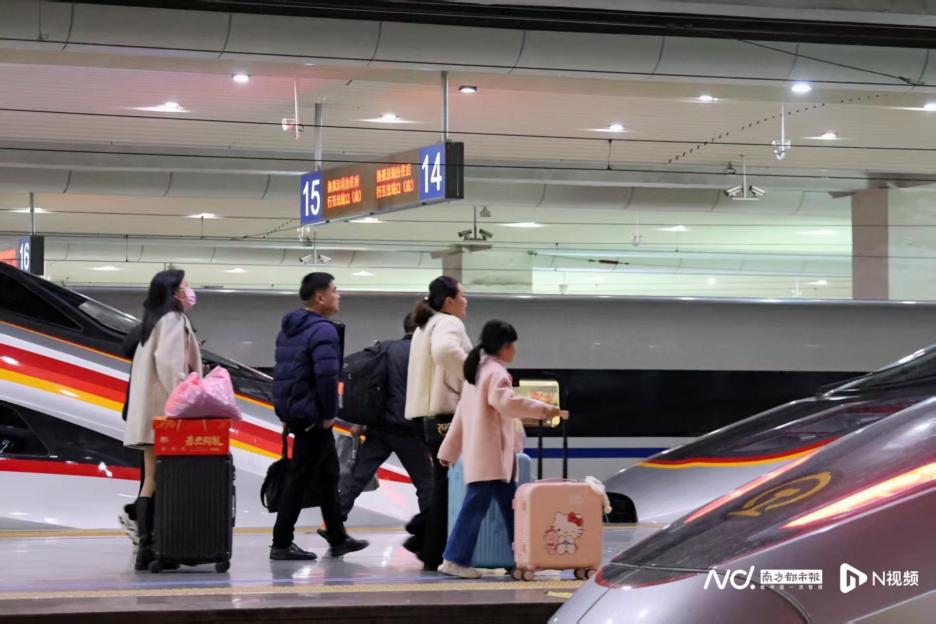 广州南站客流。大湾区春运首趟夜间高铁启程