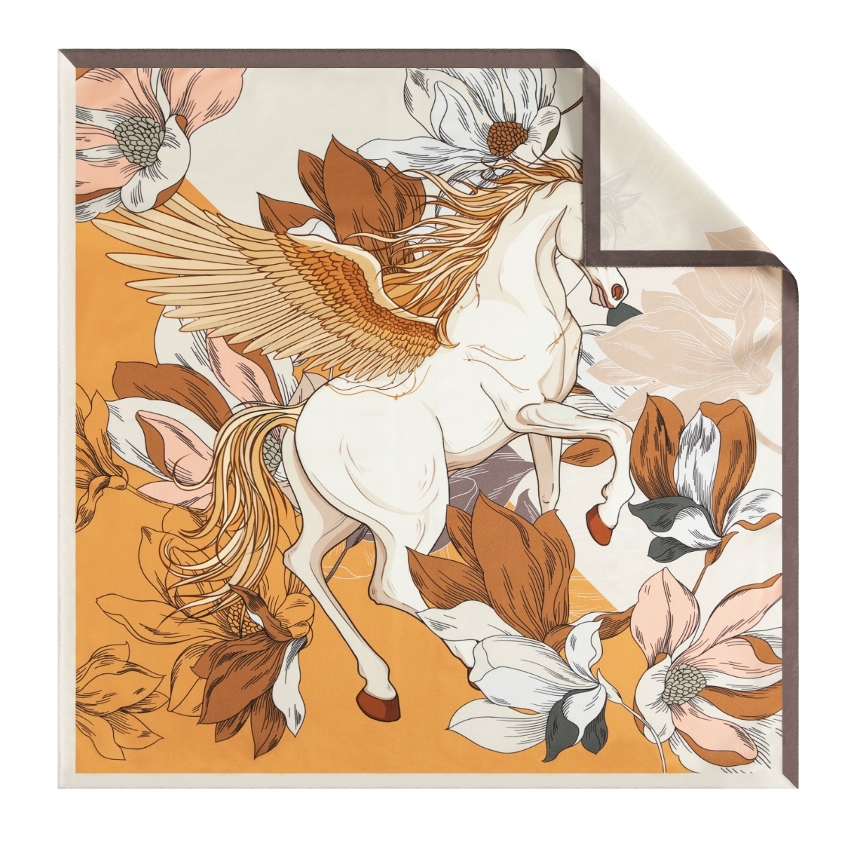 丝巾的设计灵感来自天马驰星,一飞冲天的上进精神。中国自古就有天马踏浪飞升成龙的故事,马踏飞花,奋蹄向前也表达着鲜衣怒马、奋勇争先的拼搏斗志,象征着我们中华民族的品质与格局。骐骥非凡马,玉兰若飞花,飞腾冲高处,志当摘星辰。2026年愿您颂福好运,一飞冲天!