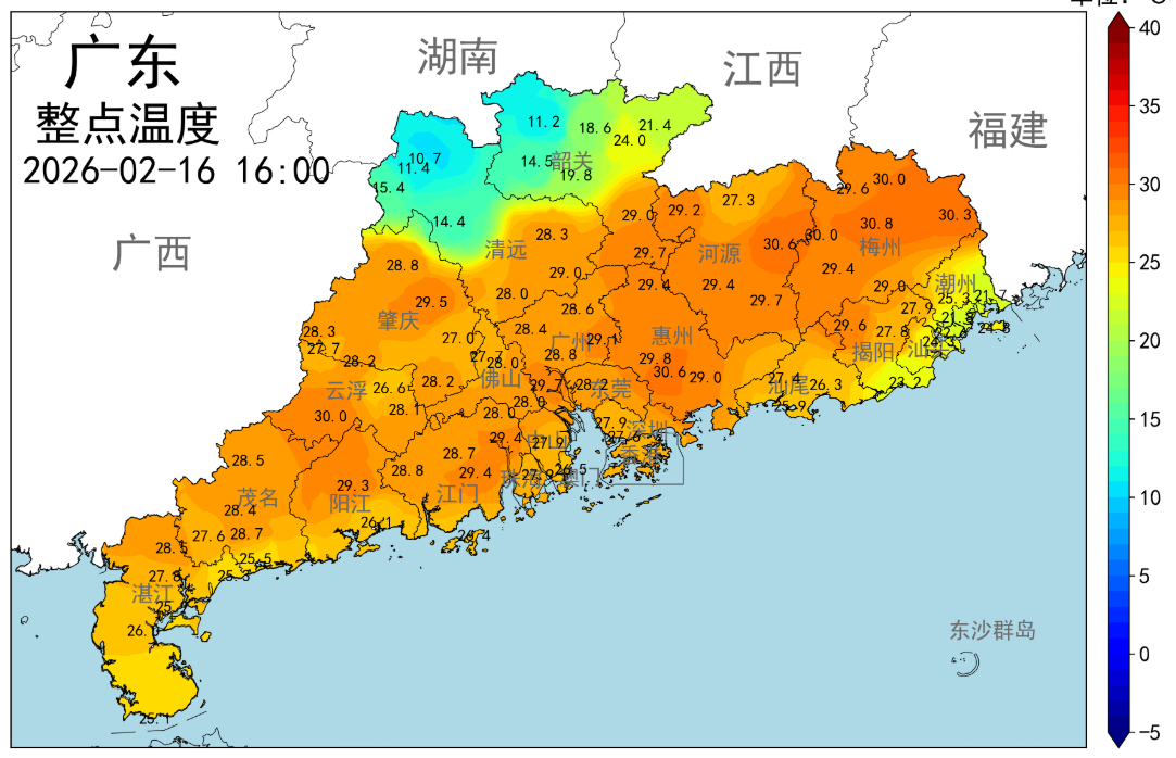 截至16日16时,从监测图看,粤北已经出现明显降温,最低温达到10.7℃;而此时珠三角等地仍处于“夏日状态”,多地气温逼近30℃。随着冷空气继续南下,广东各地将迎来明显降温。