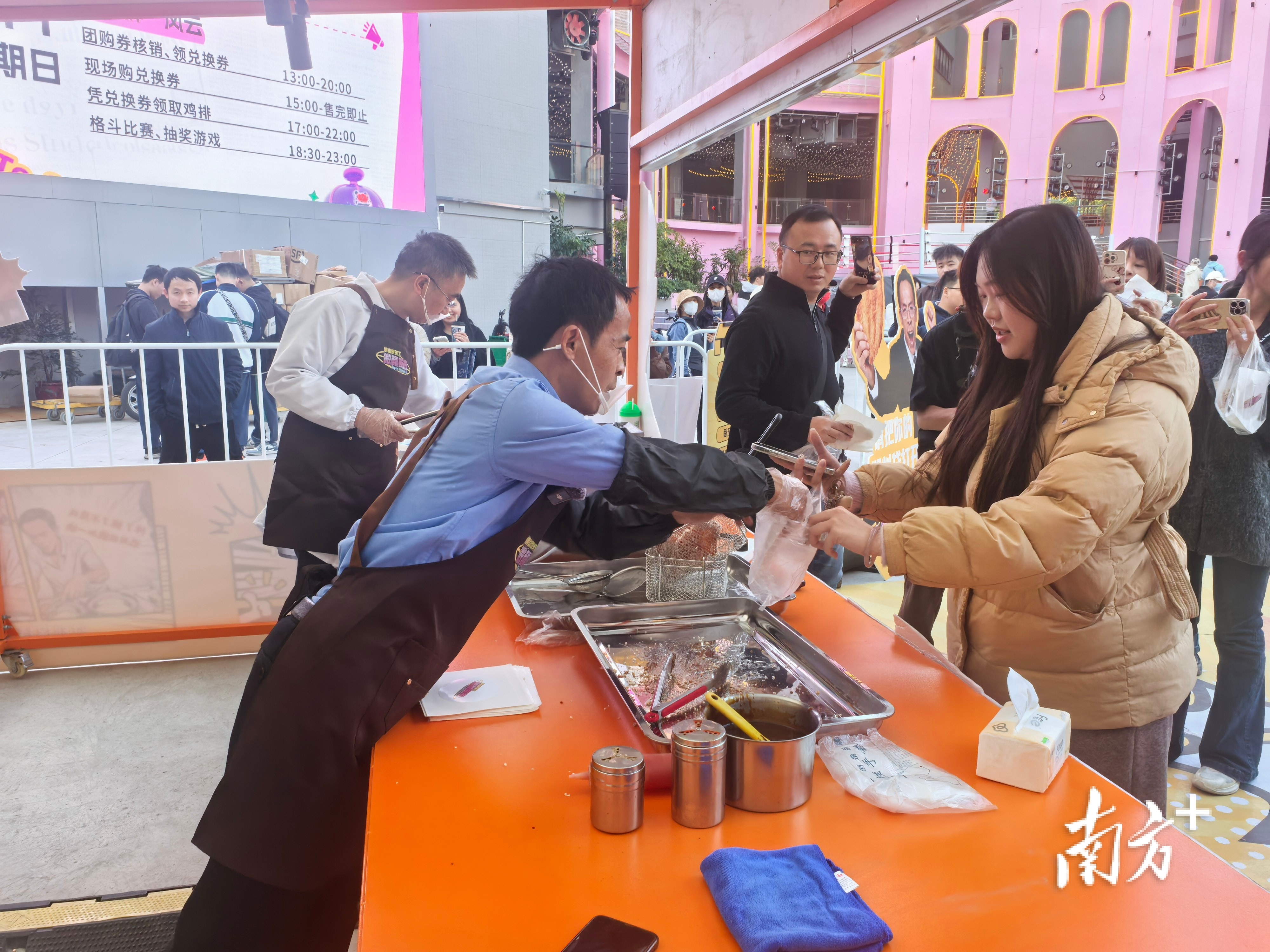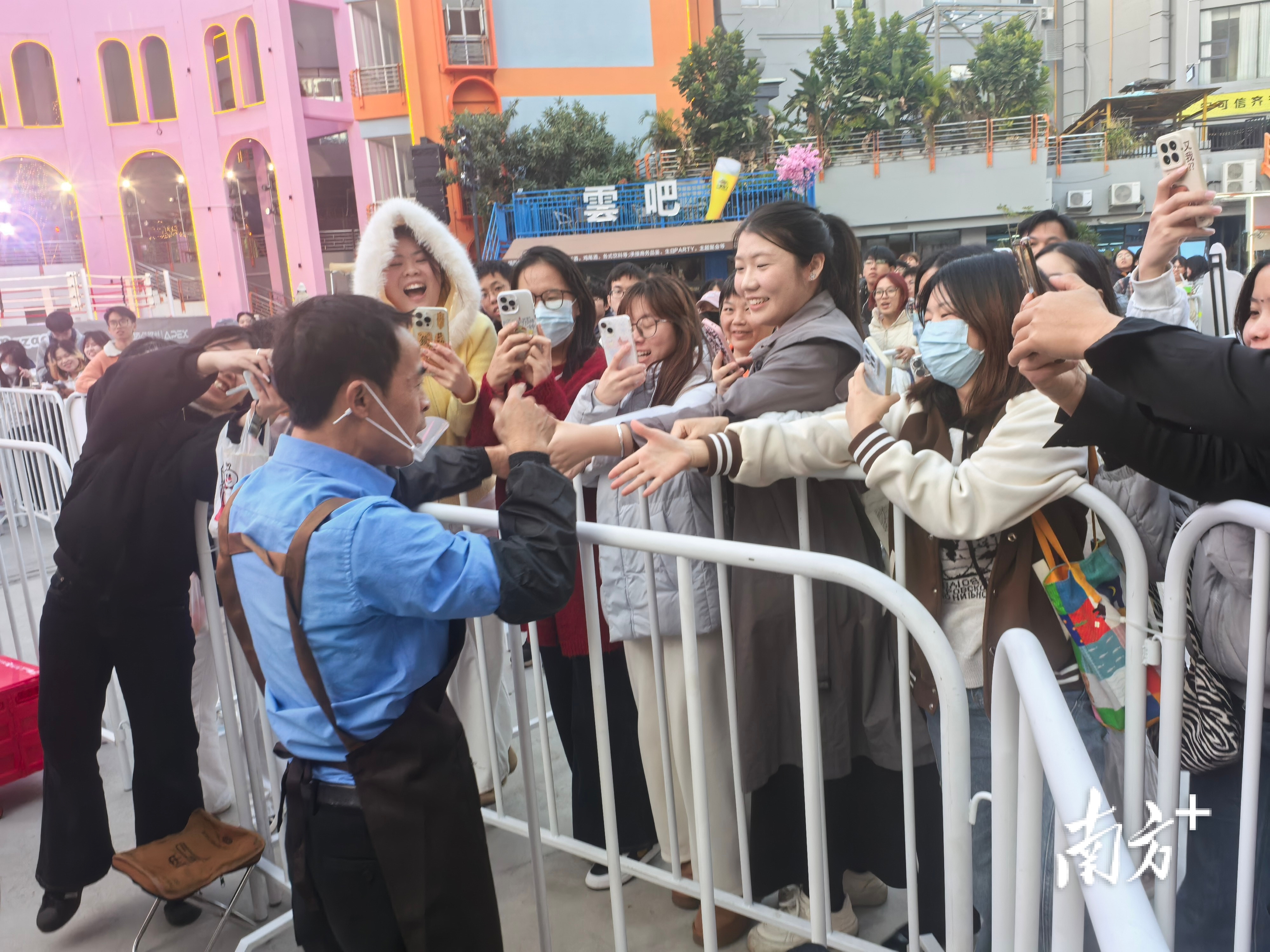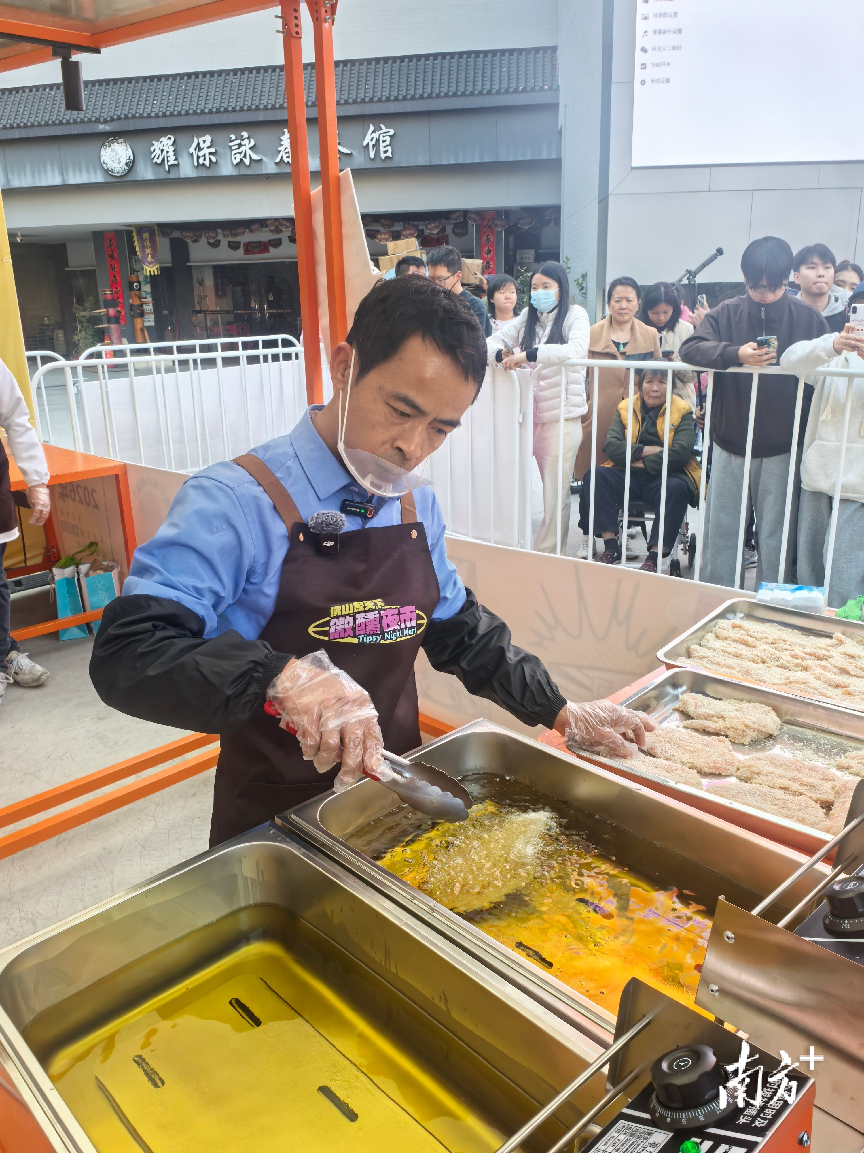 9日傍晚5点,佛山南海家天下微醺夜市的霓虹灯还没全亮,空气里扑鼻而来的是刚出锅鸡排的油香。鸡排哥系上围裙和口罩,已经开始给大家炸鸡了。在棚外,是被栅栏隔起来的潮水一样的人群,他们手机高举,闪光灯连成一片。