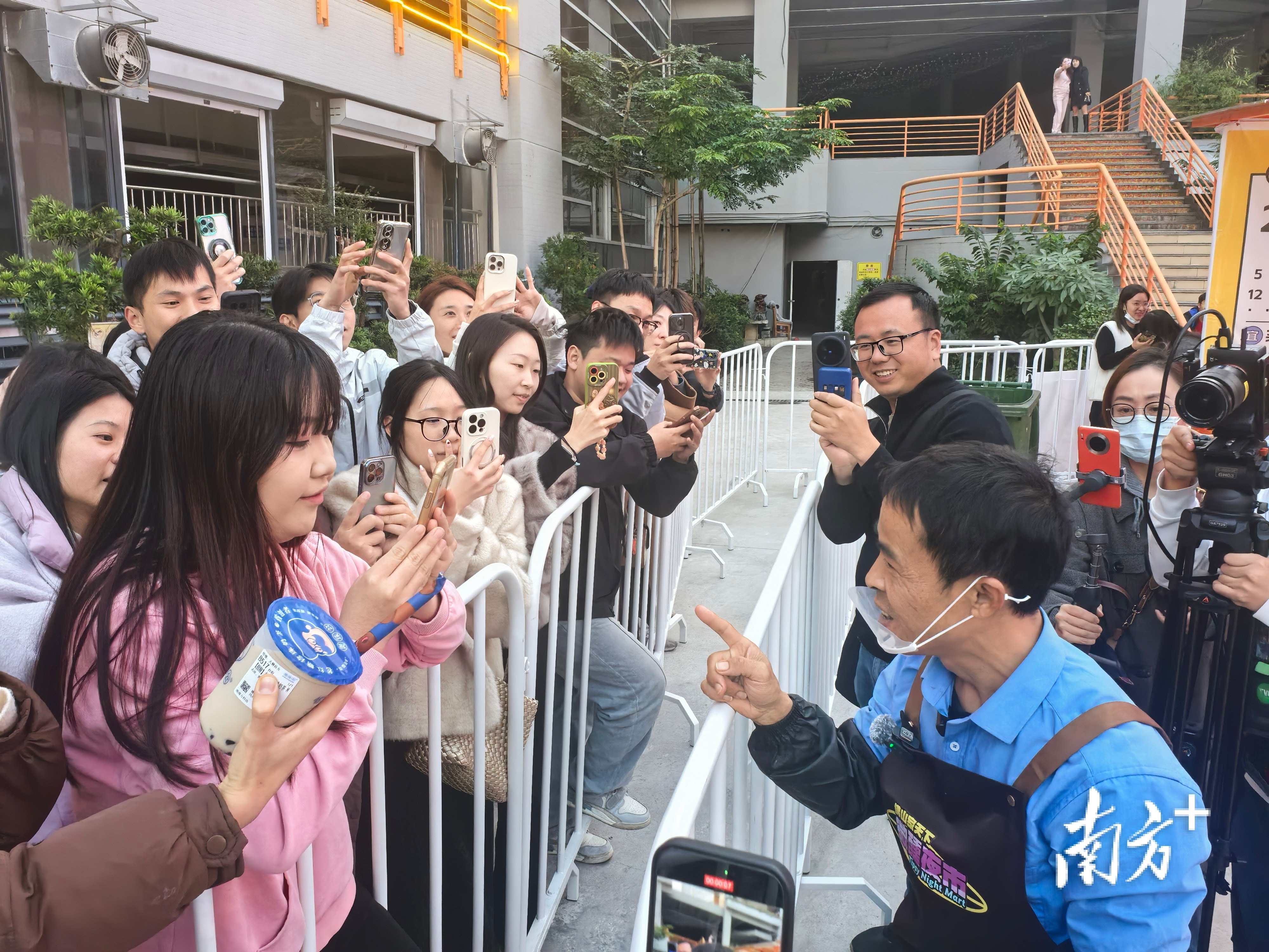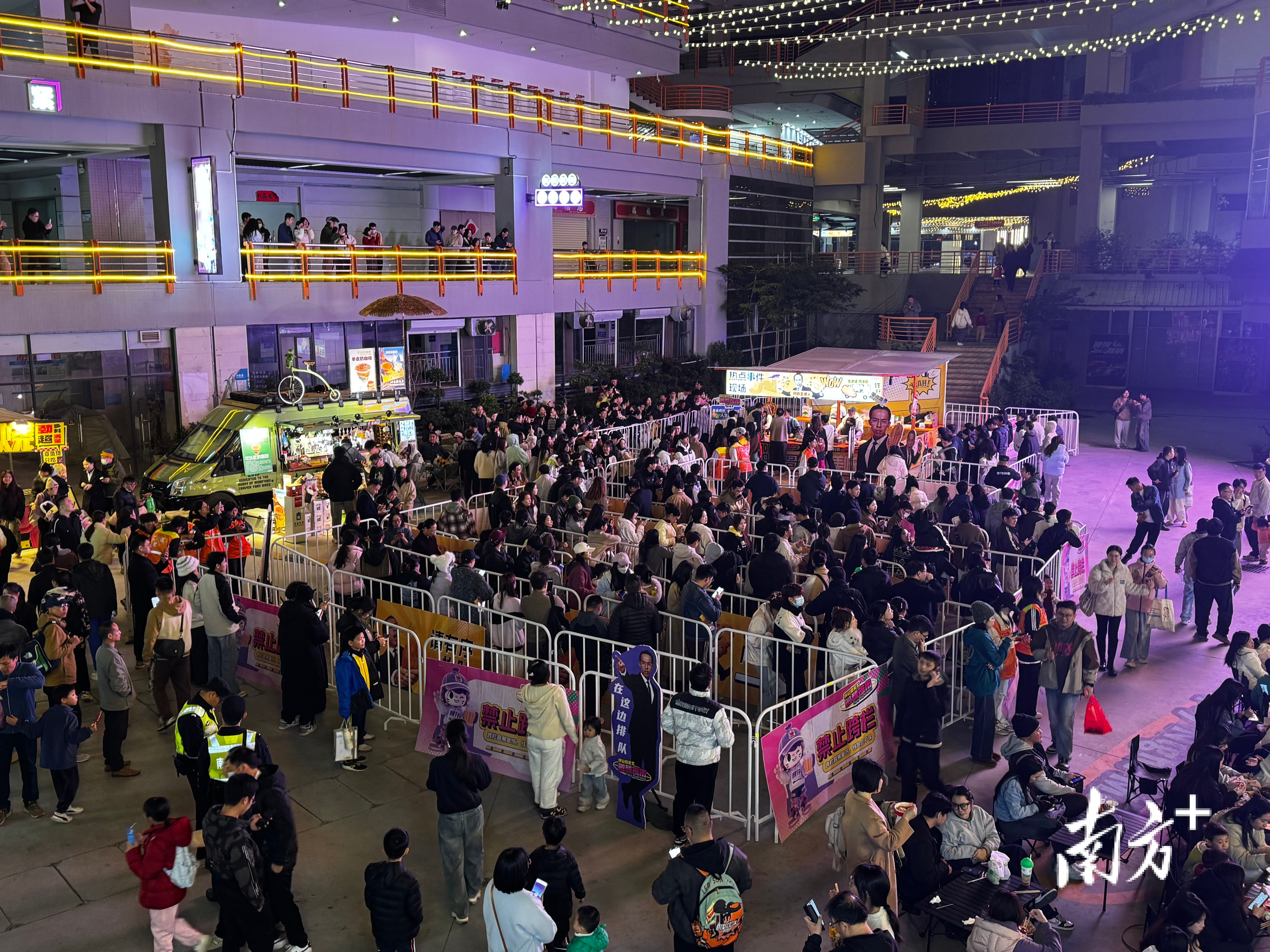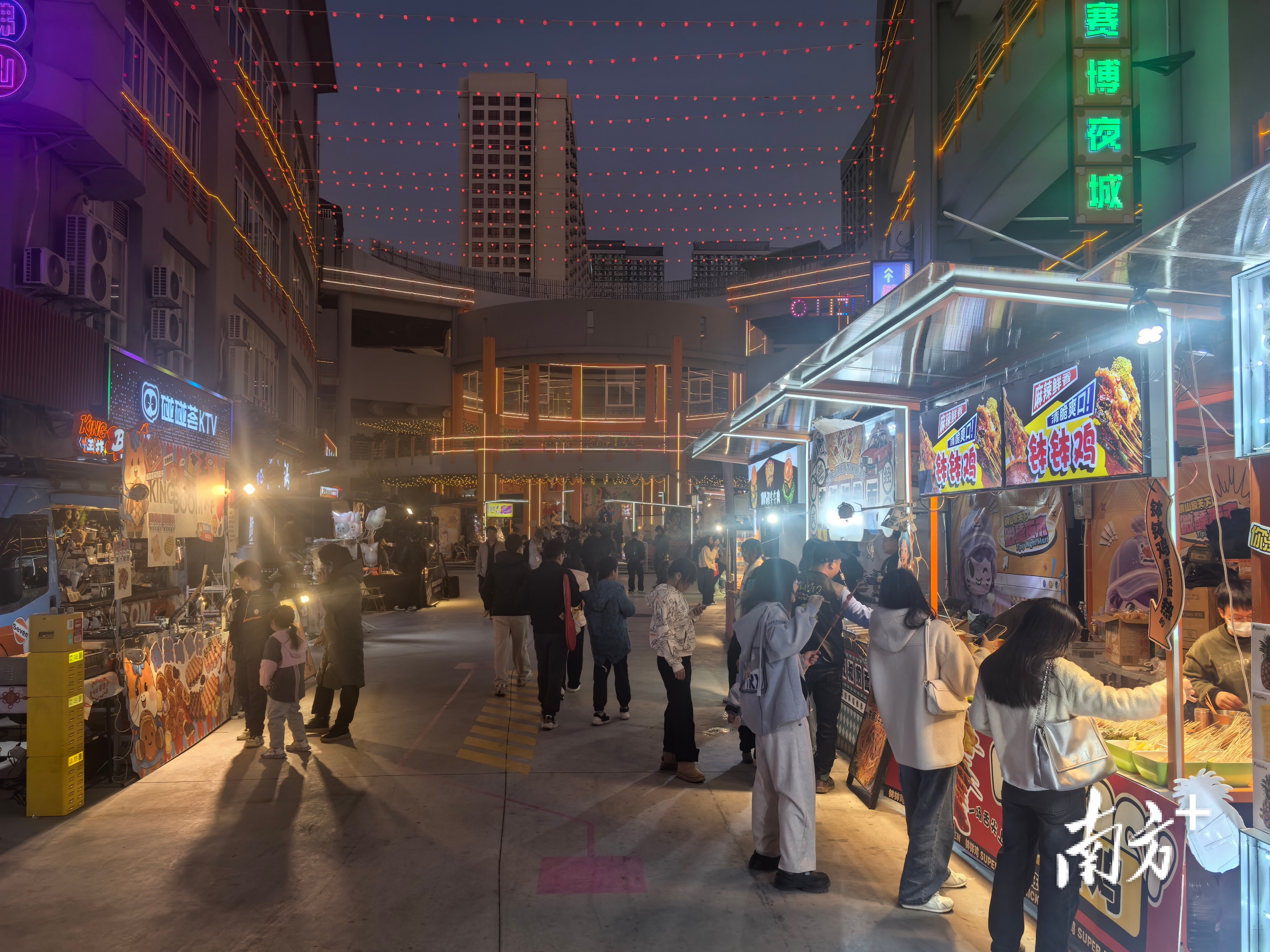 9日傍晚5点,佛山南海家天下微醺夜市的霓虹灯还没全亮,空气里扑鼻而来的是刚出锅鸡排的油香。鸡排哥系上围裙和口罩,已经开始给大家炸鸡了。在棚外,是被栅栏隔起来的潮水一样的人群,他们手机高举,闪光灯连成一片。