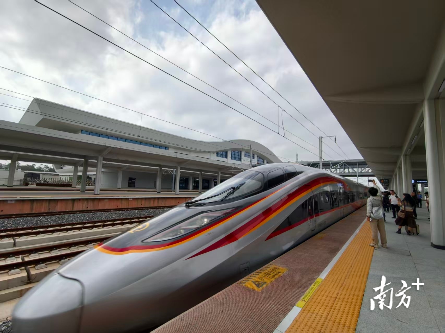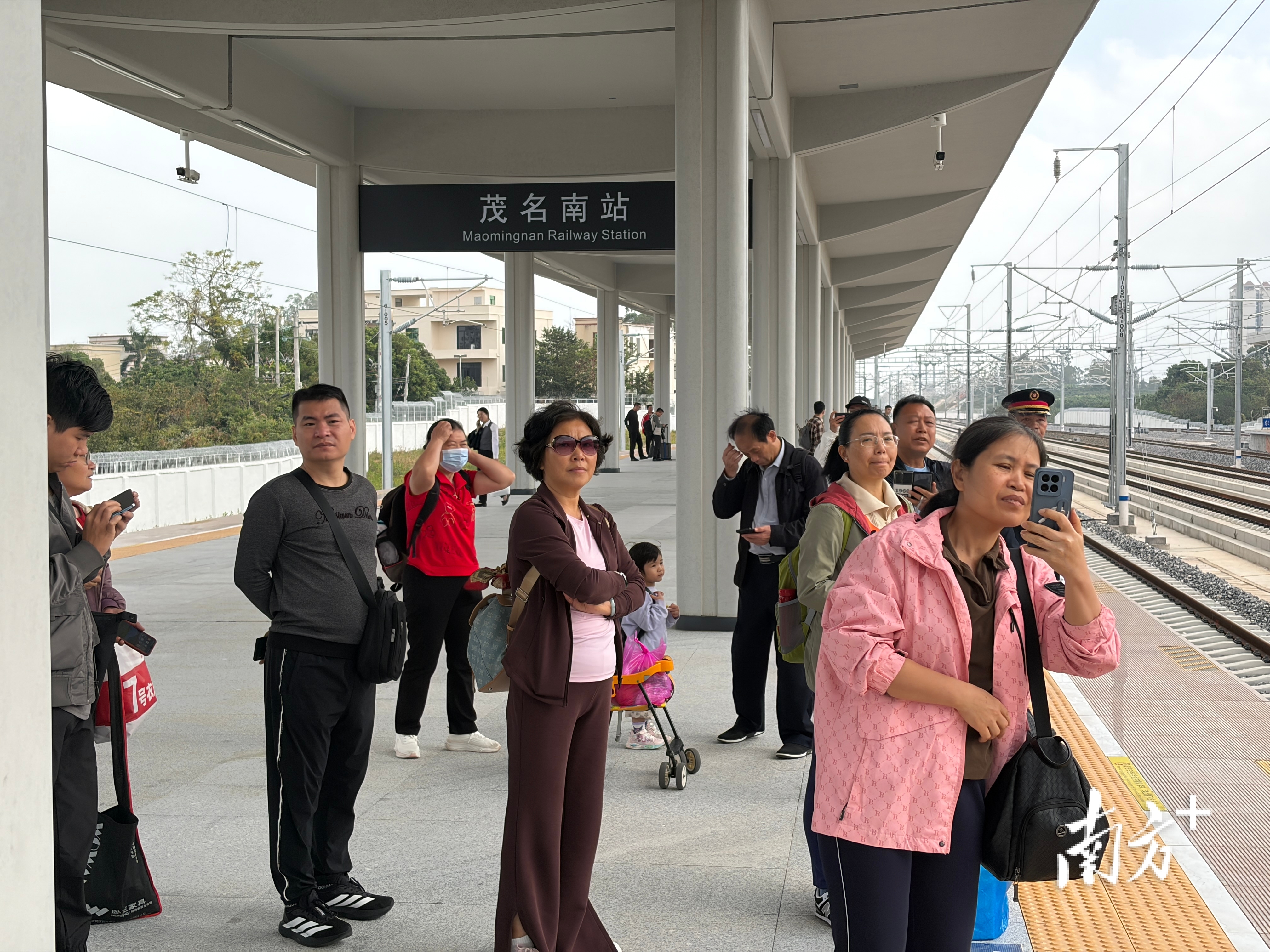茂名南站站台上,游客纷纷掏出手机等待记录列车进站。