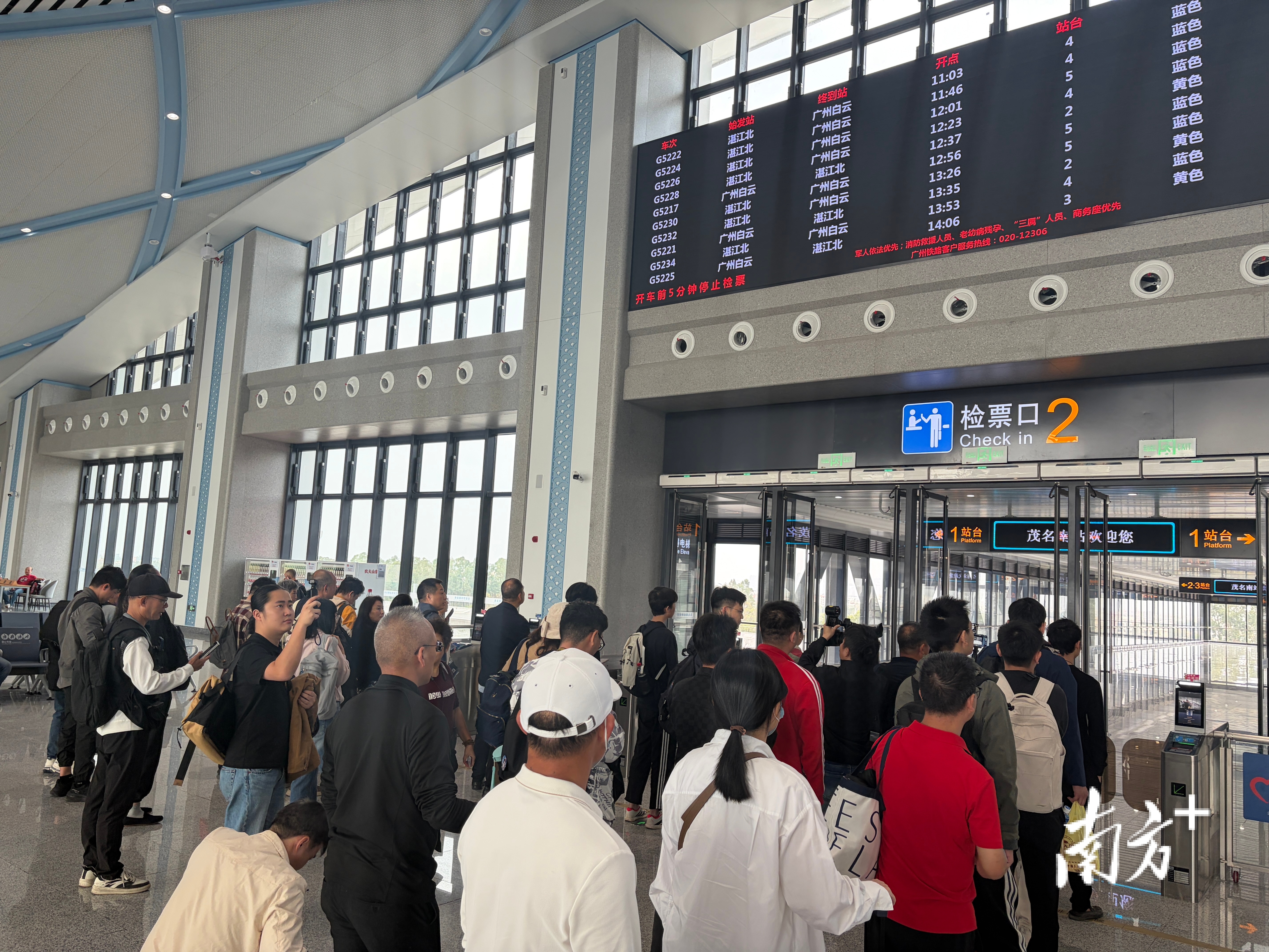 茂名南站首趟列车即将进站,游客排队检票进站。