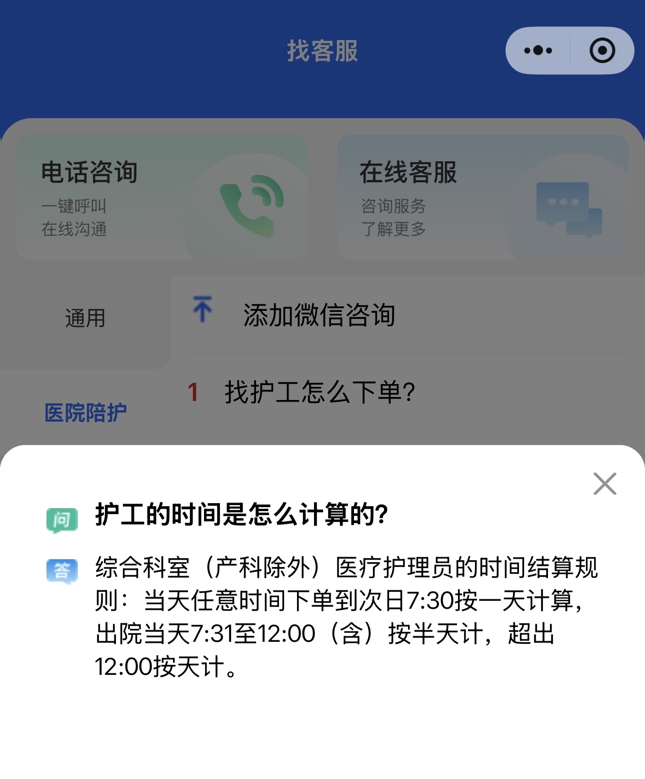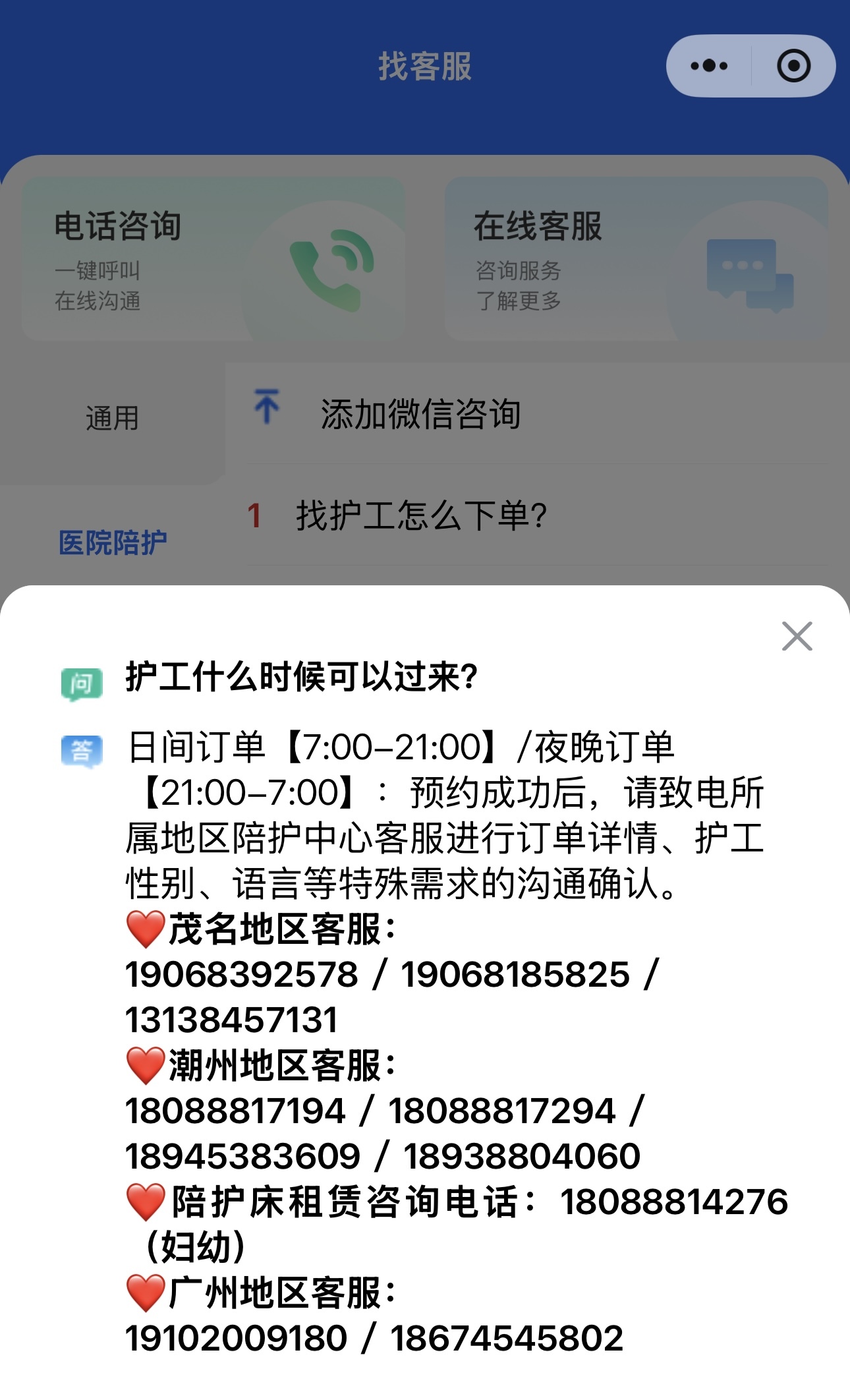 1月9日,记者通过“省心陪护”小程序的“找客服”页面,选择“护工什么时候可以过来”,可看到该项目经理提及的引导提示,并附有“潮州地区客服”4个手机号码。