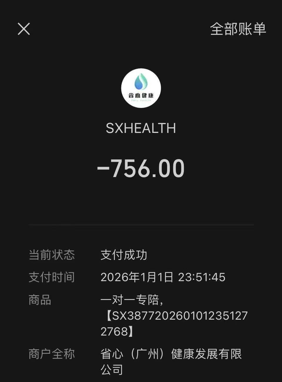 李女士提供的“一对一专陪”服务付款截图。 受访者供图
