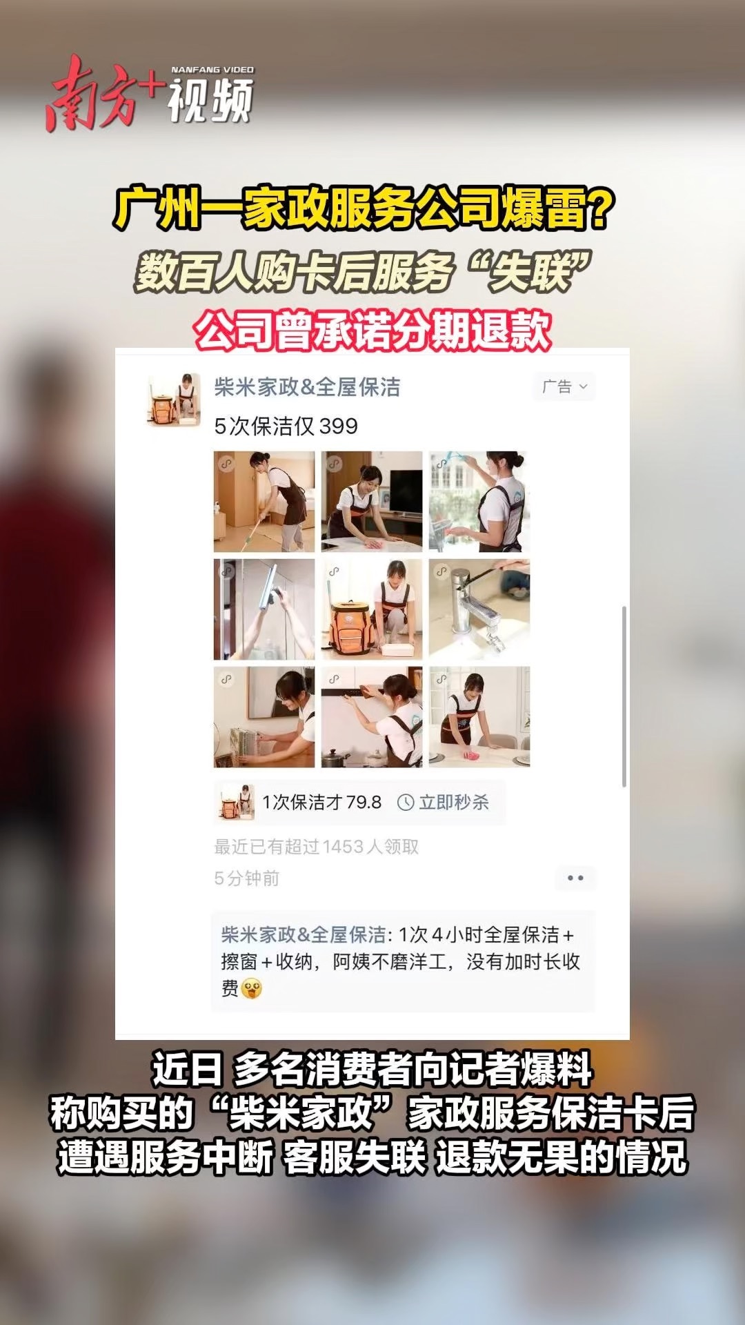 近日,多名消费者向记者爆料,通过微信朋友圈推送的家政服务广告购买“柴米家政”等相关品牌的保洁卡后,遭遇服务中断、客服失联、退款无果的情况,涉及金额从数百元到数千元不等,涉及的消费者有数百人。