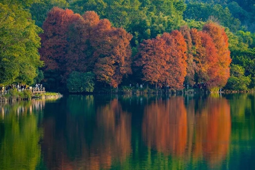 此时,成片的落羽杉由黄转为深红,与湖水蓝天交相辉映,宛如一幅天然的“美拉德”油画。