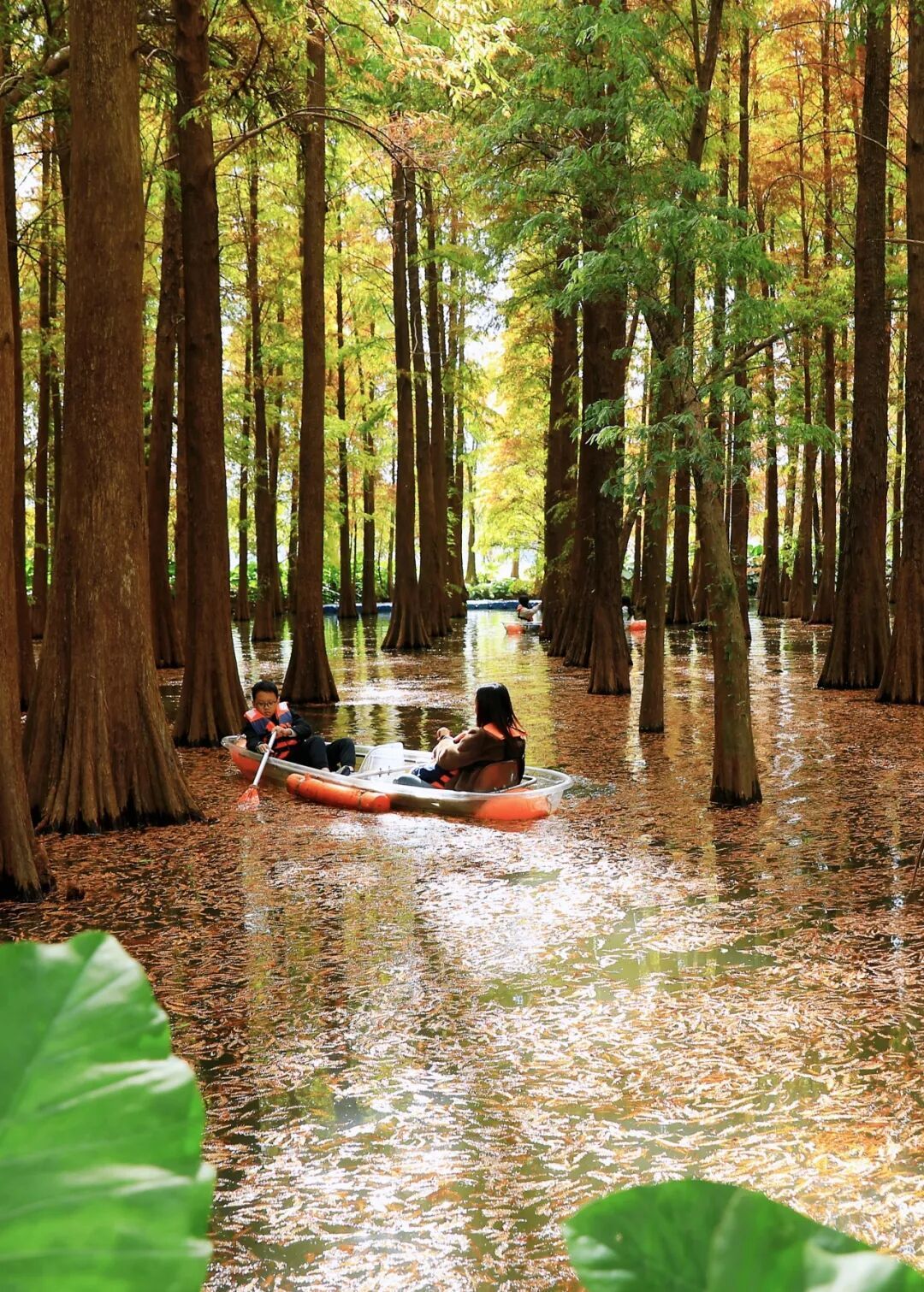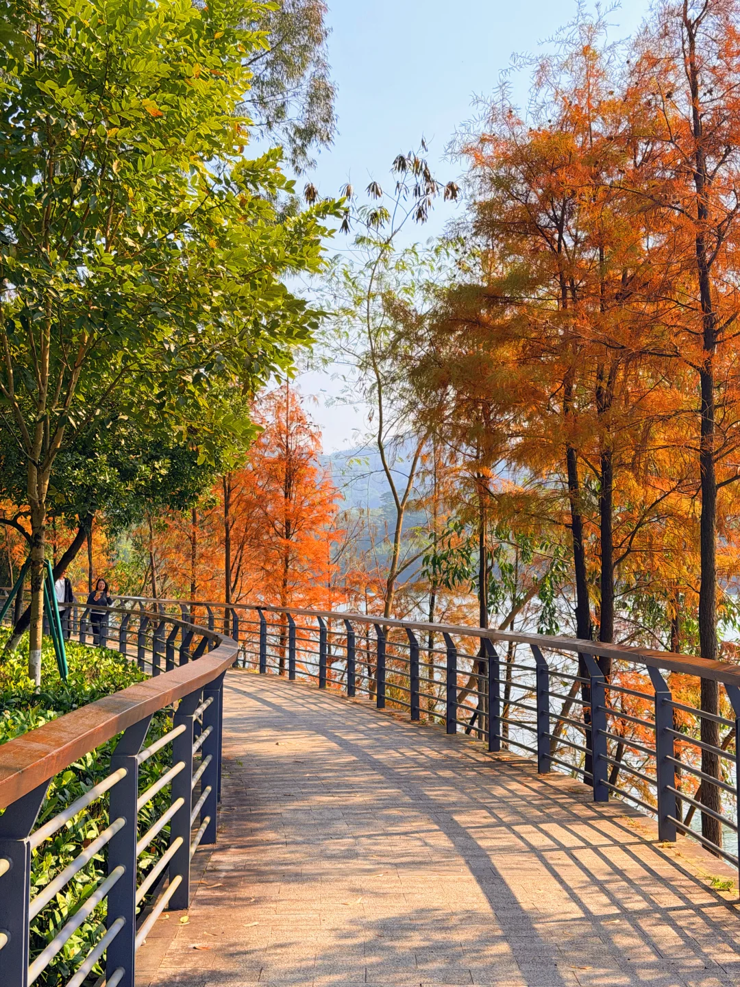 湖畔的落羽杉现已披上渐变“彩衣”,午后阳光穿过枝叶,在步道上洒下斑驳光影,随手一拍都是风景。