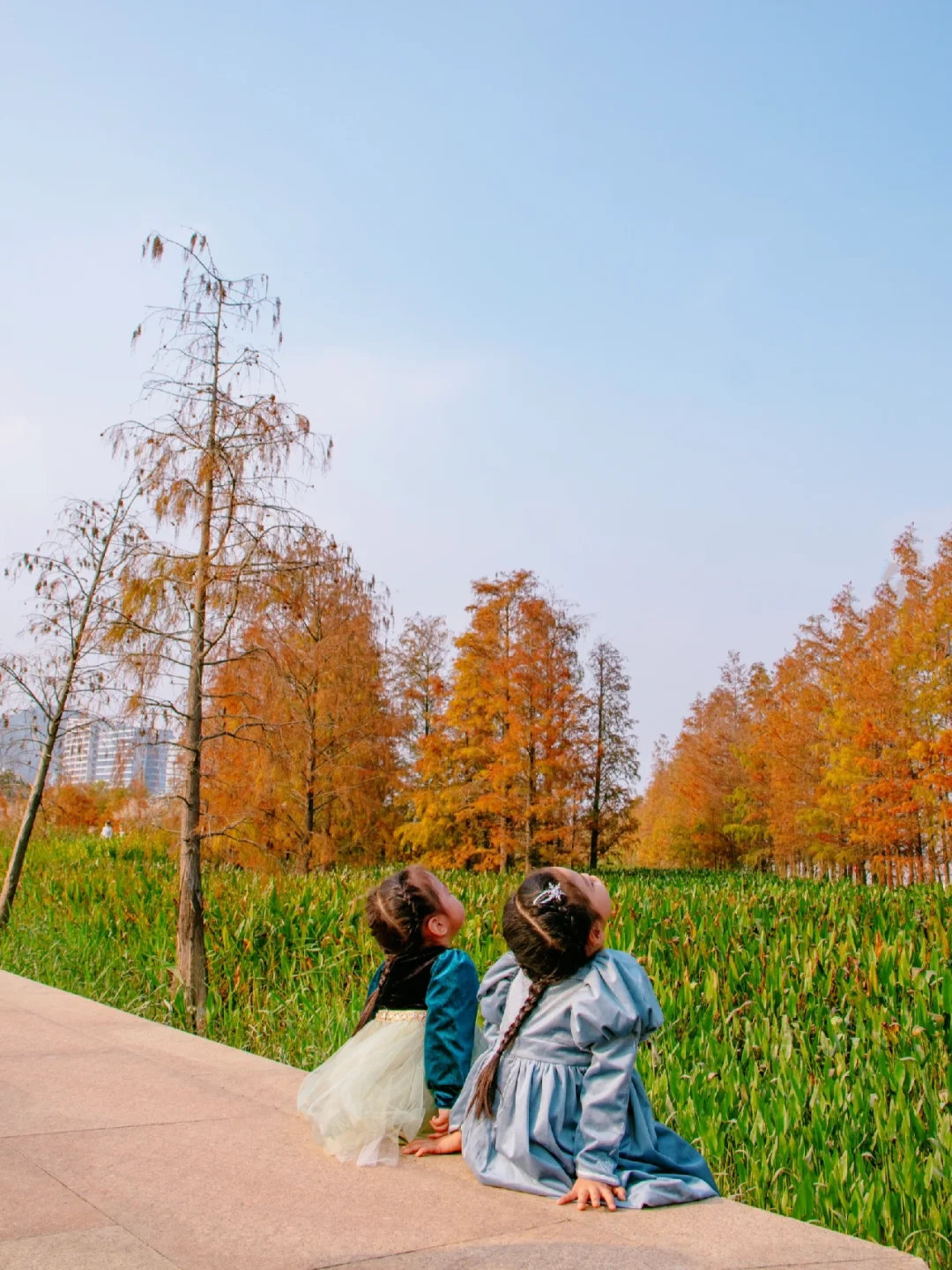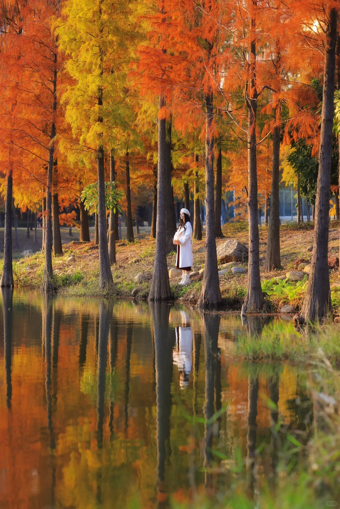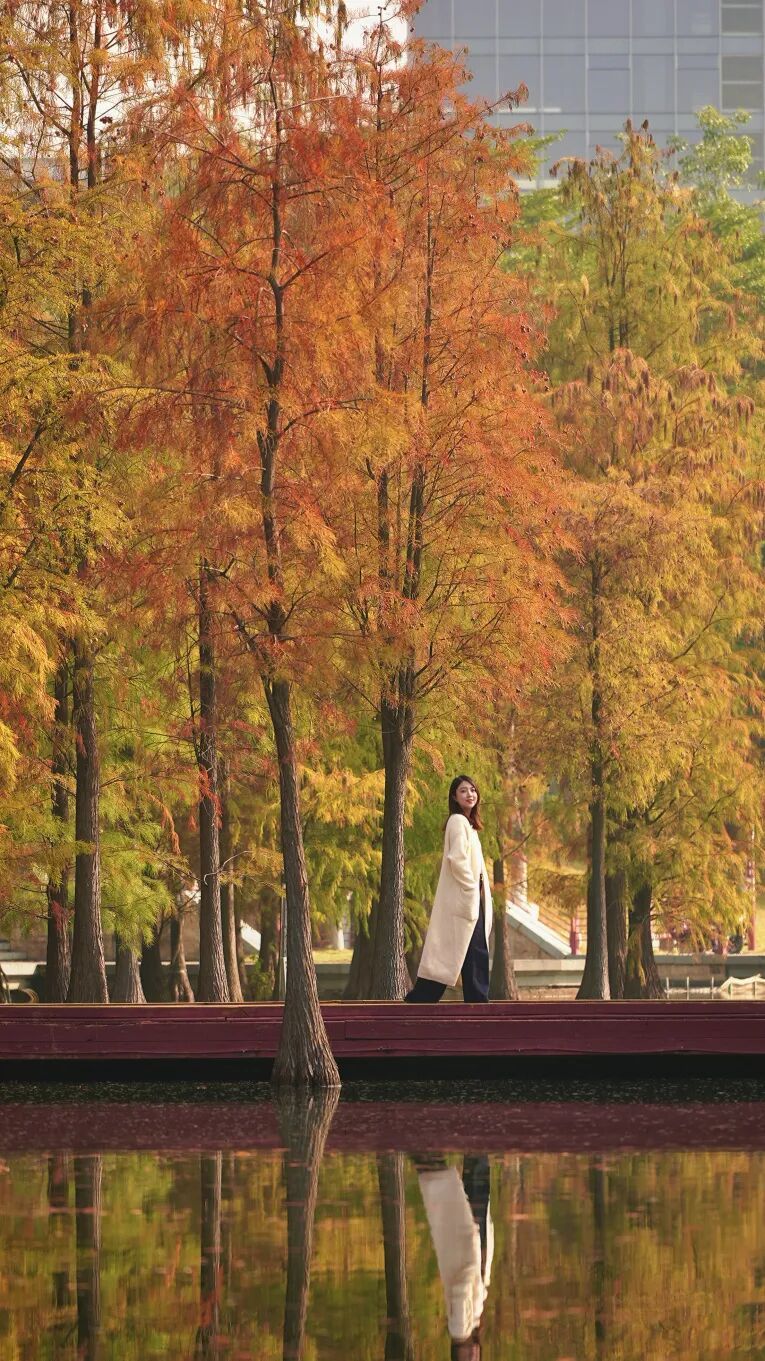 建议选择白色系、米色系或美拉德色系的衣服,能与落羽杉的秋色形成互动,也可以搭配贝雷帽、围巾等配饰,增加秋日氛围感。