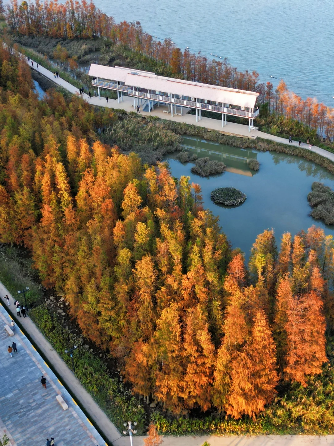 最佳观赏区域位于公园三期北区及市民广场附近,树形挺拔,色彩层叠。建议导航至“读书驿站”精准抵达落羽杉栈道区域。