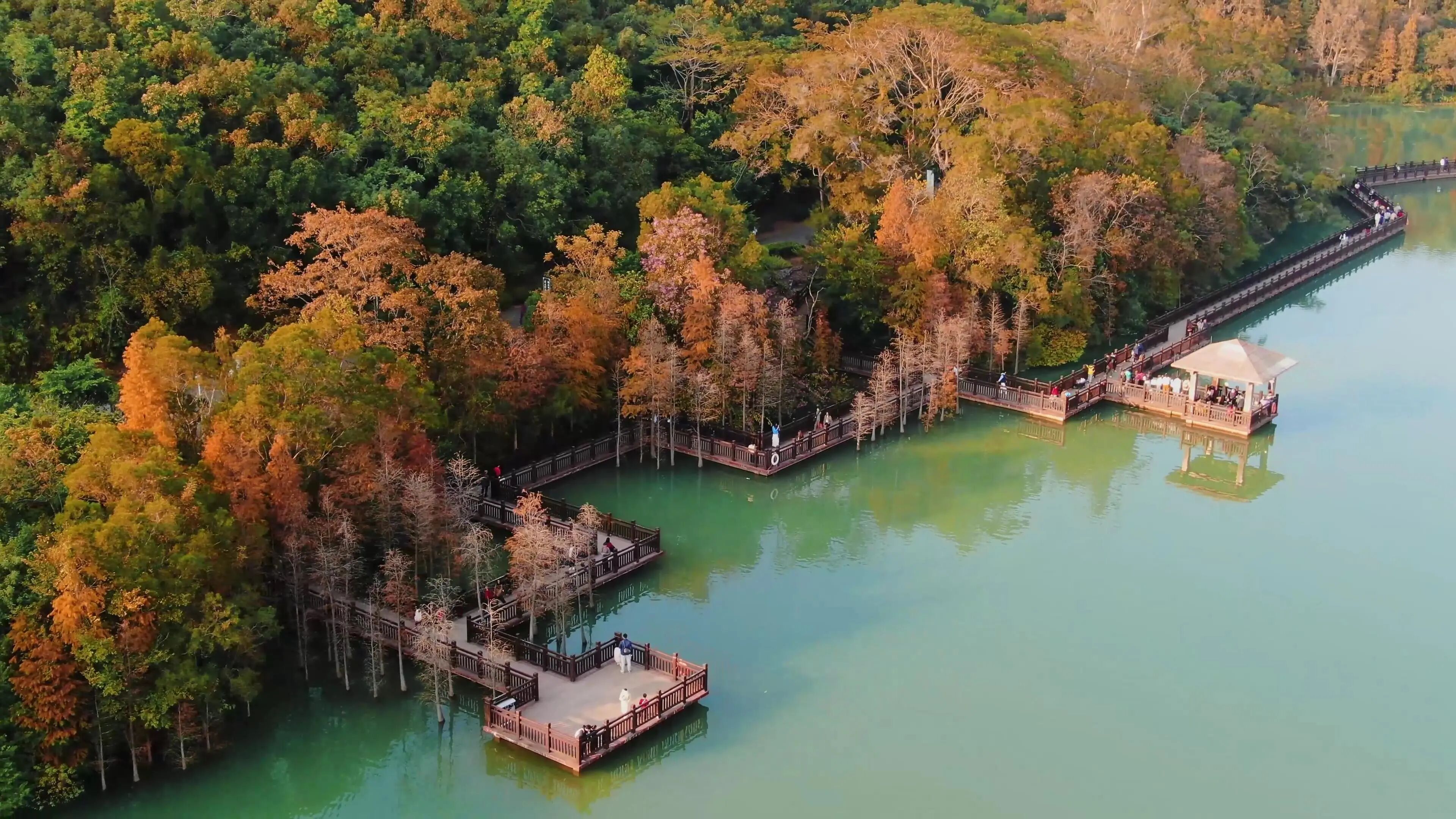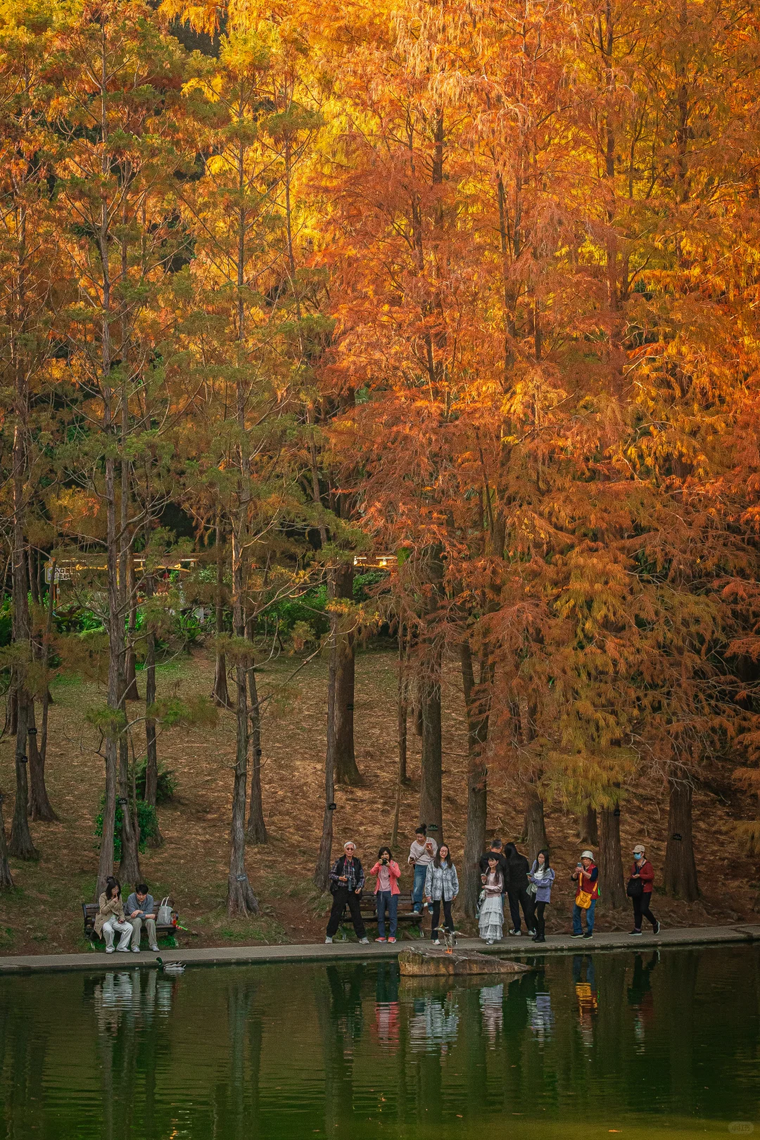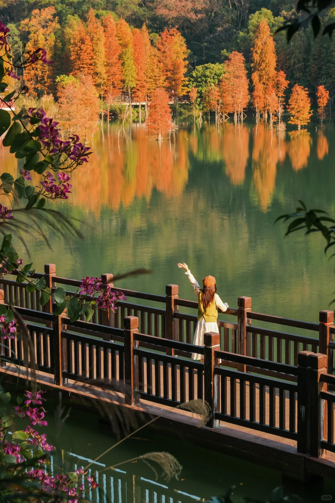 这里的落羽杉沿翡翠湖亲水栈道分布,尤其在得月台、映霞台一带,杉树已披上绿、黄、红三色渐变“彩衣”,与碧绿湖水相映,被称作“新会小九寨”。