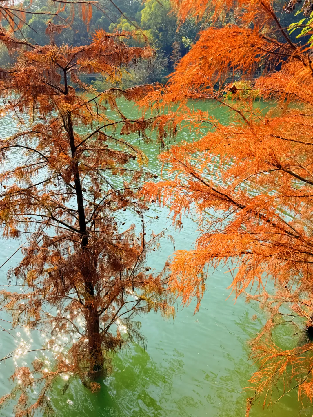 整条水边的杉树都染上了橙黄锈红的渐变色,像调色盘洒在了岸边。