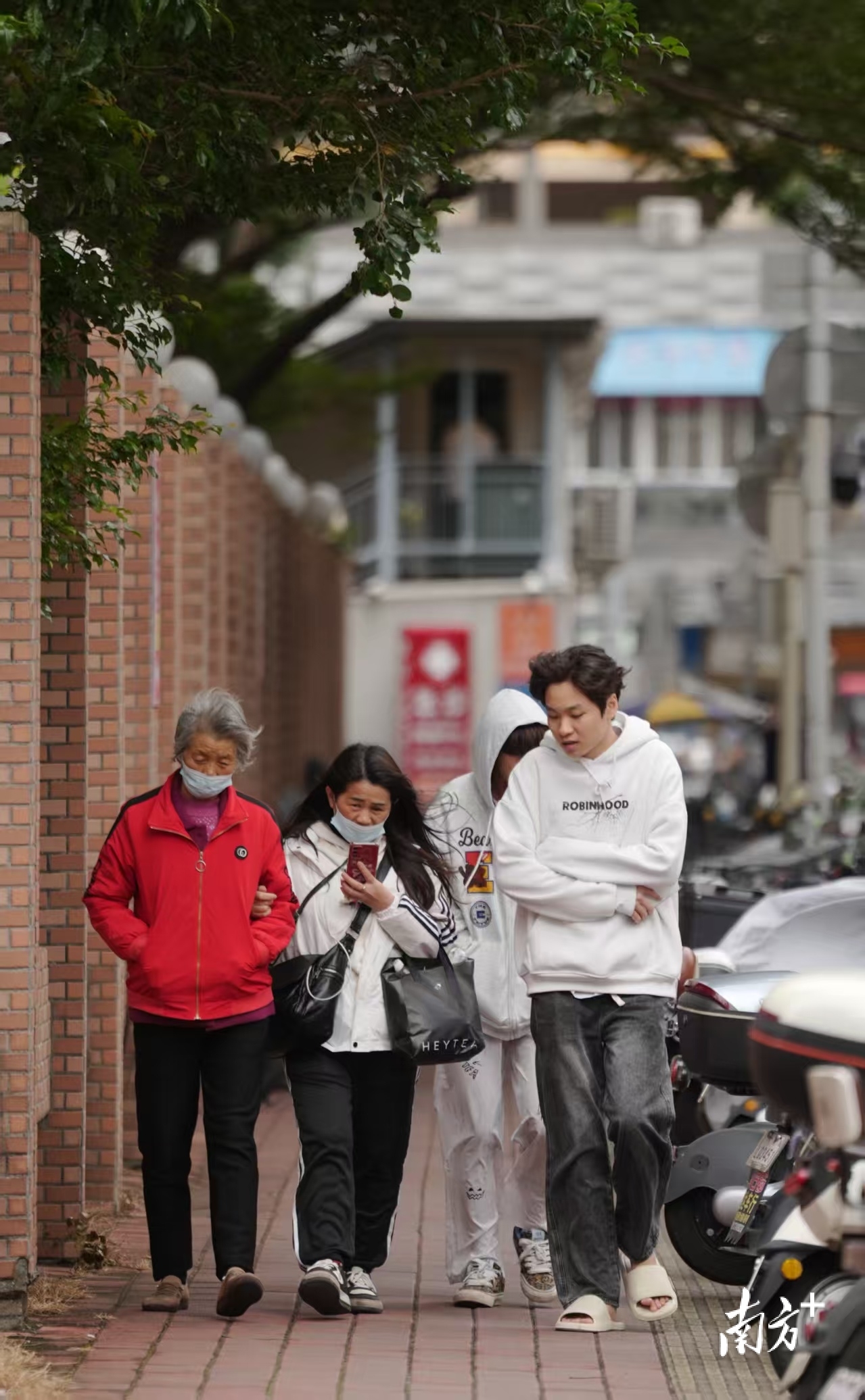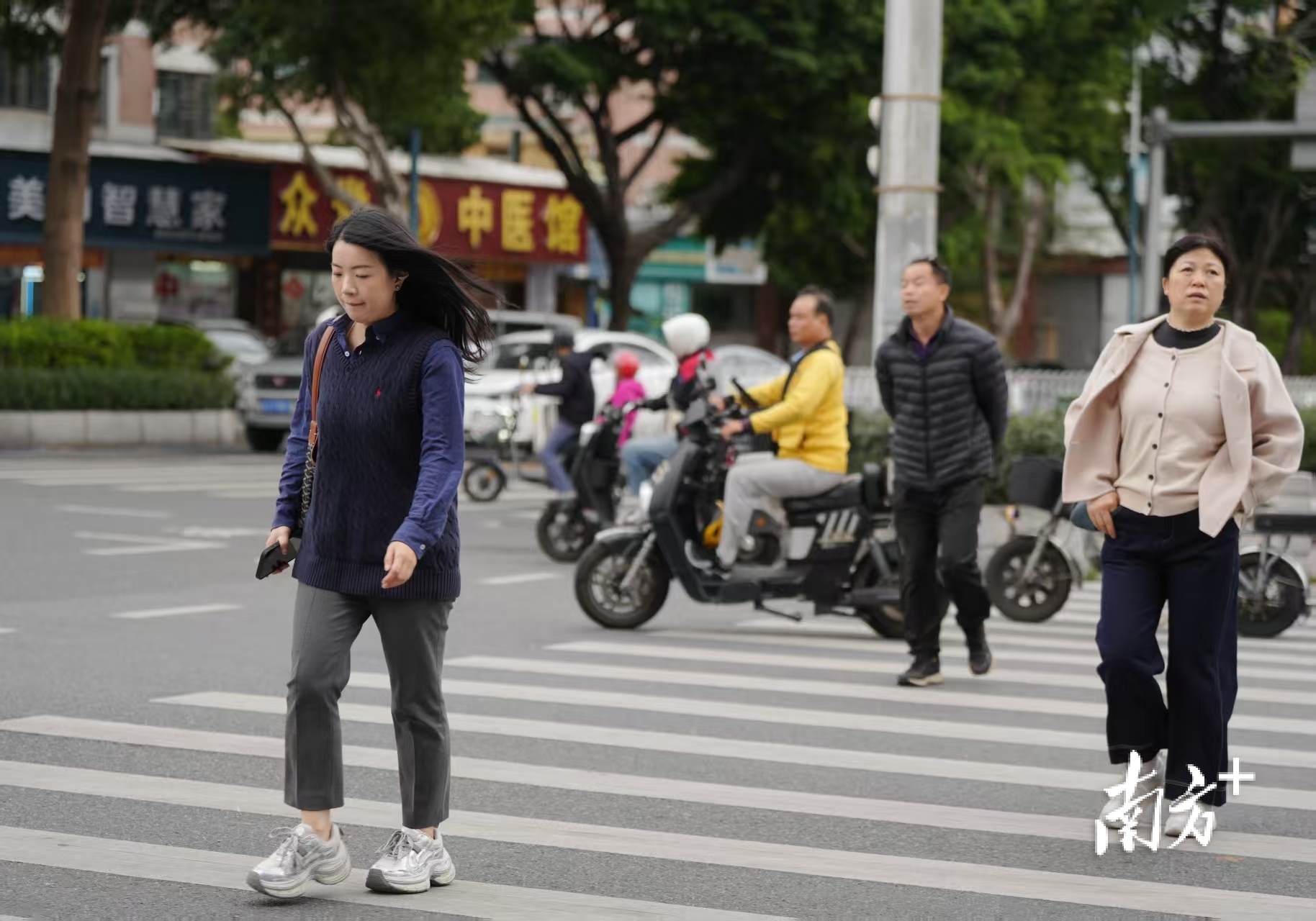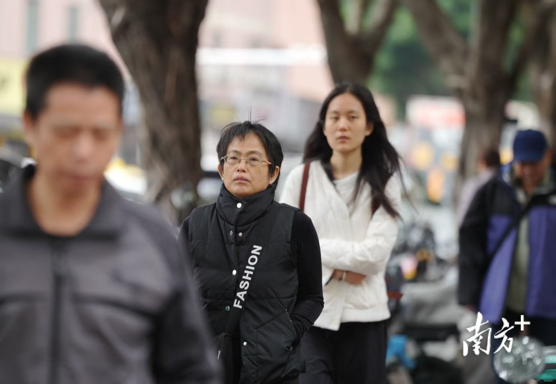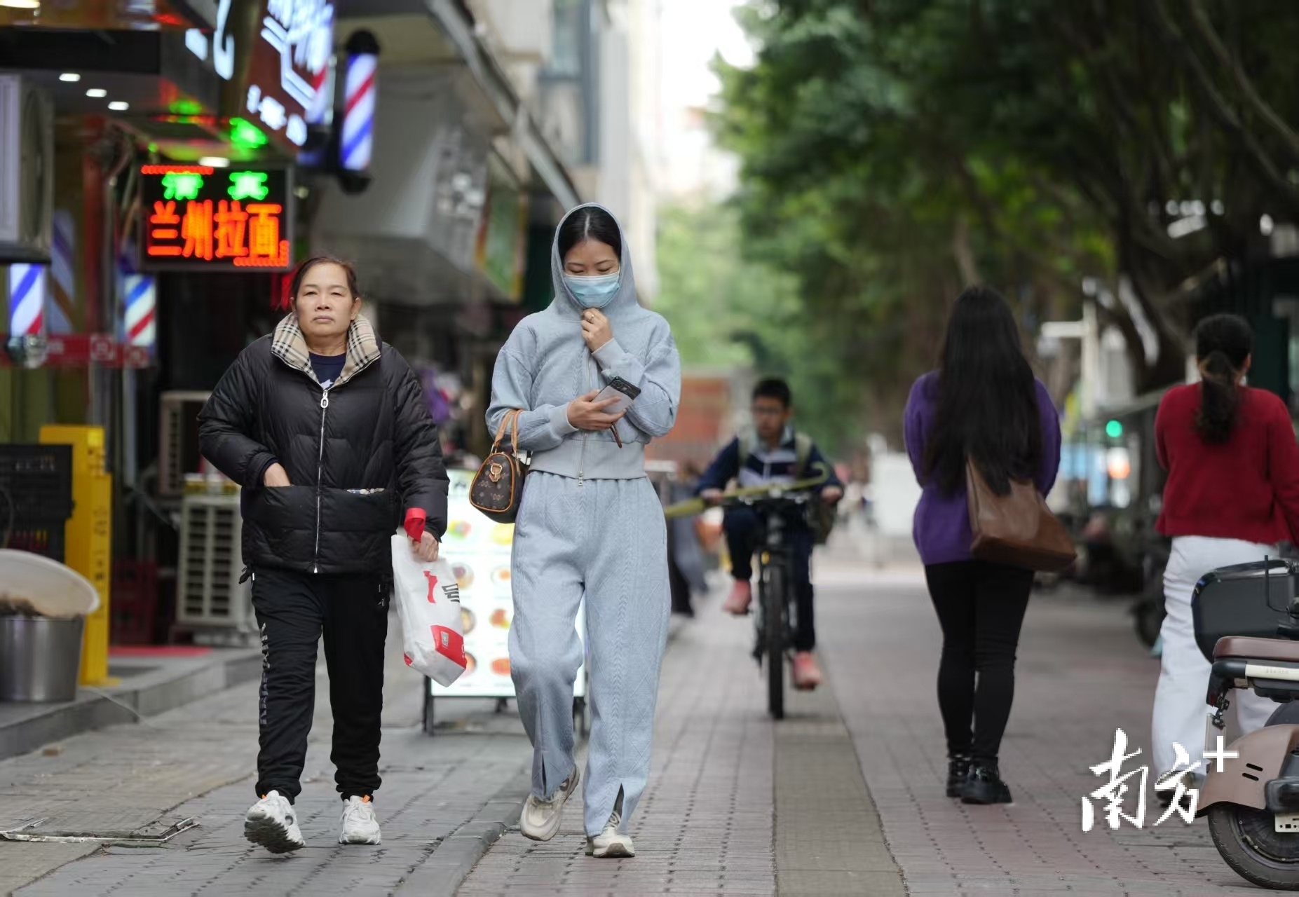 在广州市海珠区南洲北路,已有不少市民出行时穿上棉袄、大衣等厚衣物。