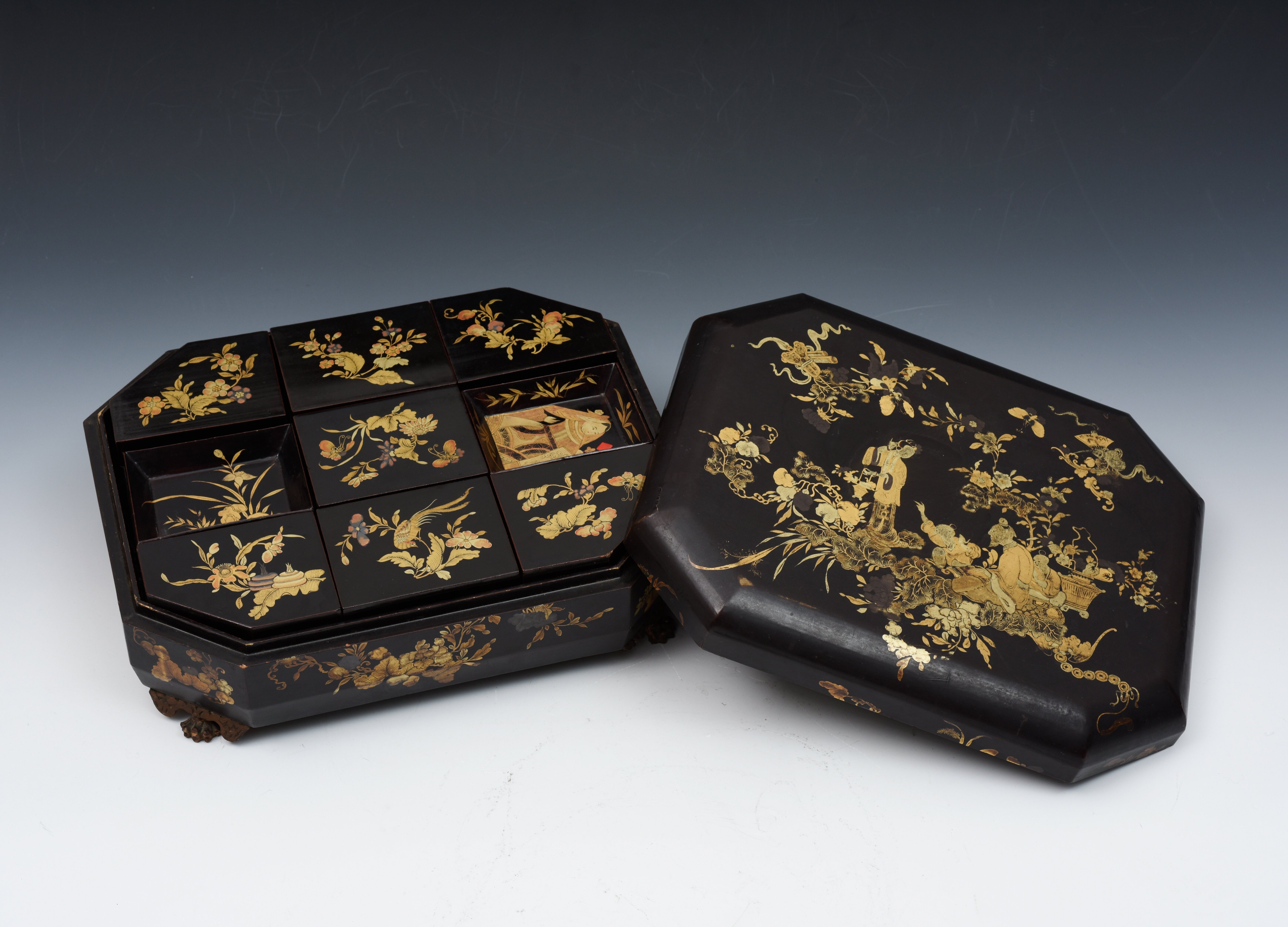 19世纪黑漆描金人物故事纹八边形游戏盒。