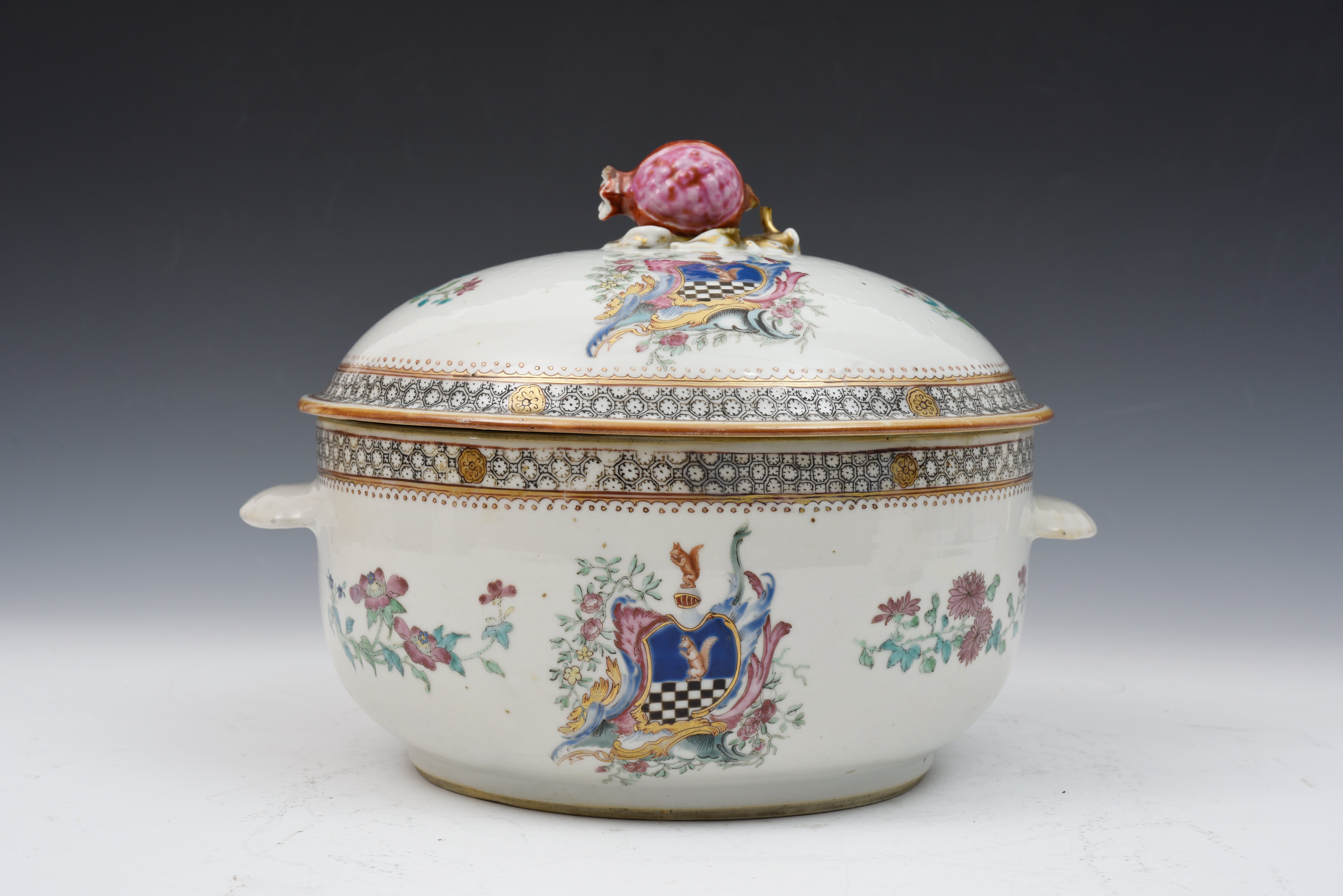 清乾隆广彩描金石榴钮纹章汤窝。