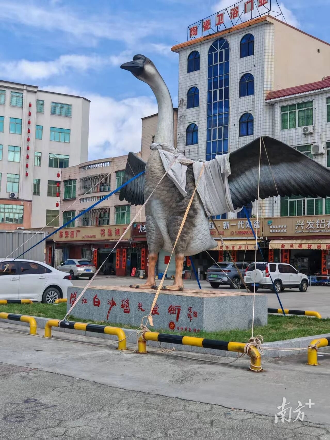 近日,台风“桦加沙”登陆阳江,给当地带来严重风雨浪潮影响。为守护白沙这只“网红大鹅”雕塑,在台风来临前,江城区白沙街道提前为它做好了“五花大绑”的防护措施。如今,风雨过后,经过工作人员的及时维护,大鹅已“满血修复”,在恢复一新的街道上迎风展翅,期待一场与您约好的“见面”!