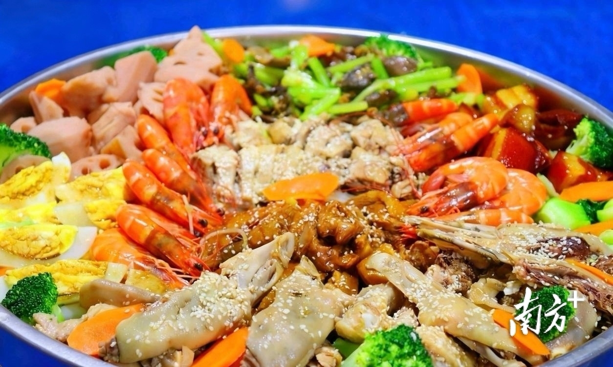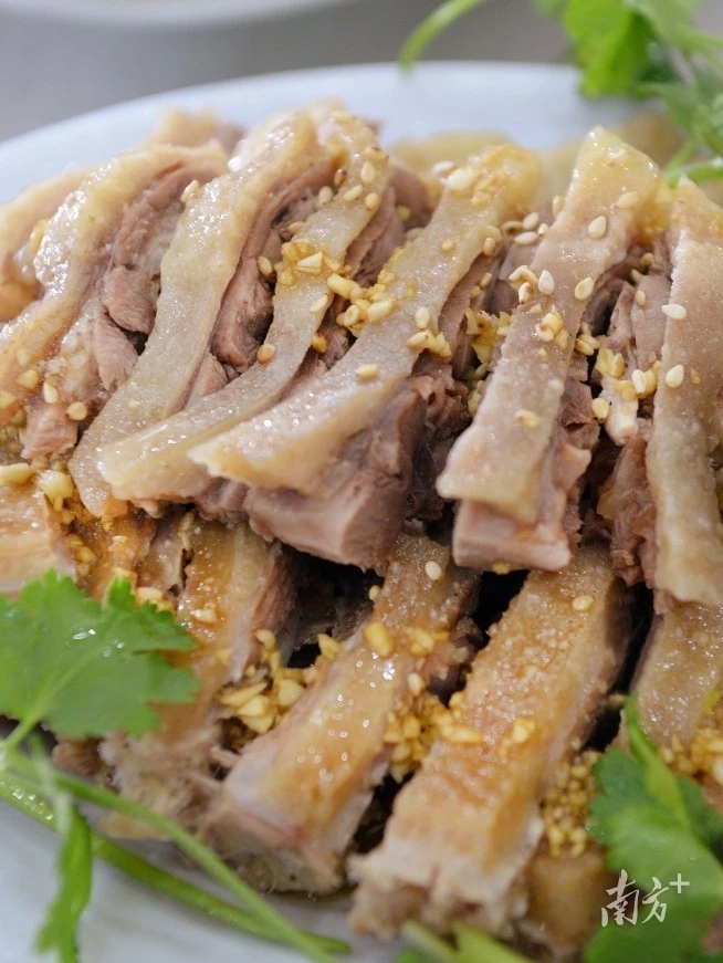 而全鹅宴的菜品,融合了阳江的传统烹饪技艺,如头牌菜——入选市级非遗名录的白沙麻香白切鹅,制作过程十分讲究。要挑选3到5年以上的鹅乸,宰杀去毛洗净后,用盐按摩,再放入高汤中文火浸泡3小时,之后用纯净水快速冷却,锁住鲜味。切件拼盘后,淋上用炒香研磨的芝麻和上好花生油调制的麻香酱汁,麻香扑鼻、口感绝佳。