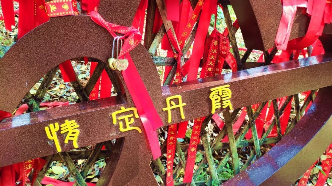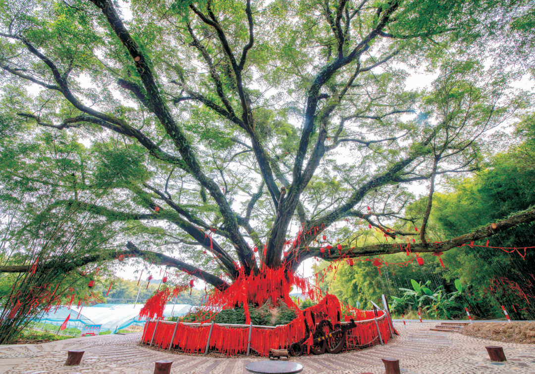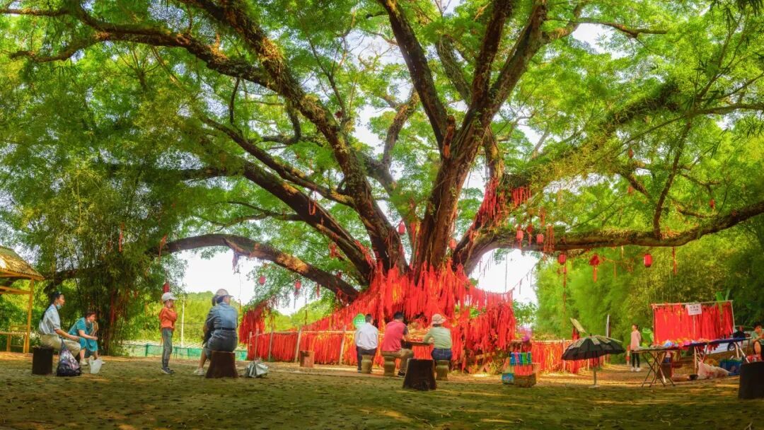 从丹霞山南门出发,沿阅丹公路行驶约六公里,远远就能望见一棵巨大的古榕树。枝干舒展,树冠如盖,树上系满红色丝带,随风飘动。