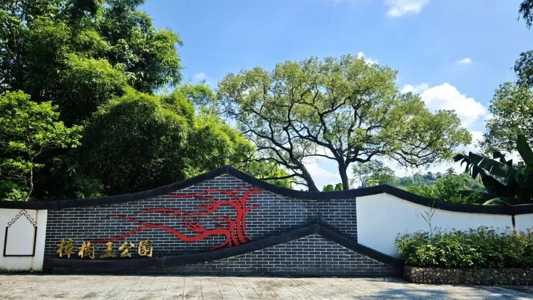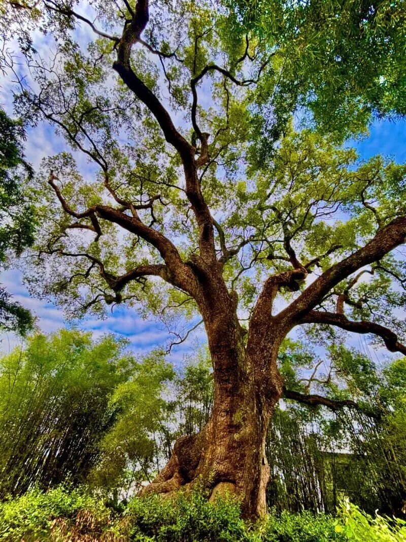 树干需七八人合抱,主干分成三大枝,每一枝都粗壮无比。树根部分根瘤虬结,形态奇特。满树新绿,站在树下抬头望,整个世界都是绿色的。公园周边是张氏三公祠,典型的岭南传统宗祠建筑,古风古韵。