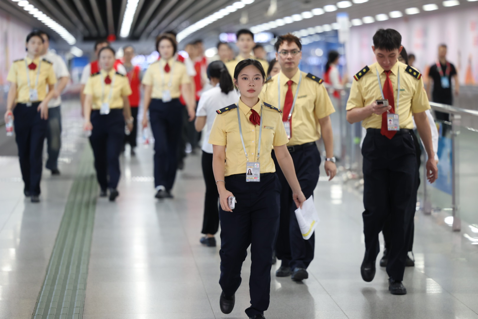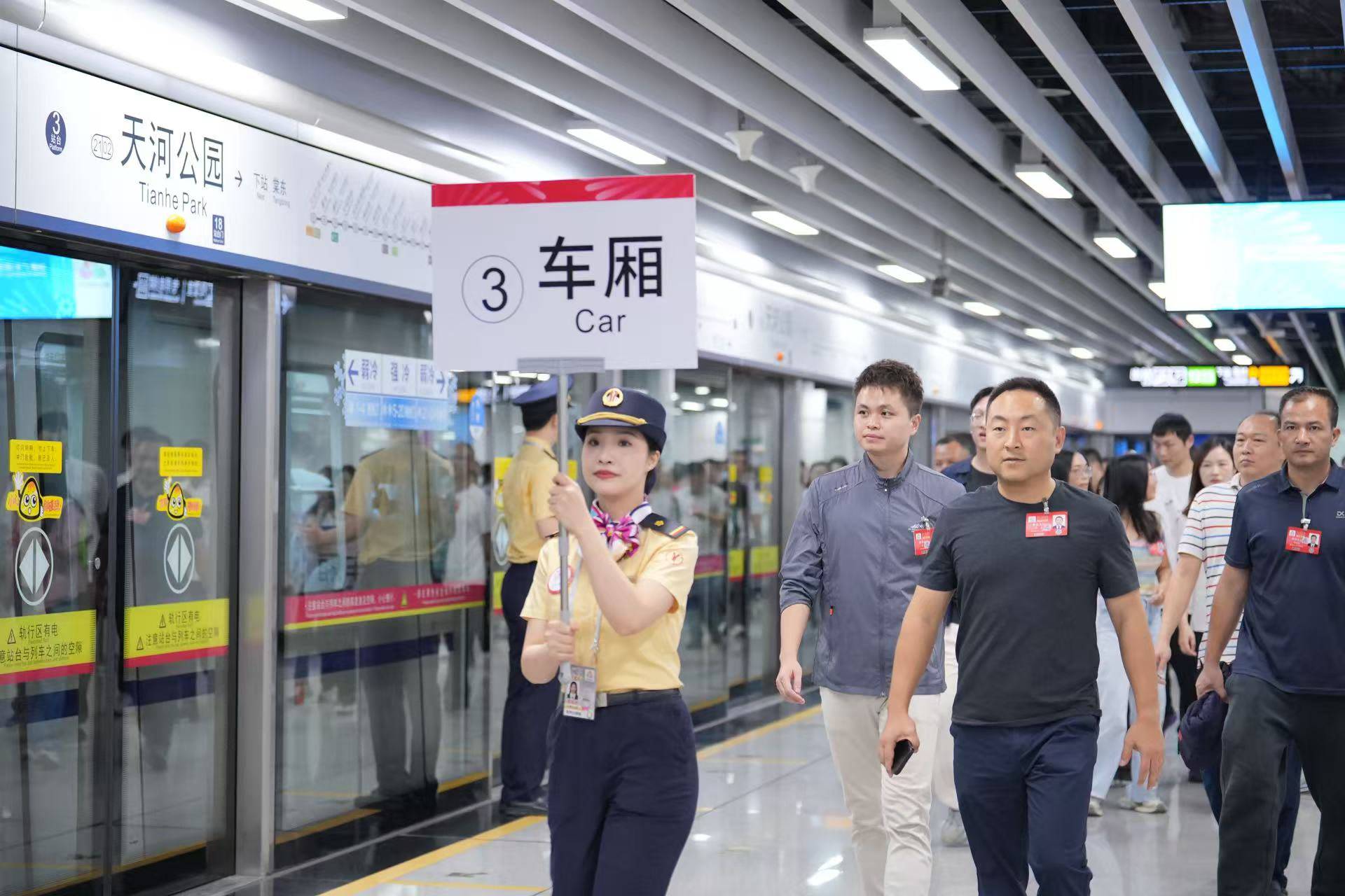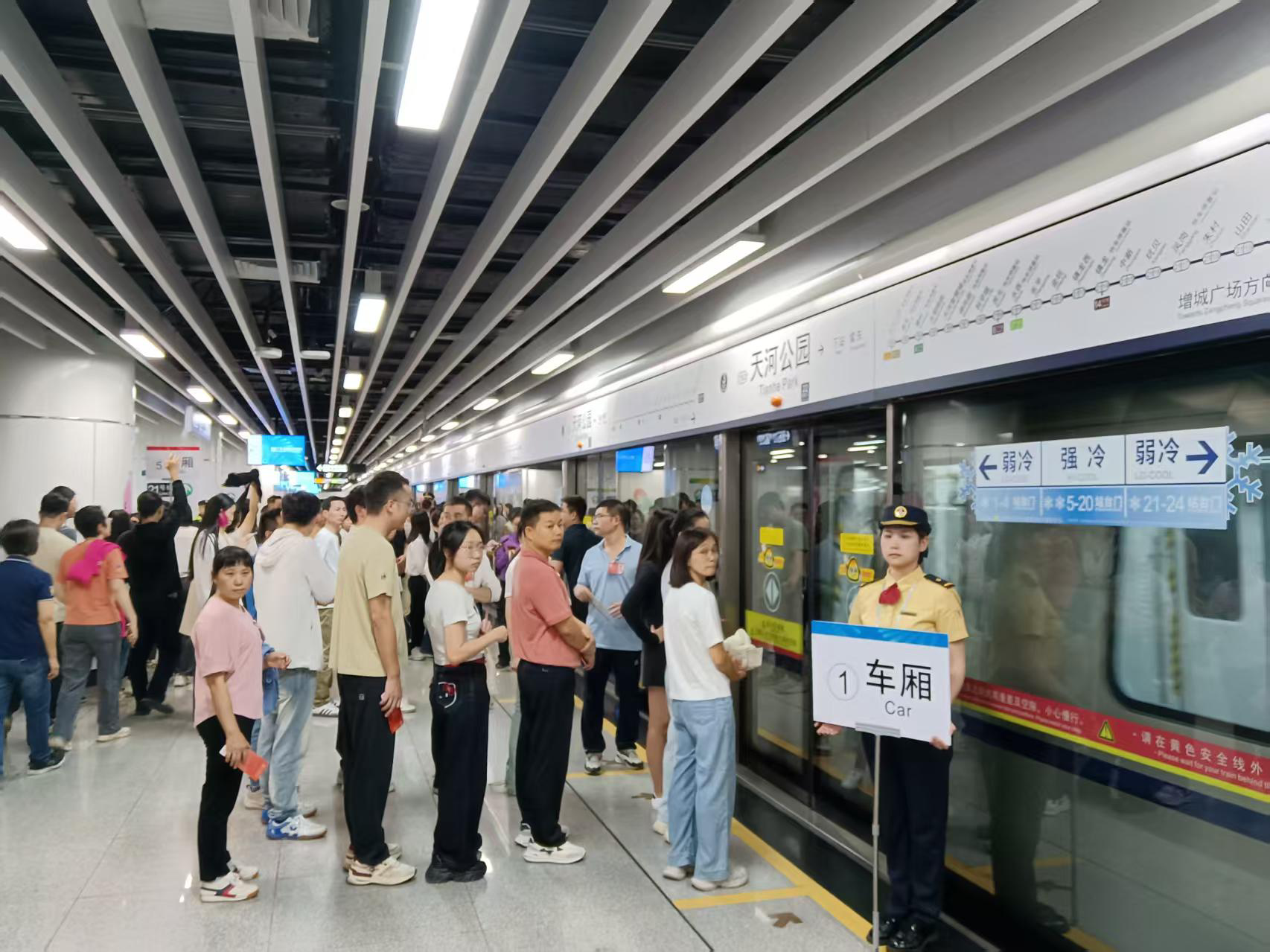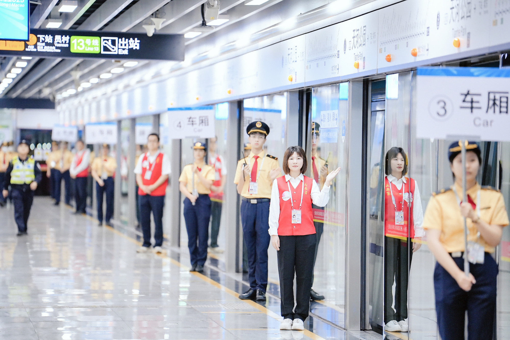 14:20,天河公园站地铁车厢引导员整装待发。