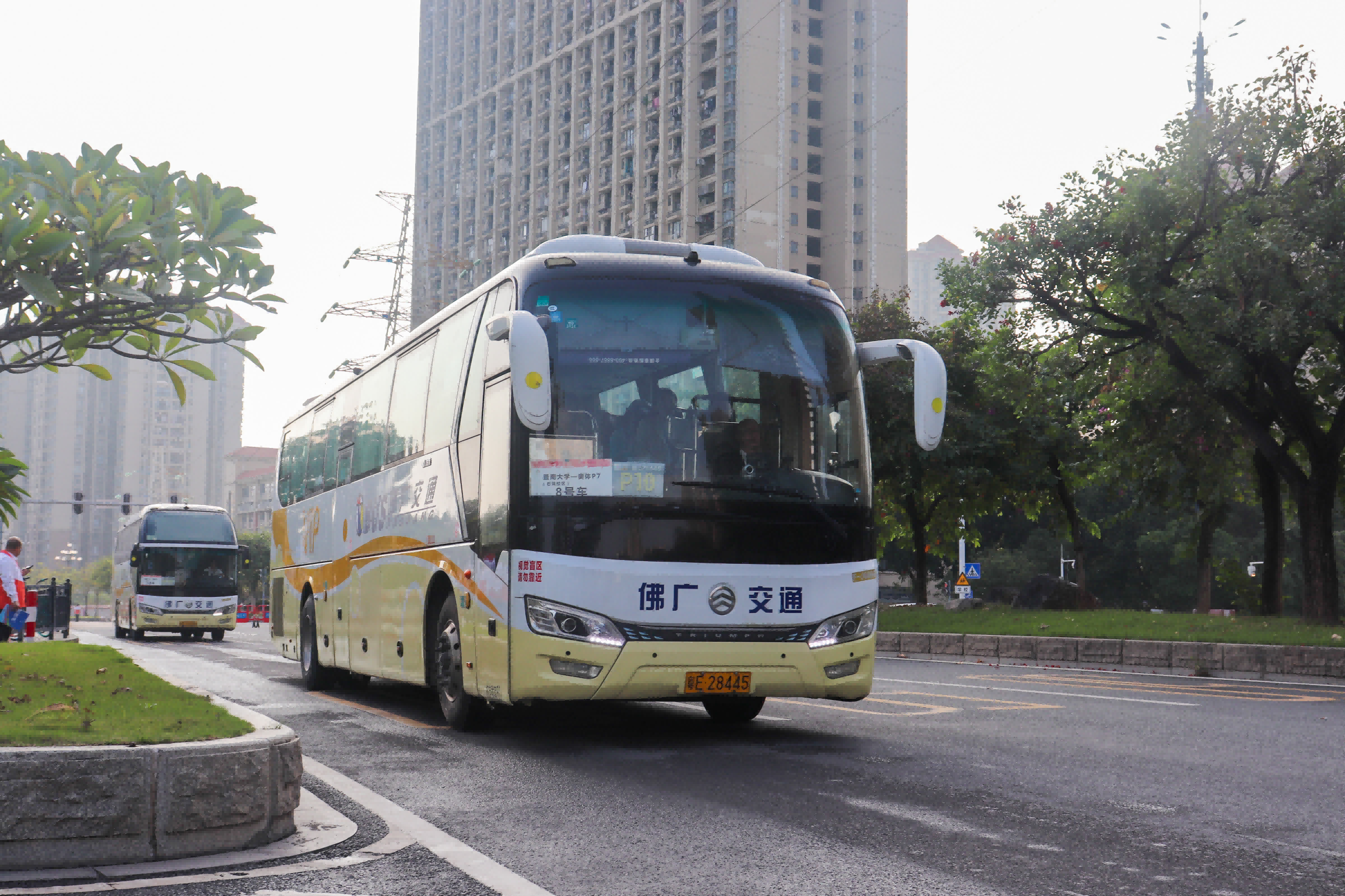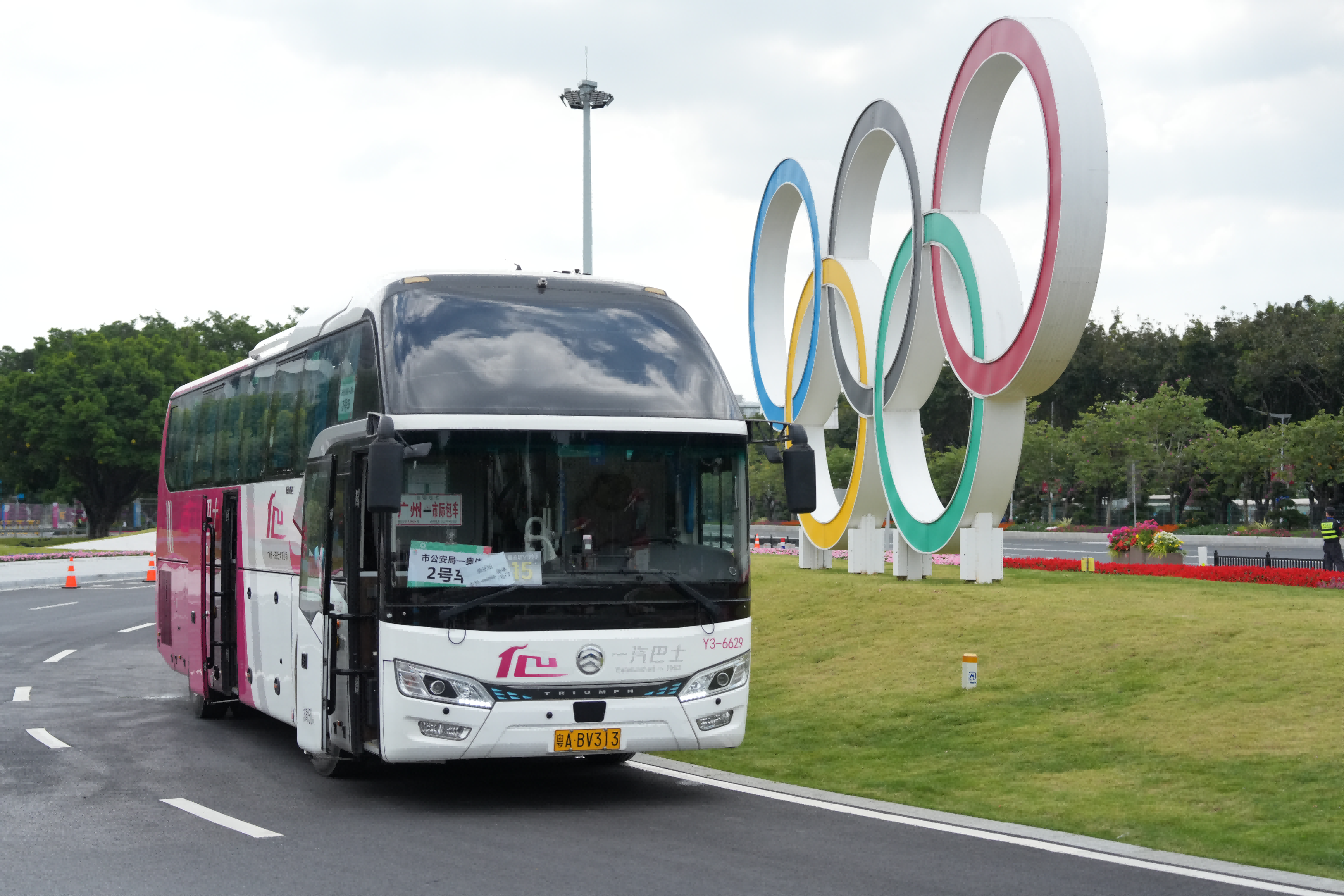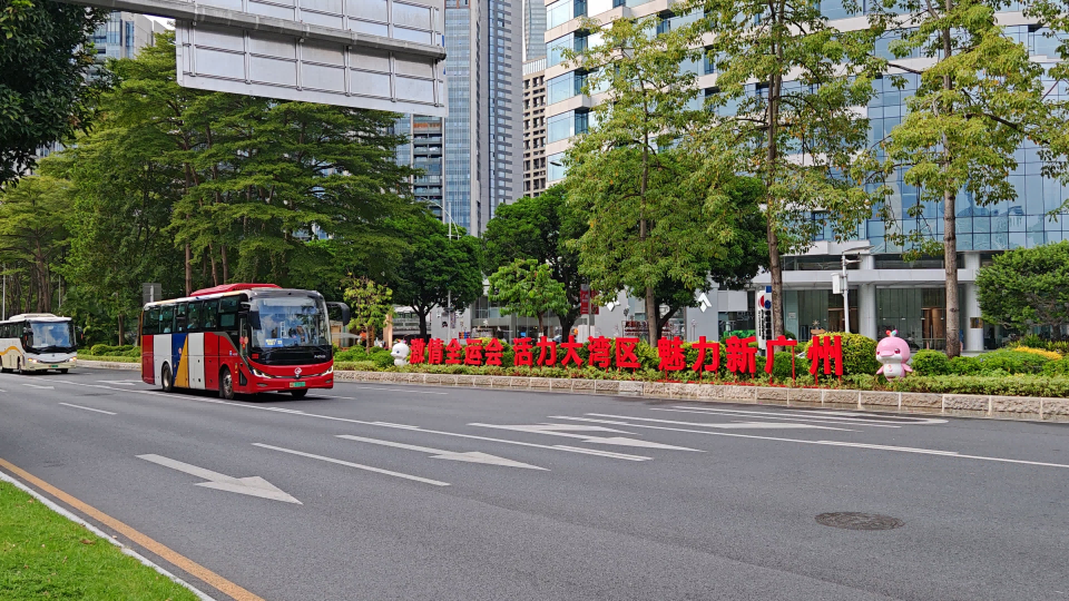 15:00左右,广州巴士集团交通运输保障专车陆续护送观礼运动员经过临江大道中,前往开幕式场馆。