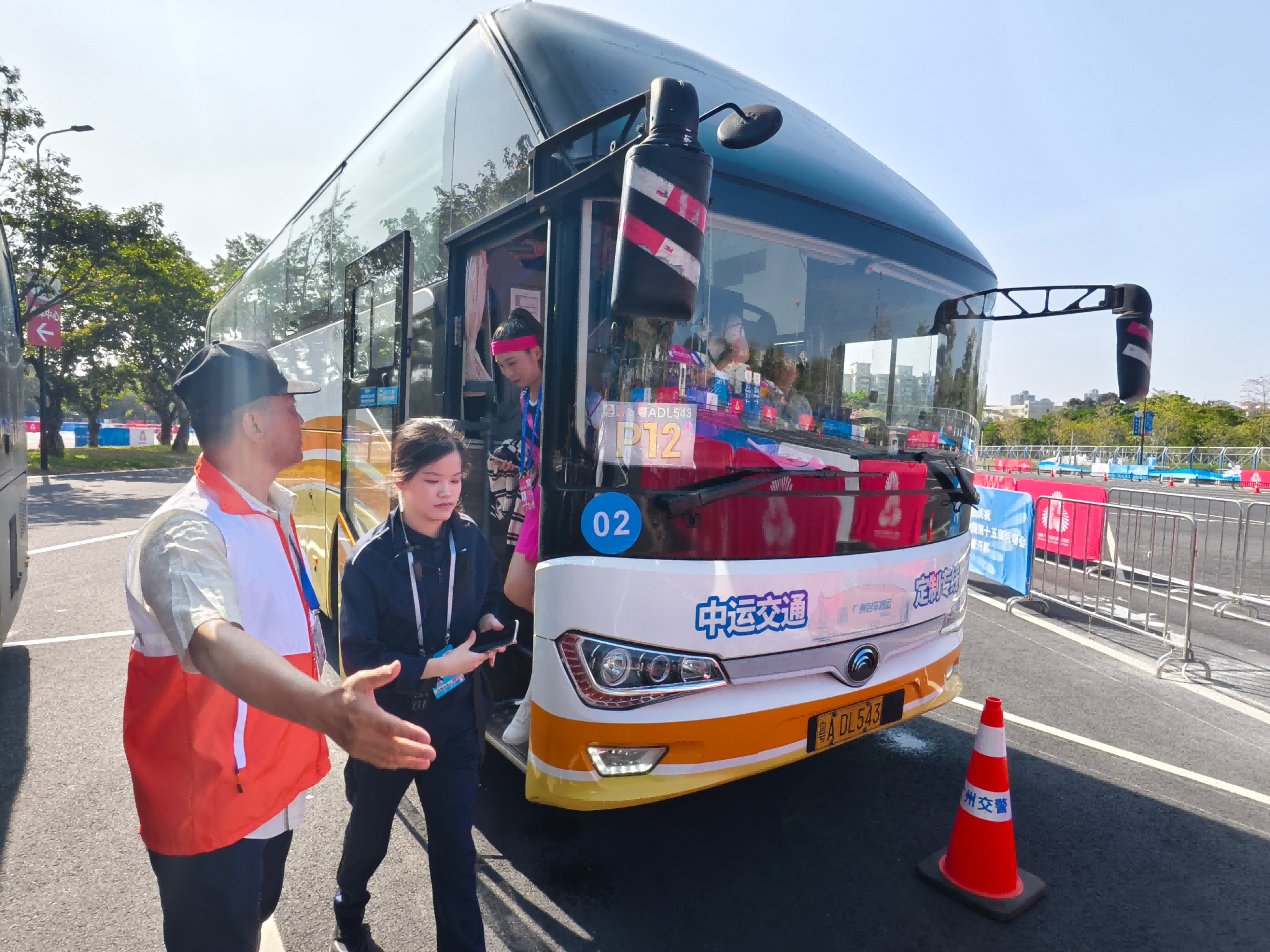 9时许,奥体P7区域,广州巴士集团第三批志愿者接驳专车到位,交警护航保障出行秩序。