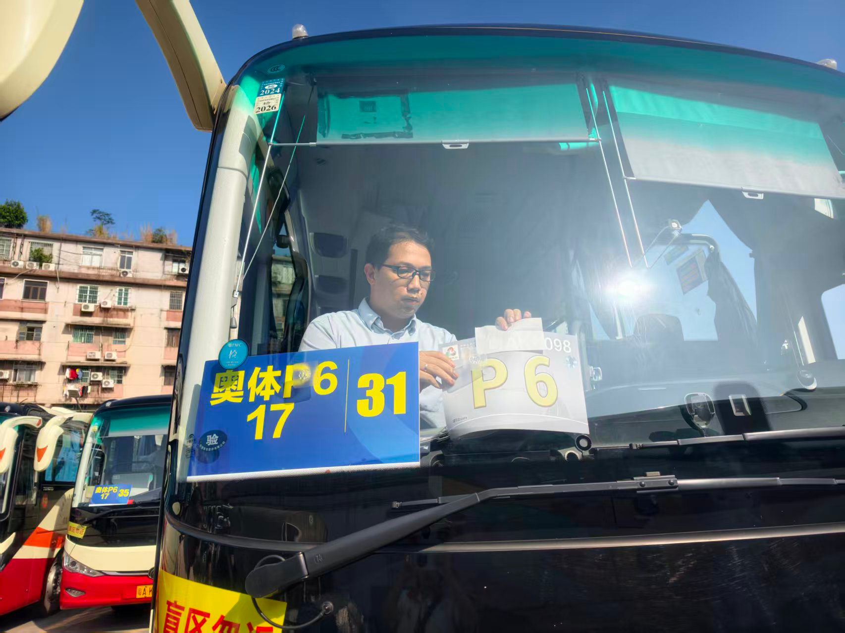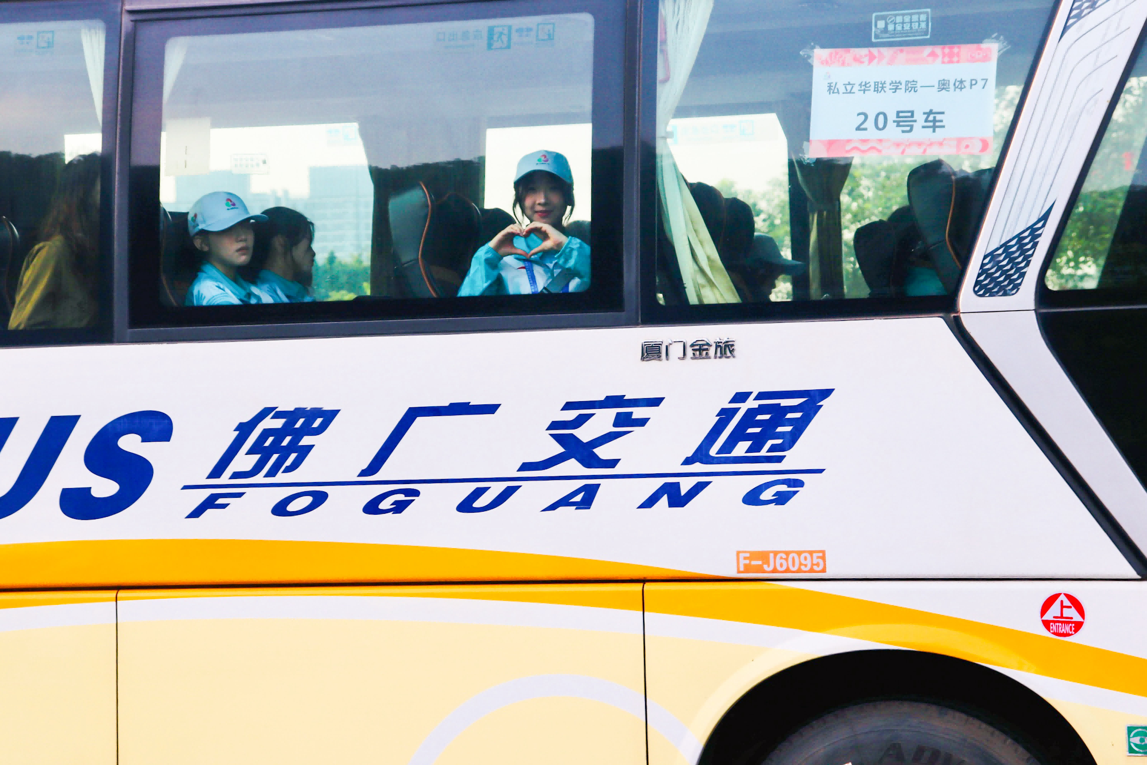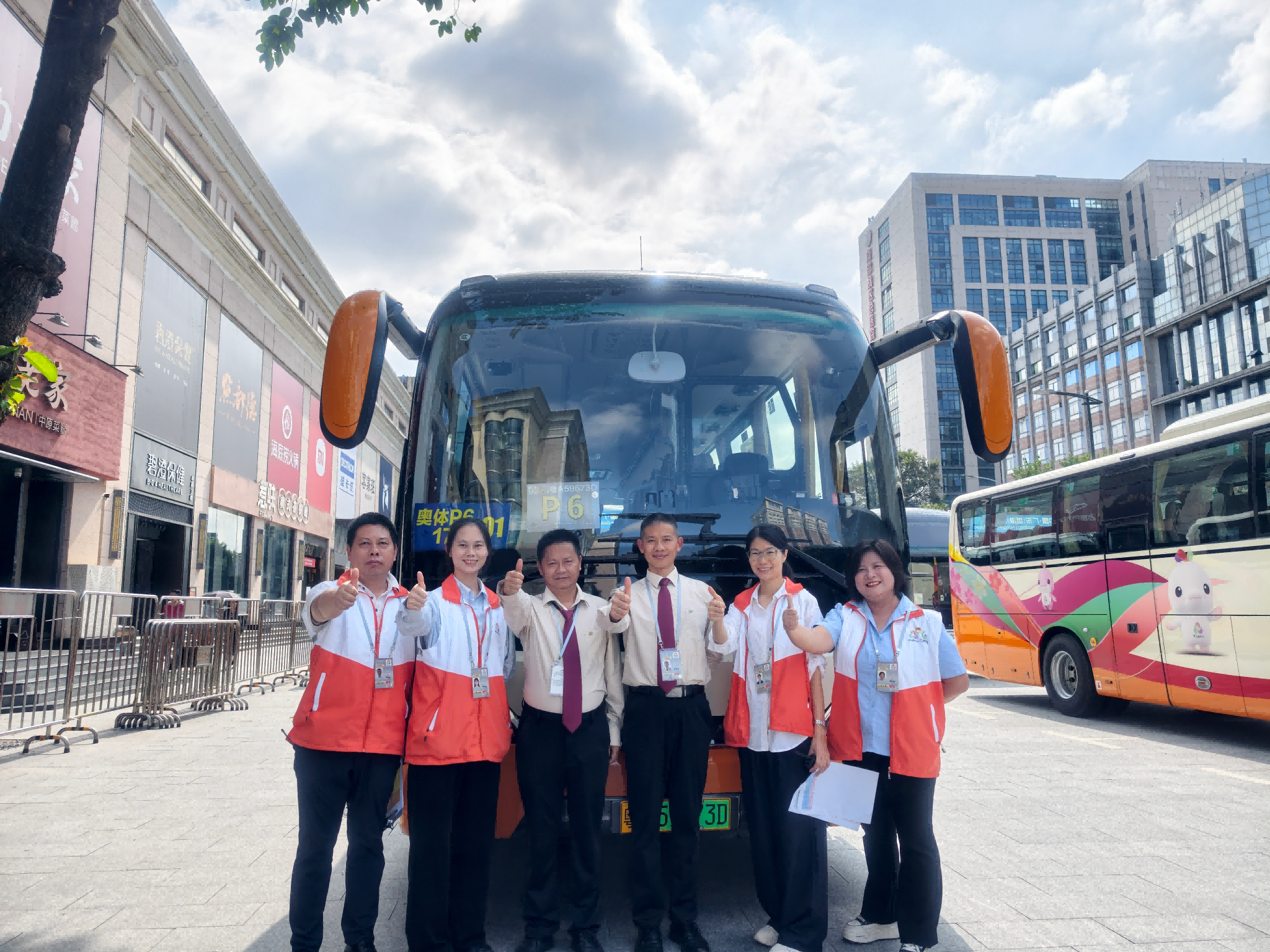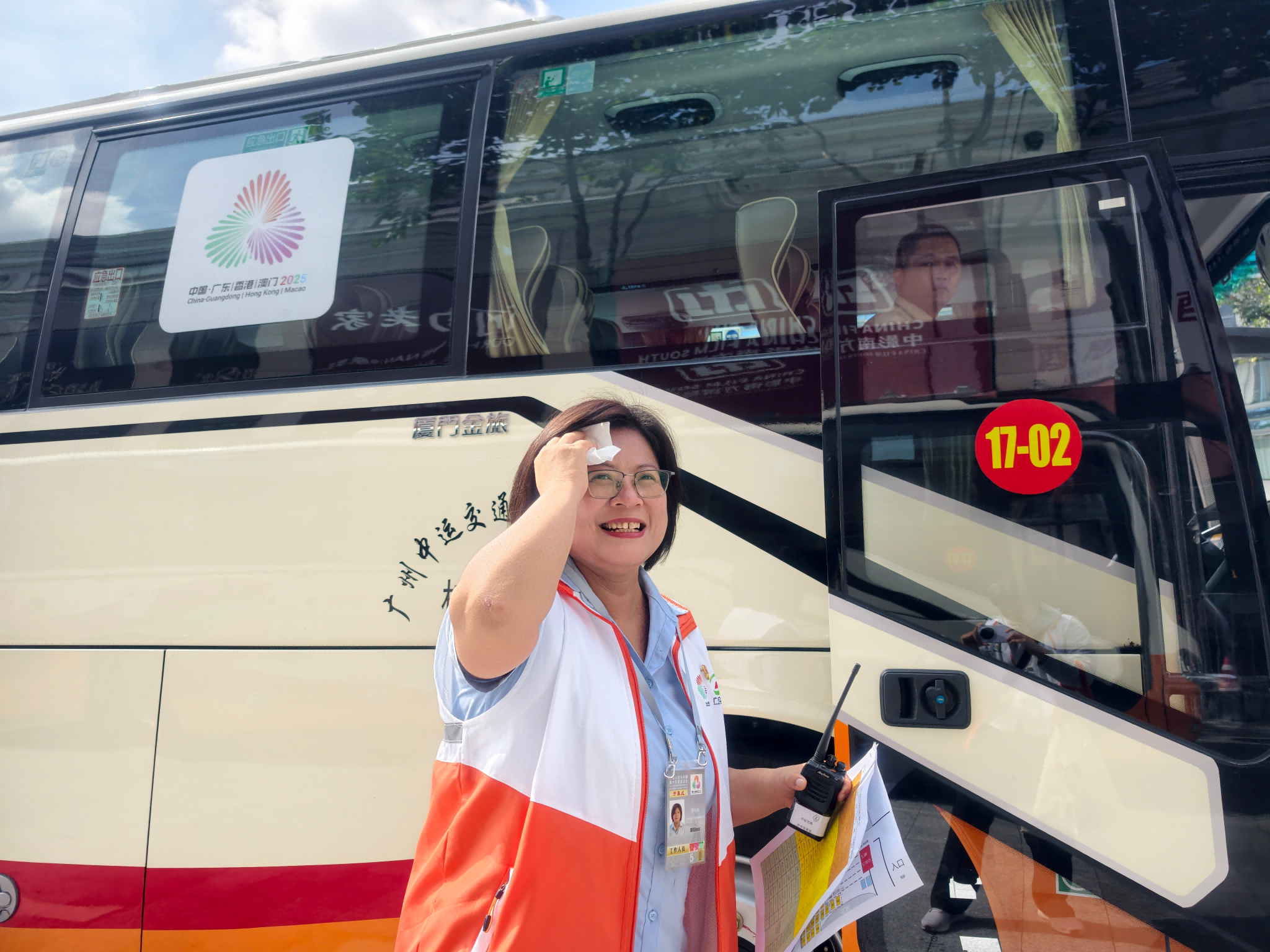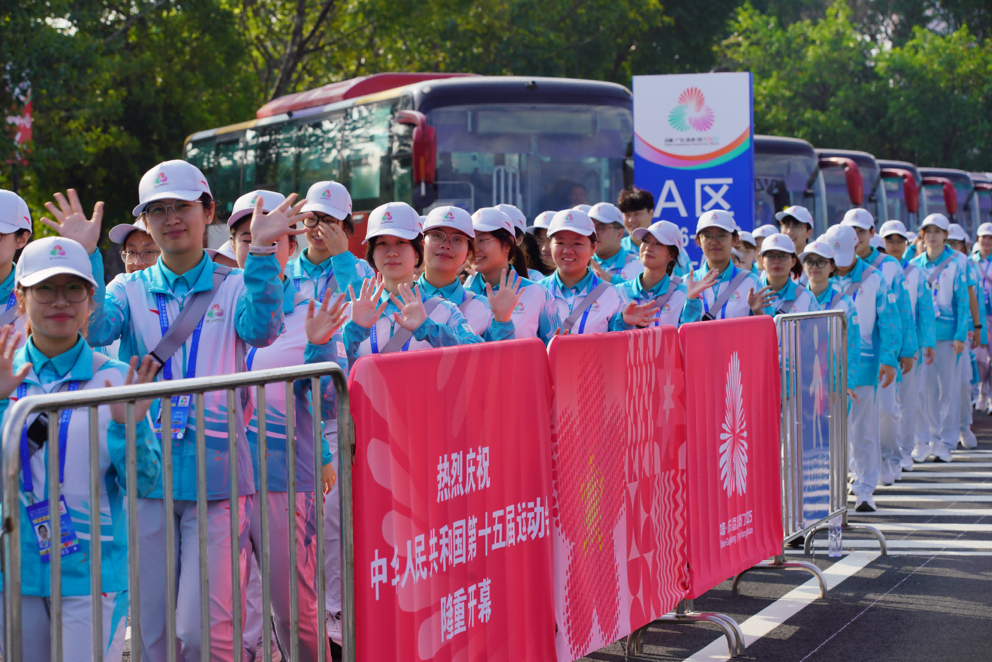 上午约8时,广东奥体中心P7停车场,广州巴士集团交通保障专车排队入场,志愿者向工作人员比心致敬。