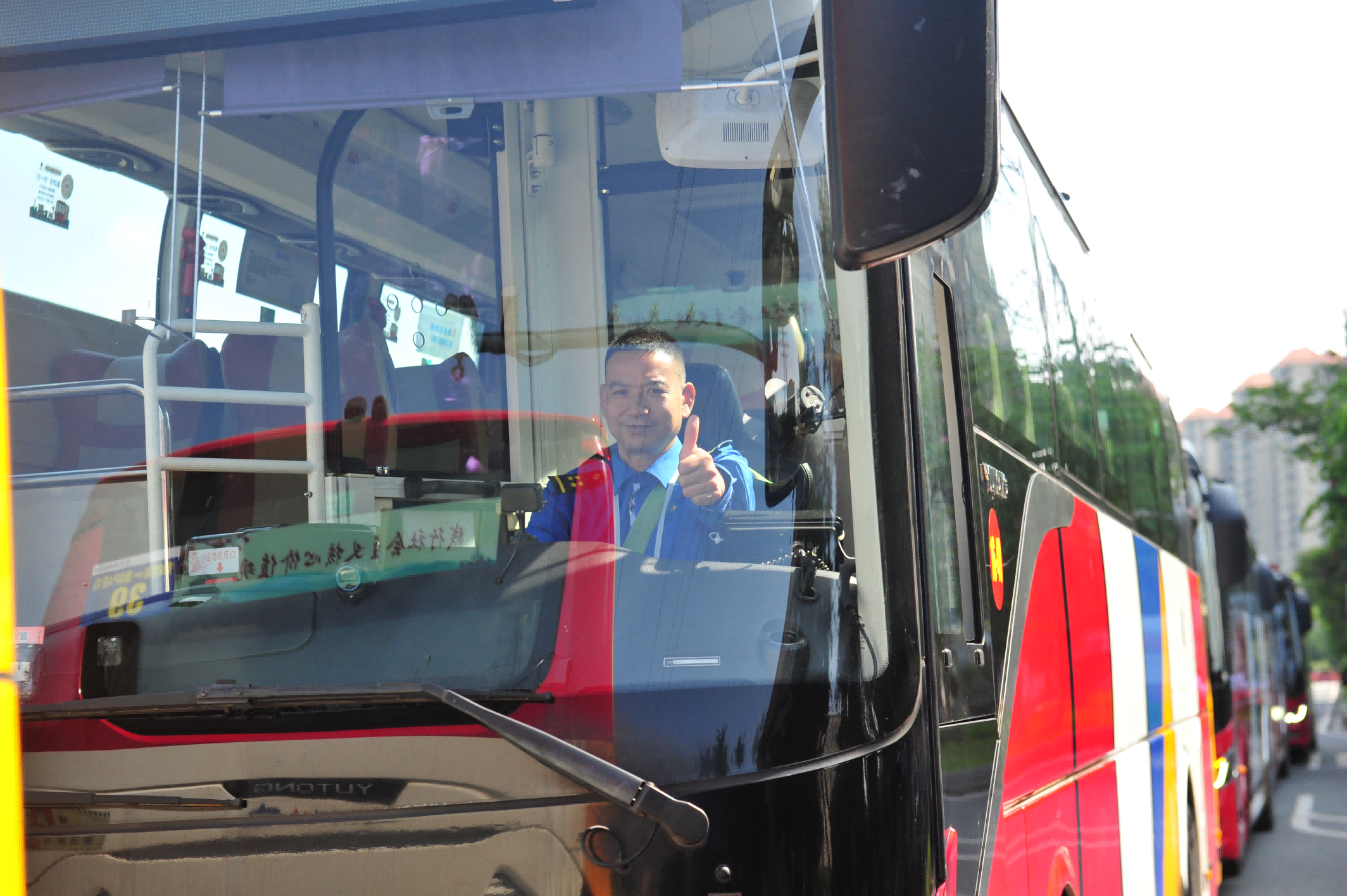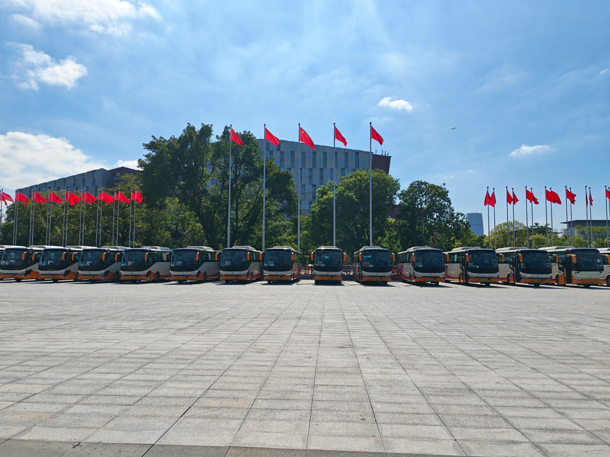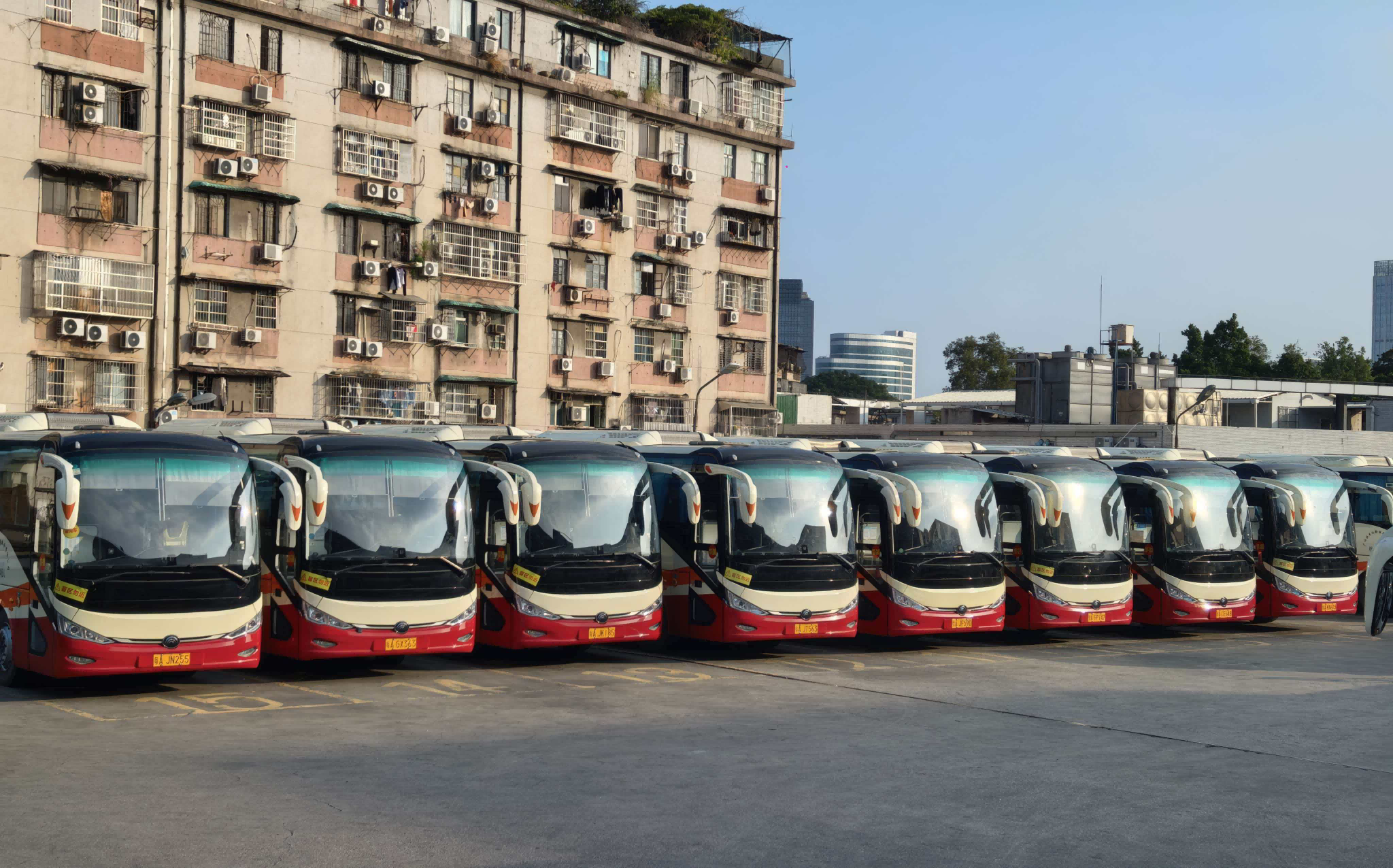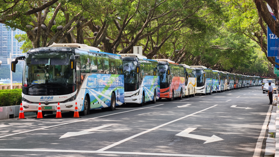 中午时分,二沙岛路段,广州巴士集团保障车辆整装待发。