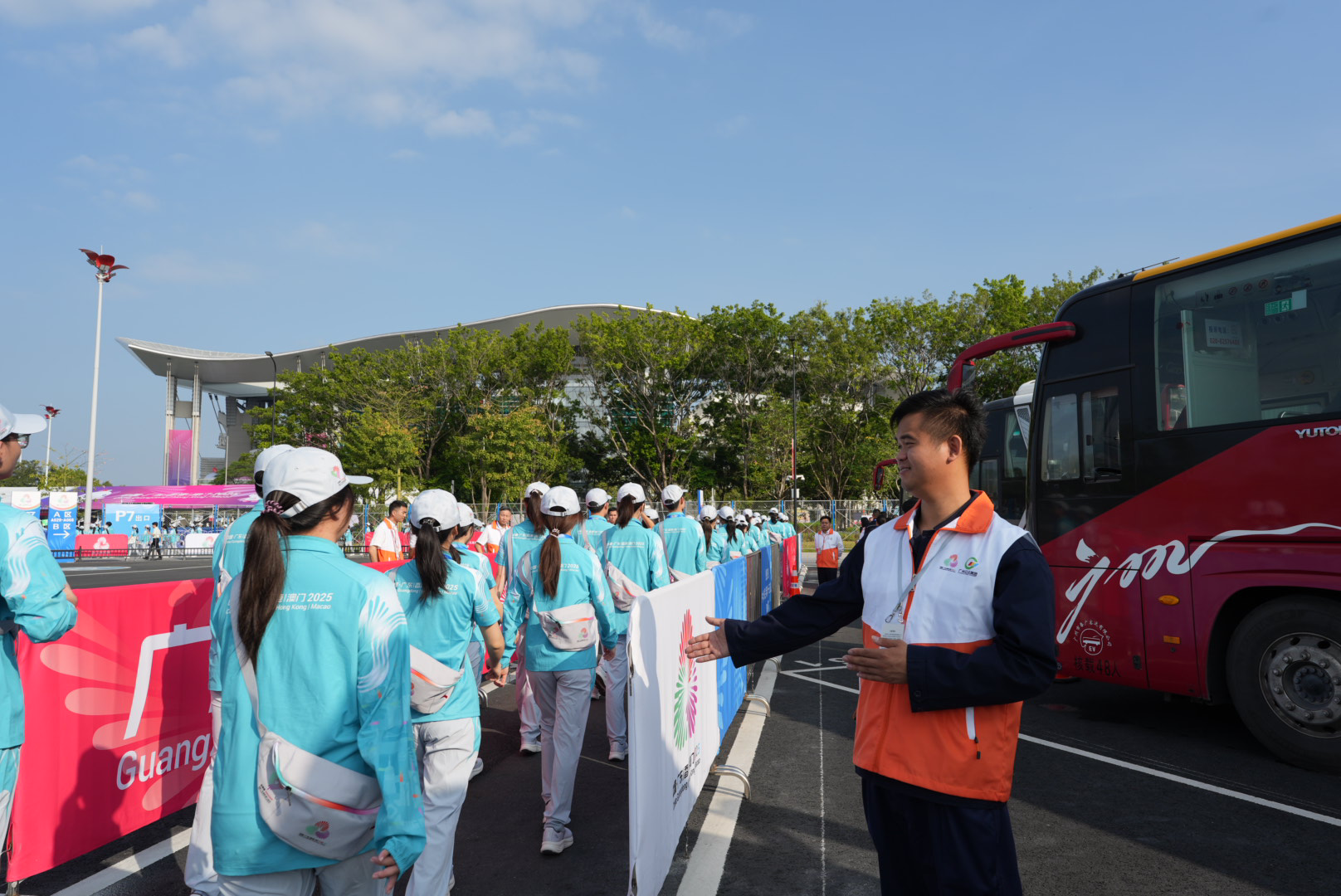 8:30,广东奥体中心P7停车场,广州巴士集团交通保障团队成员指引到达的开幕式志愿者前行。
