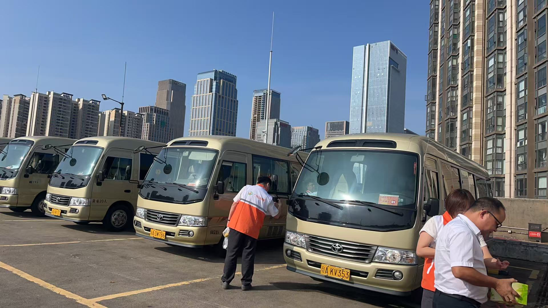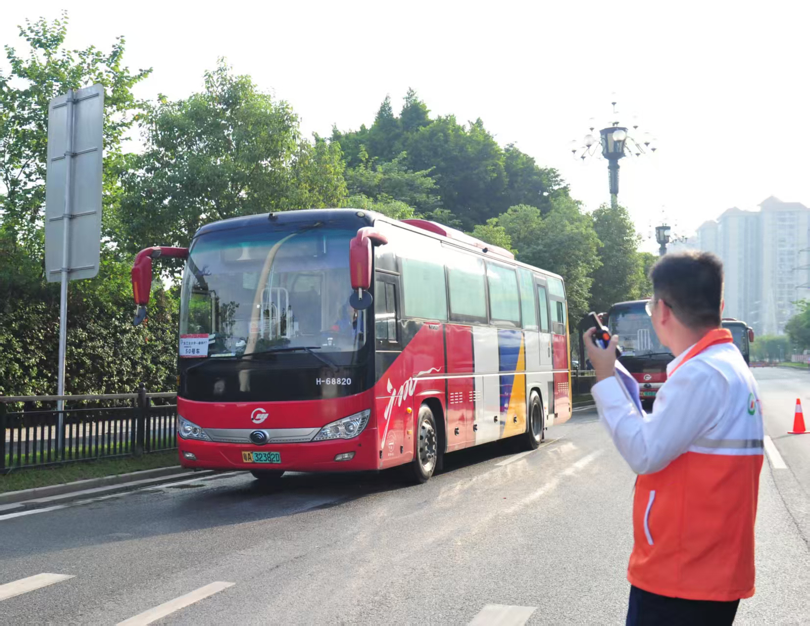 8:43,在远端集结点黄埔体育中心,广州巴士集团调度人员指挥车辆集结安检。
