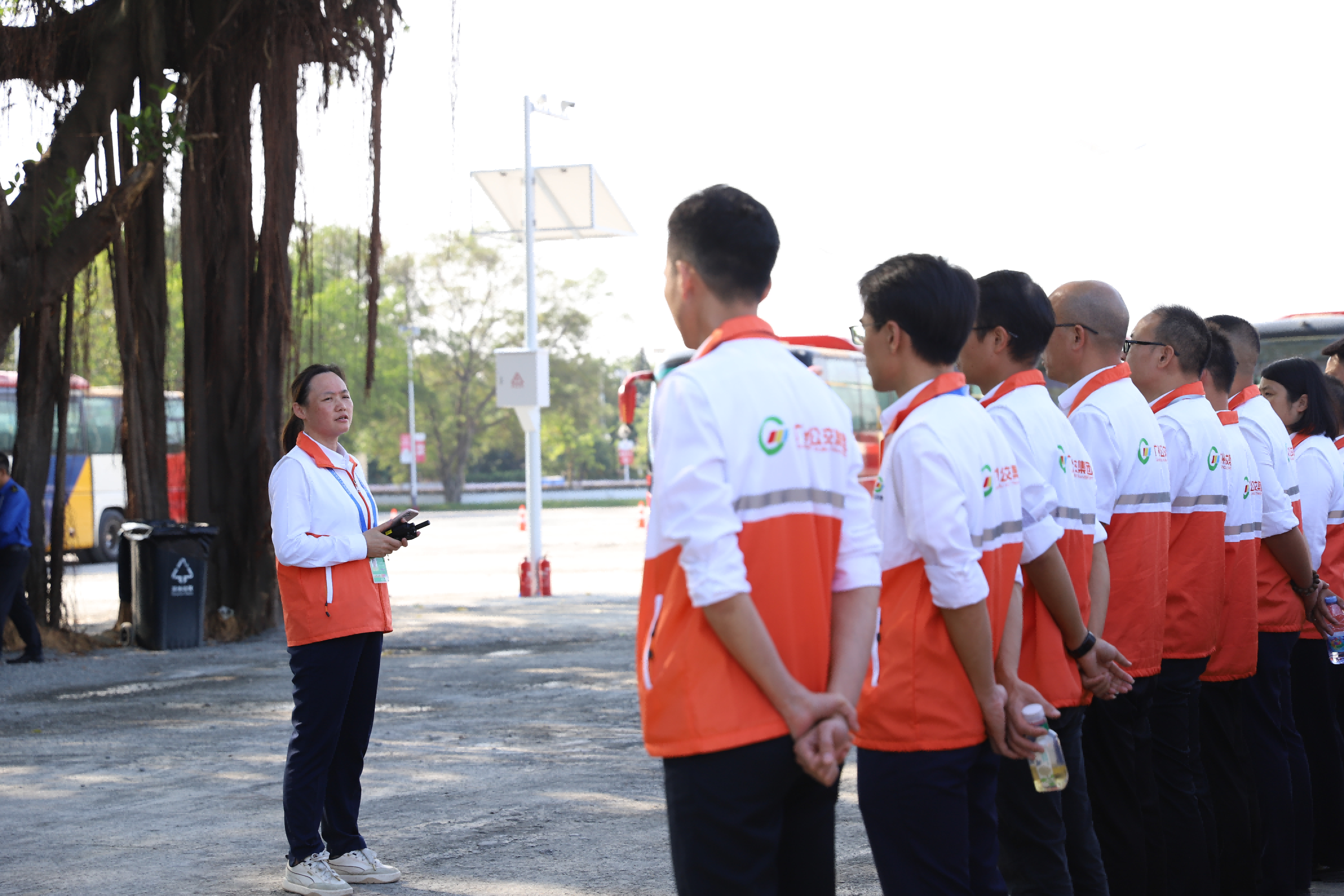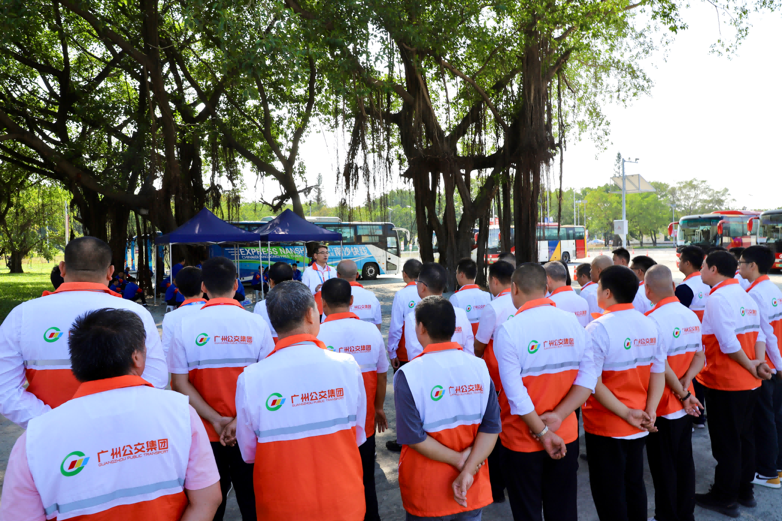 10:00,广东奥体P10停车场,广州巴士集团交通保障团队组织现场管理人员召开营运班前会。