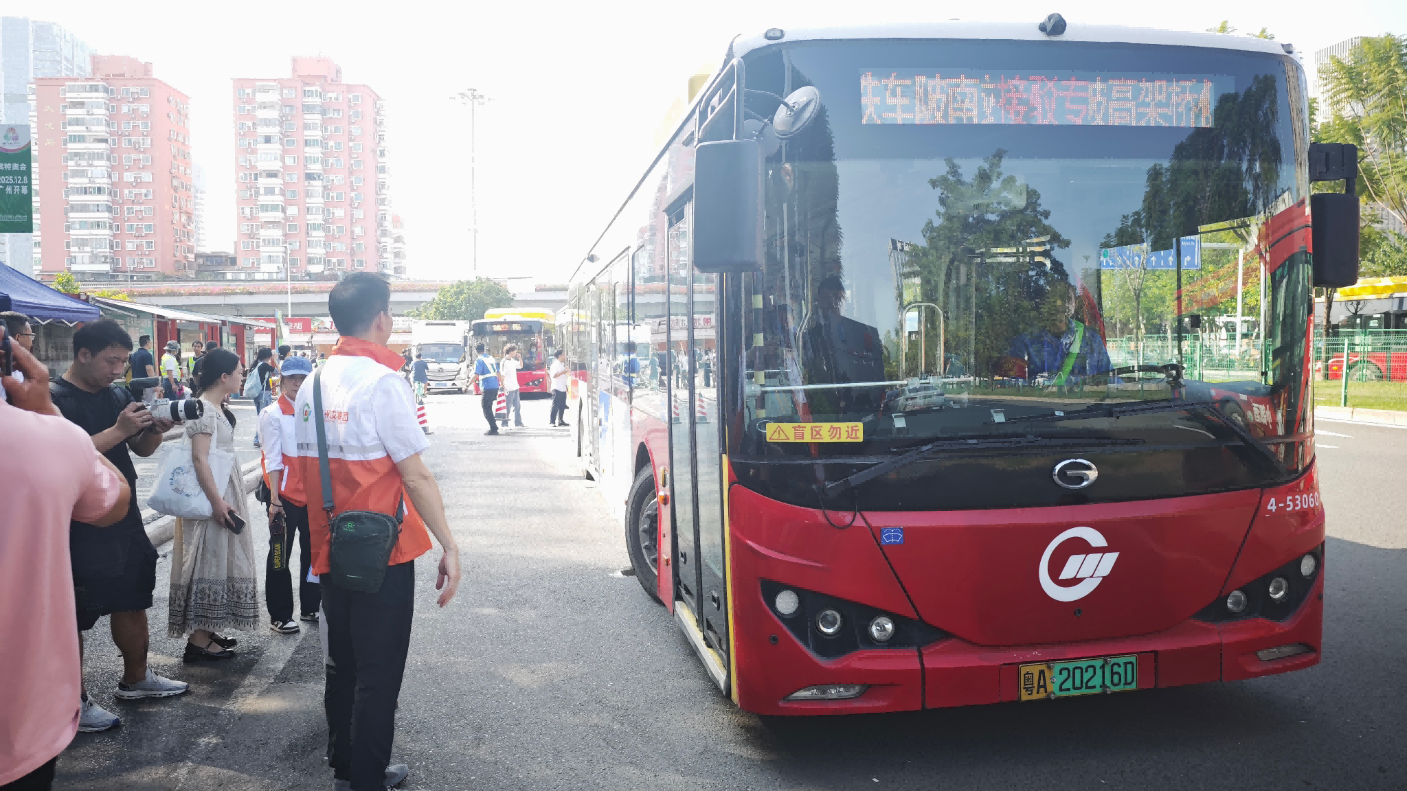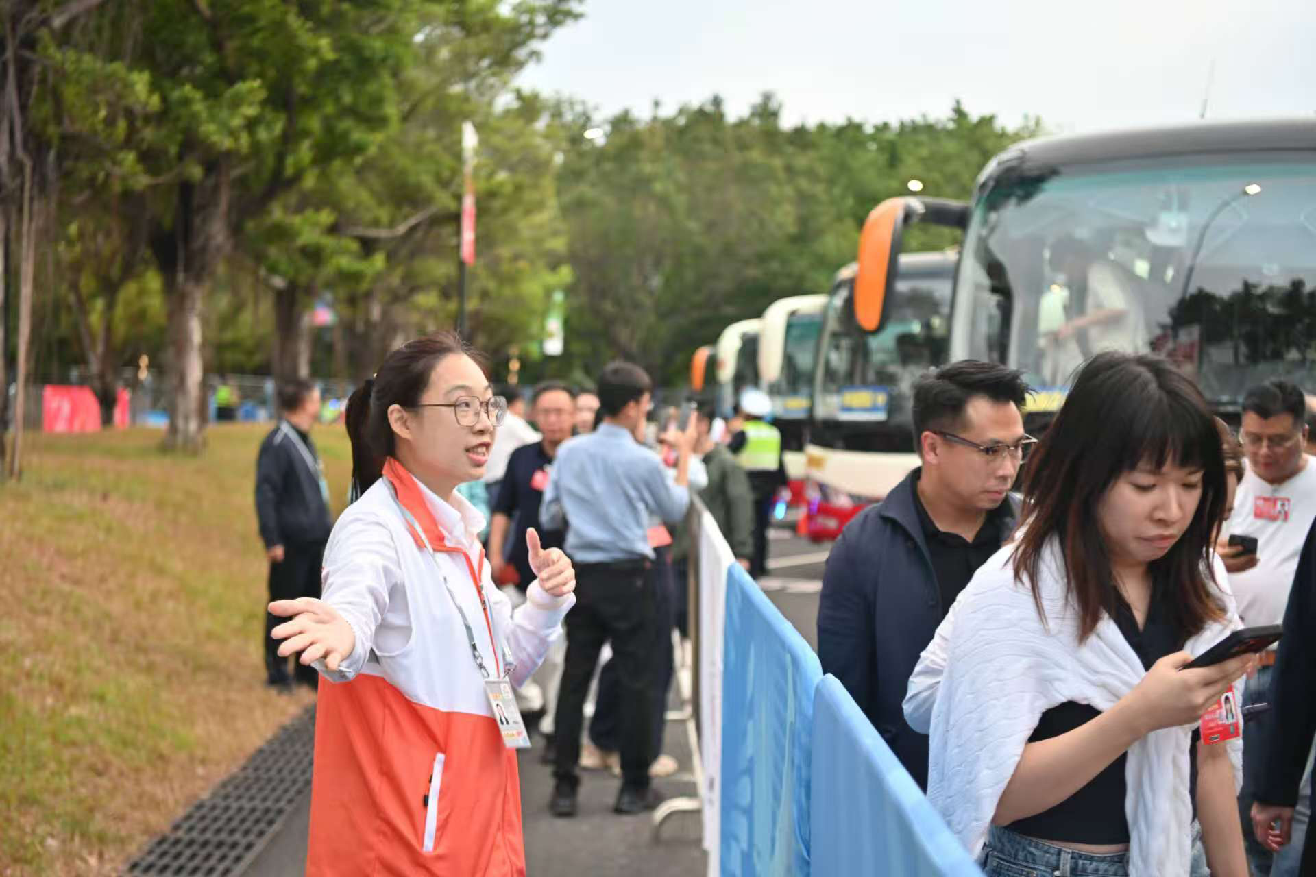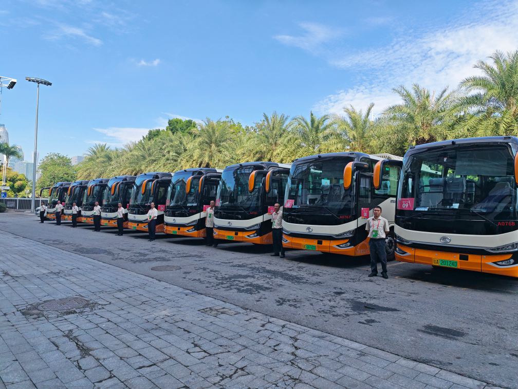 16时左右,P7停车场,广州巴士集团交通保障团队安全护送开幕式观众抵达。