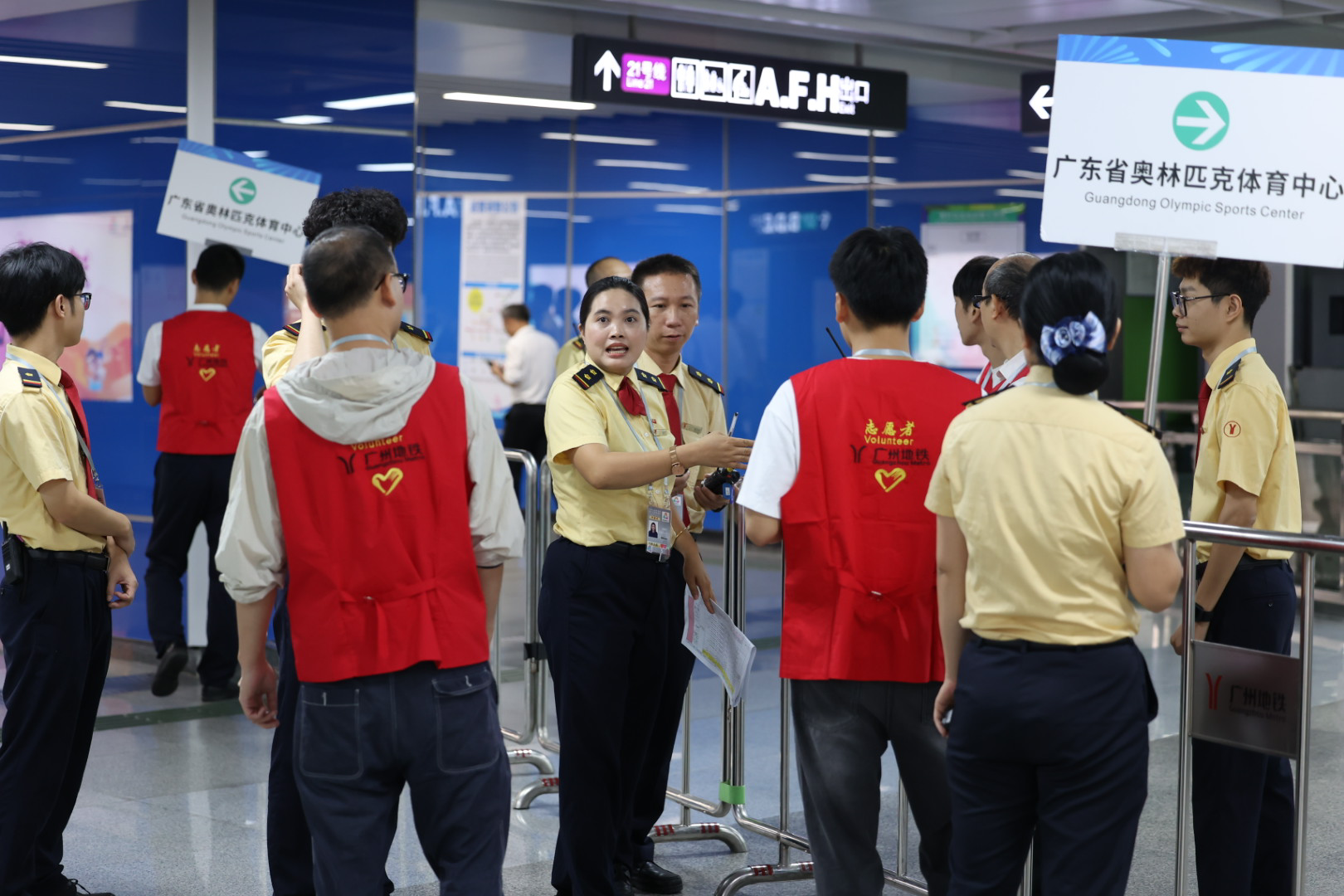 10:25,广州地铁黄村站,地铁工作人员为专列疏运,在车站内关键部位做好人力部署,培训各岗位及志愿者熟悉引导路线及工作内容。