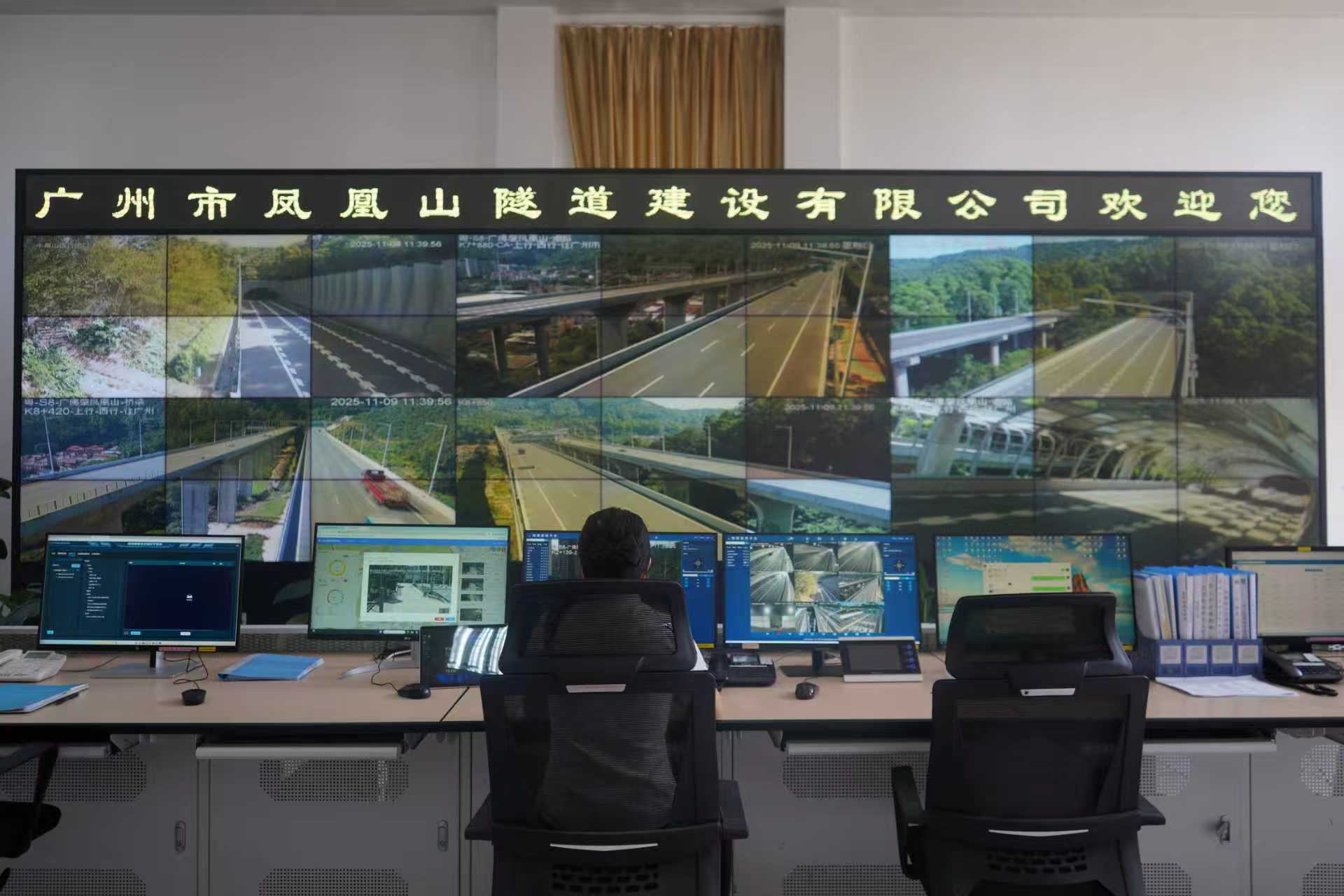 10:30,在广州市凤凰山隧道建设有限公司监控中心,监控员密切关注监控大屏路况信息,认真观察着沿线桥隧、道路及收费广场车辆动态和异常情况,及时做好信息报送和对外沟通,为维护赛事期间路段安全顺畅打下坚实基础。