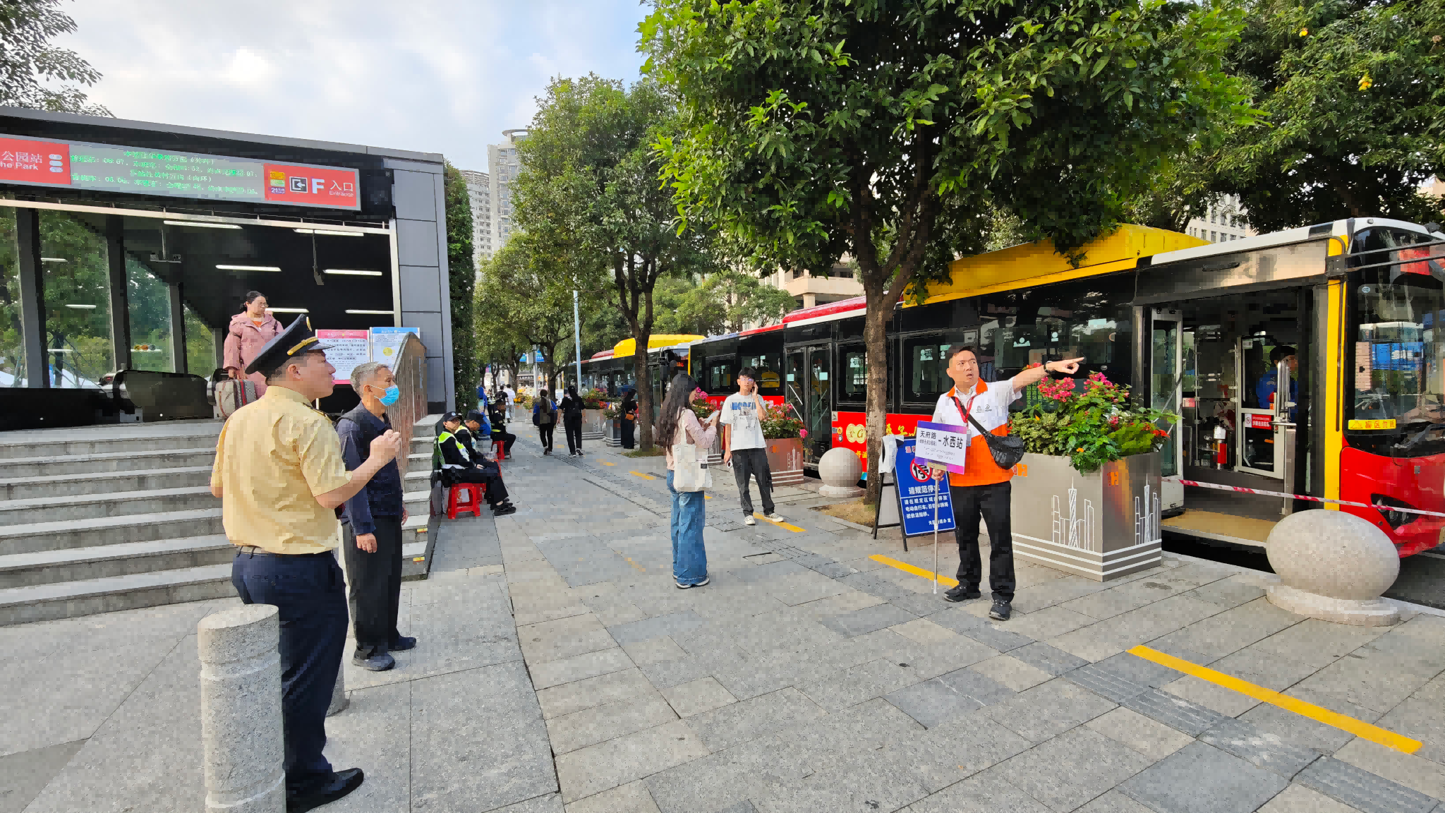 地铁天河公园站,广州巴士集团“天府路-水西站”接驳专线,调度员为市民乘客提供导乘指引。