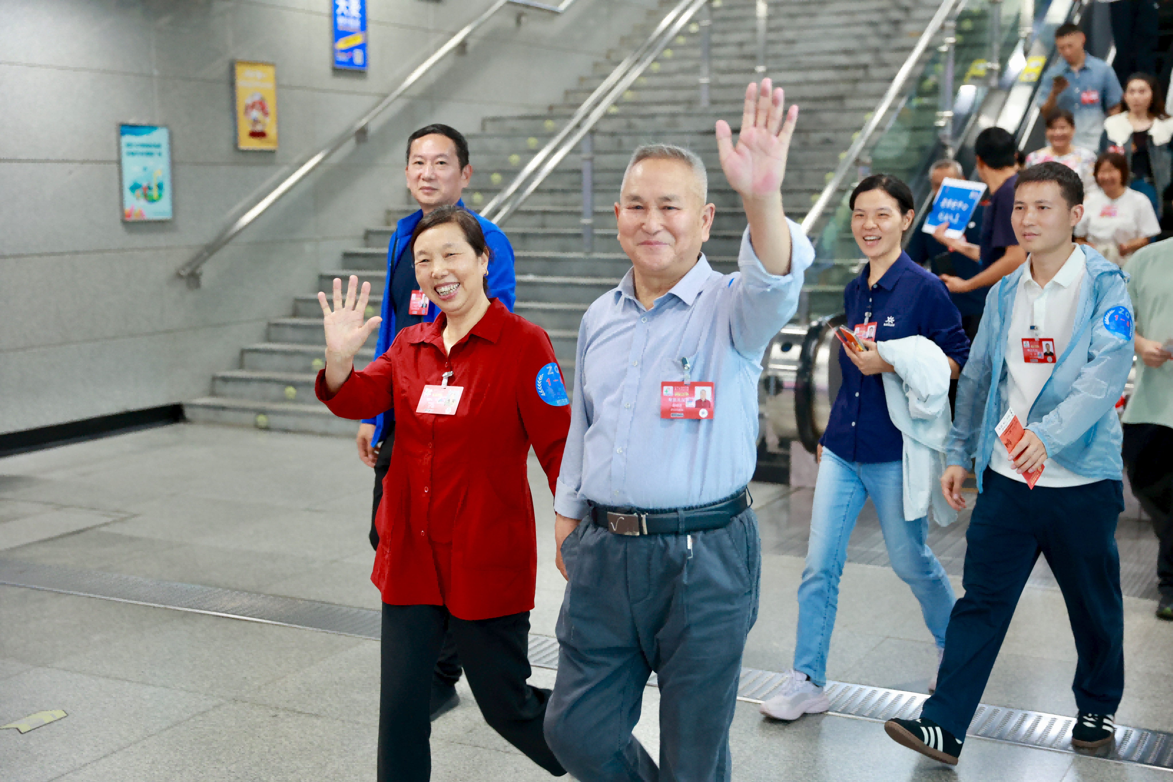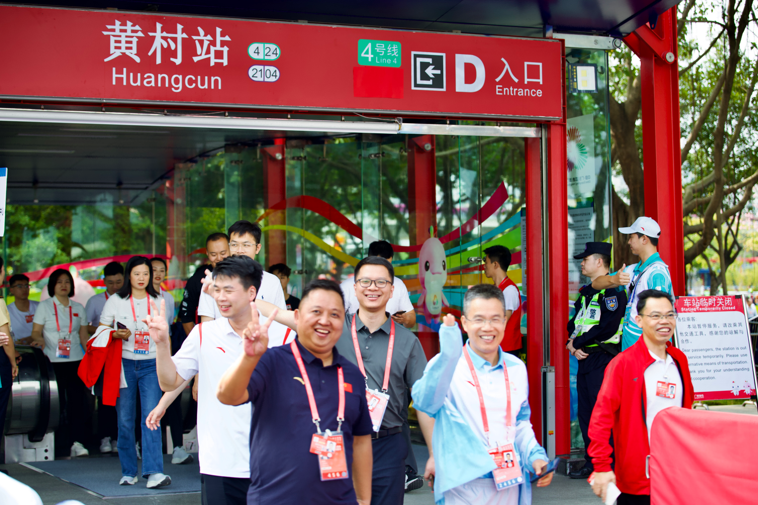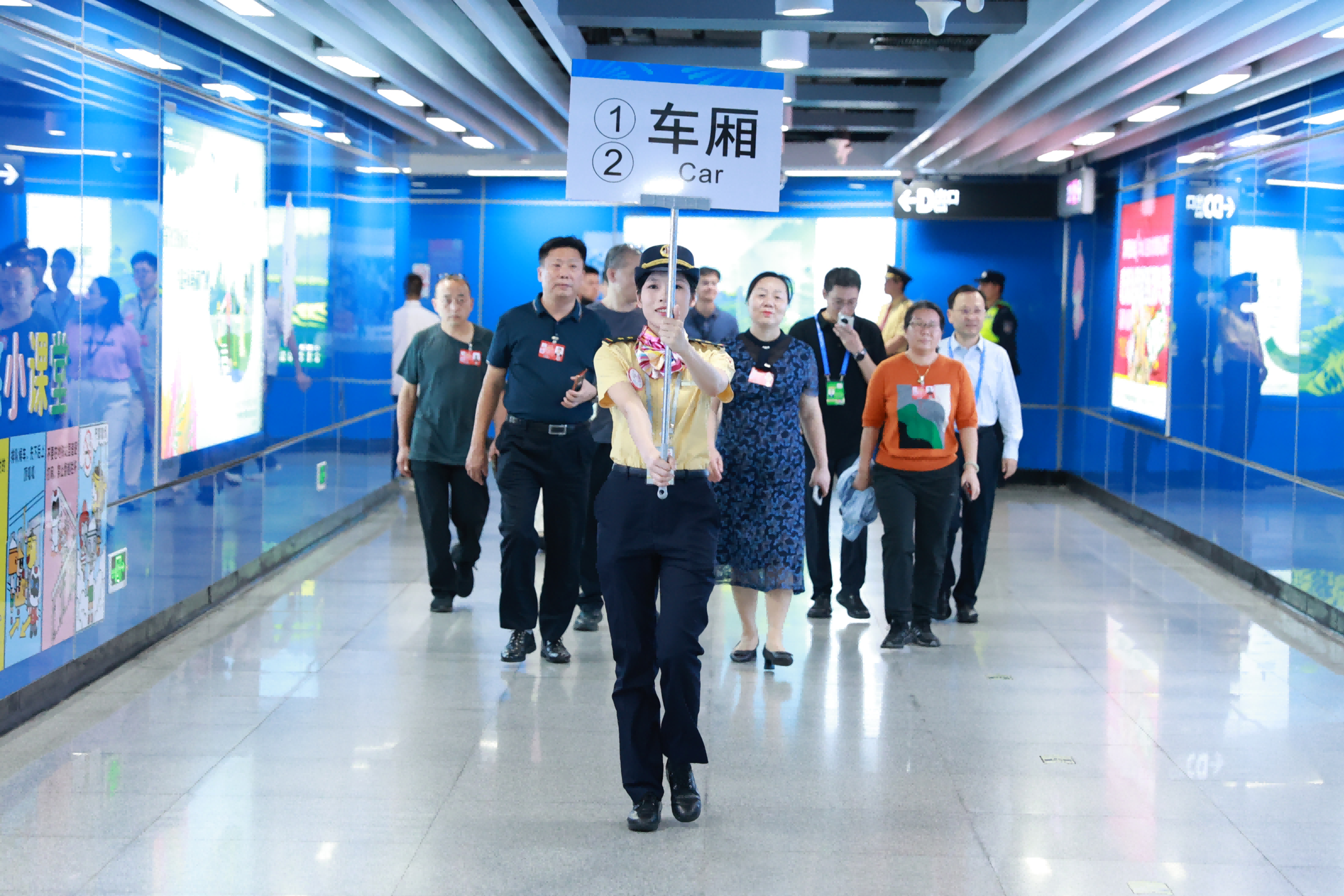 15:10,苏元站第一批40人乘客进站。广州地铁“明星服务队”站务人员举牌,将乘客引向专列车厢。