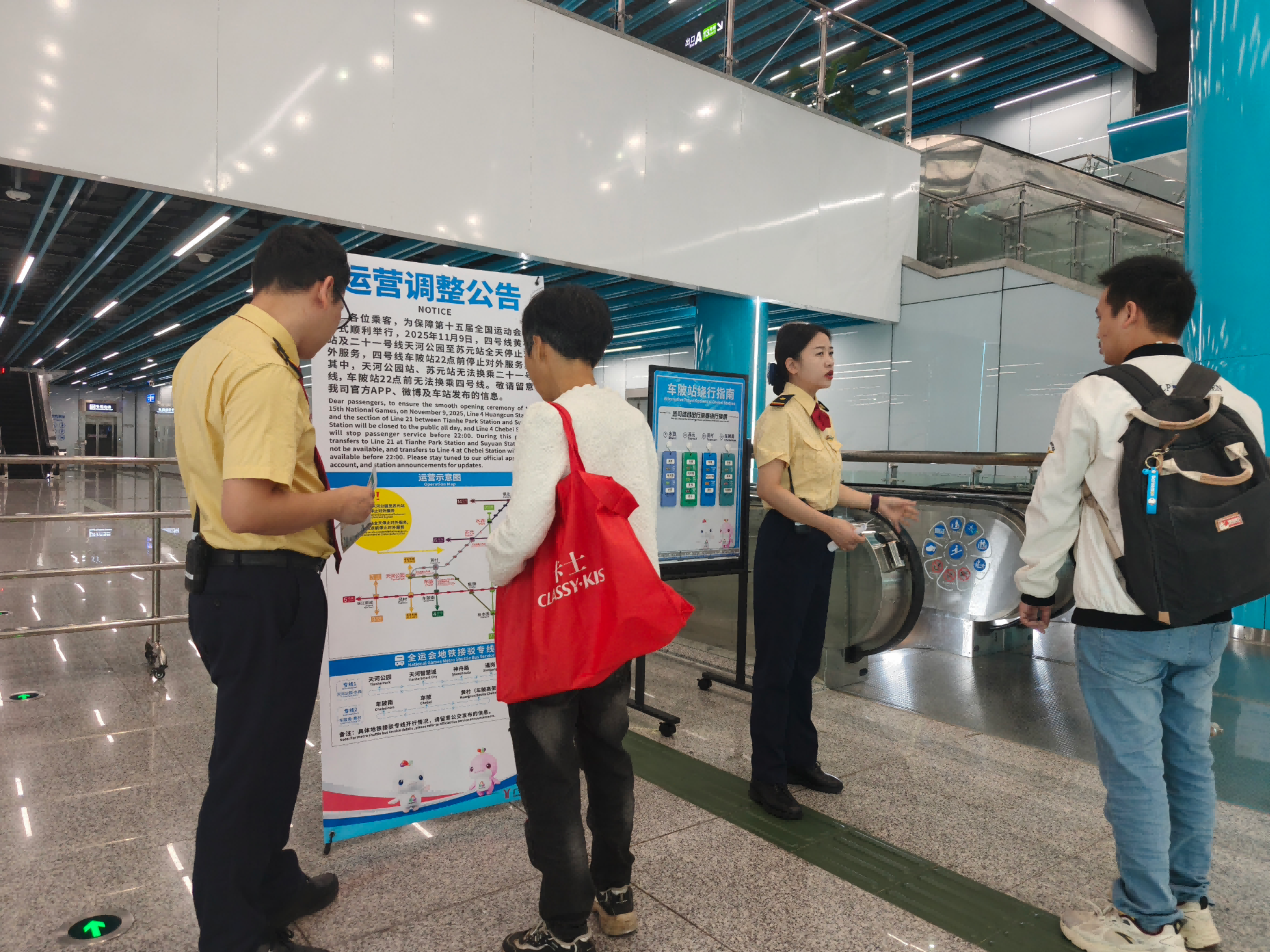 8:03,广州地铁车陂站13号线换乘通道,工作人员耐心解答4号线停运问题,指引乘客通过地铁绕行、公交专线等方式调整出行方式。